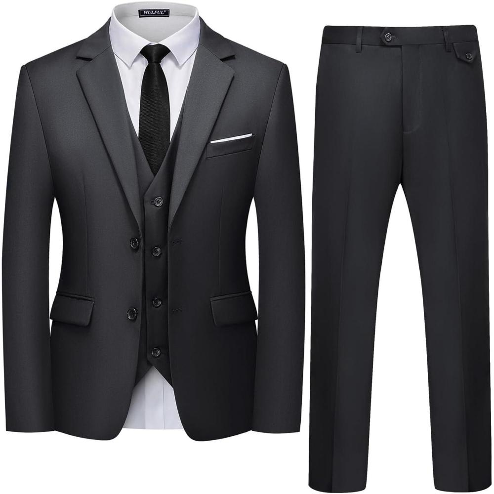 WULFUL Men's 3 Piece Slim Fit Suit Set Two Button Blazer Jacket Vest Pants Tuxedo Set for Party, Wedding and Business(Dark Grey)