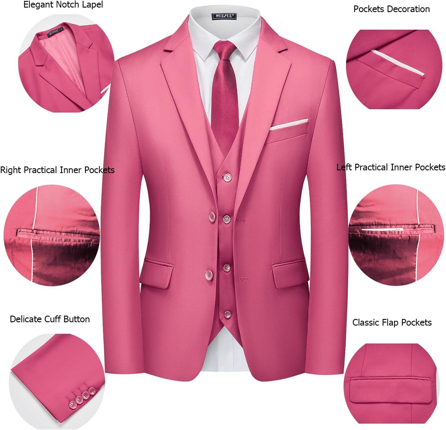 WULFUL Men's 3 Piece Slim Fit Suit Set Two Button Blazer Jacket Vest Pants Tuxedo Set for Party, Wedding and Business(Pink)