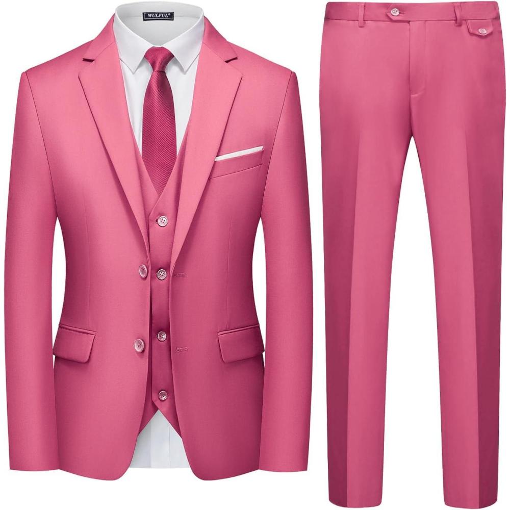 WULFUL Men’s 3 Piece Slim Fit Suit Set Two Button Blazer Jacket Vest Pants Tuxedo Set for Party, Wedding and Business(Pink)