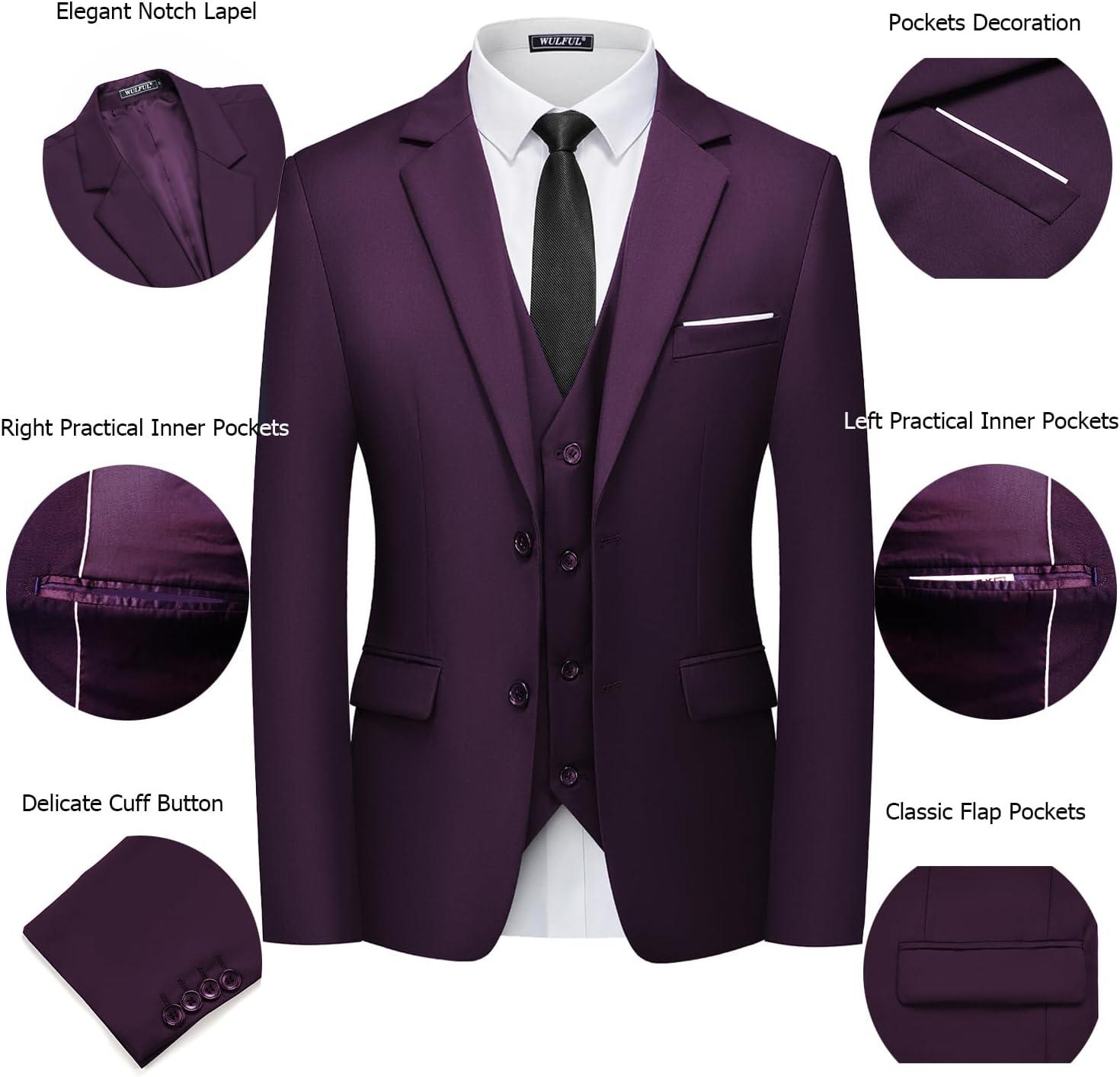 WULFUL Men's 3 Piece Slim Fit Suit Set Two Button Blazer Jacket Vest Pants Tuxedo Set for Party, Wedding and Business(Purple)