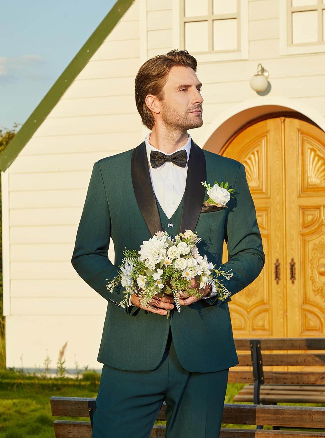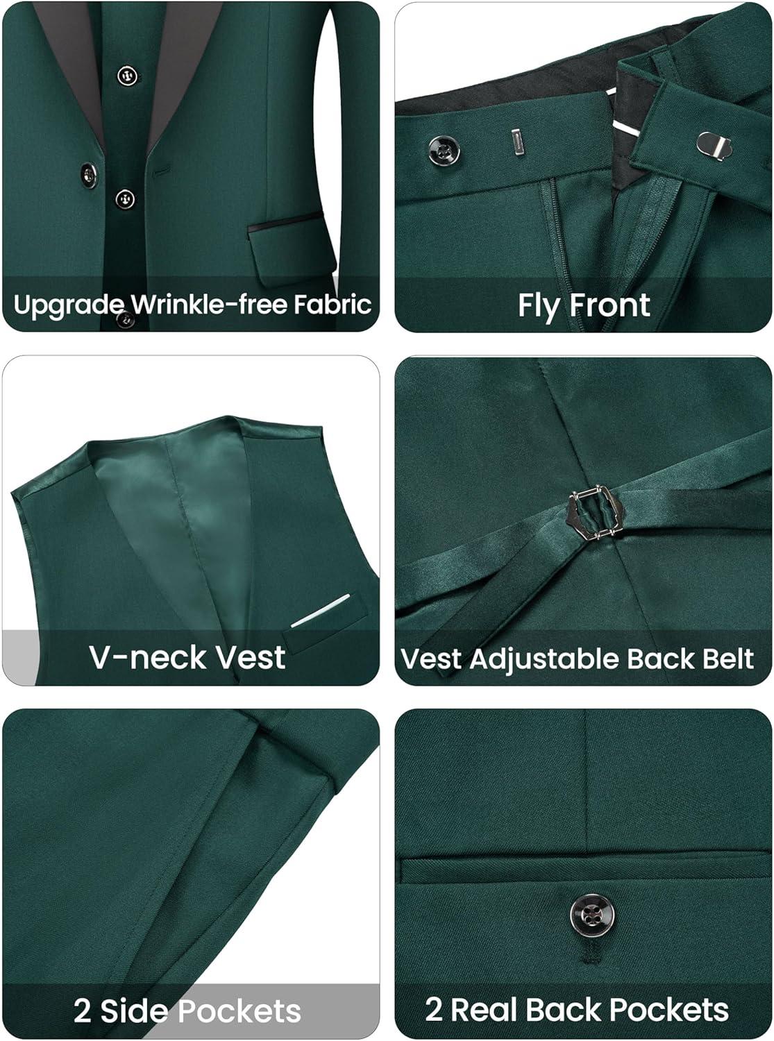 WULFUL Men's 3 Piece Suits Slim Fit Tuxedo Suit Set One Button Shawl Lapel Blazer Jacket Vest Pants Set for Prom, Business(Dark Green)