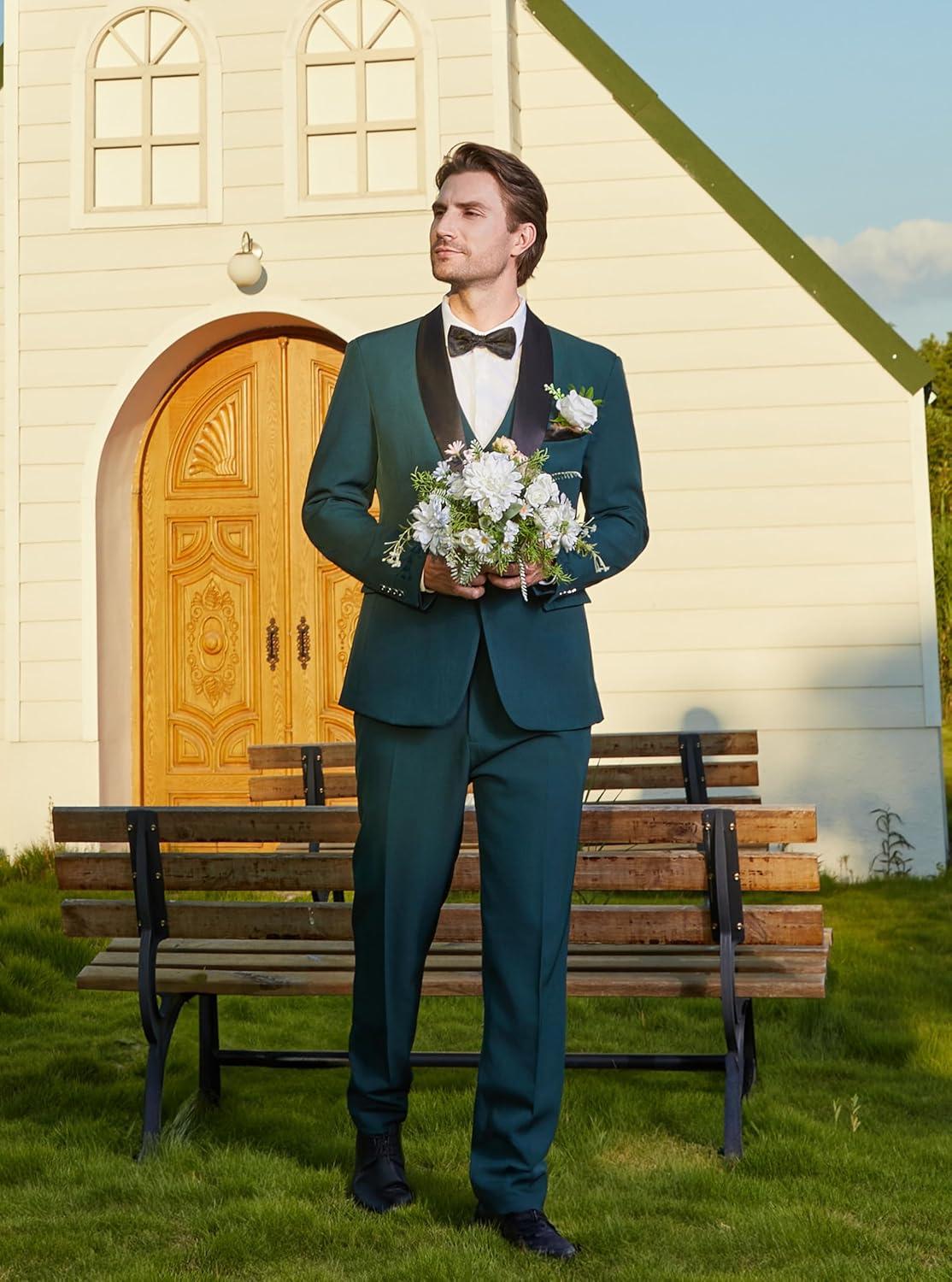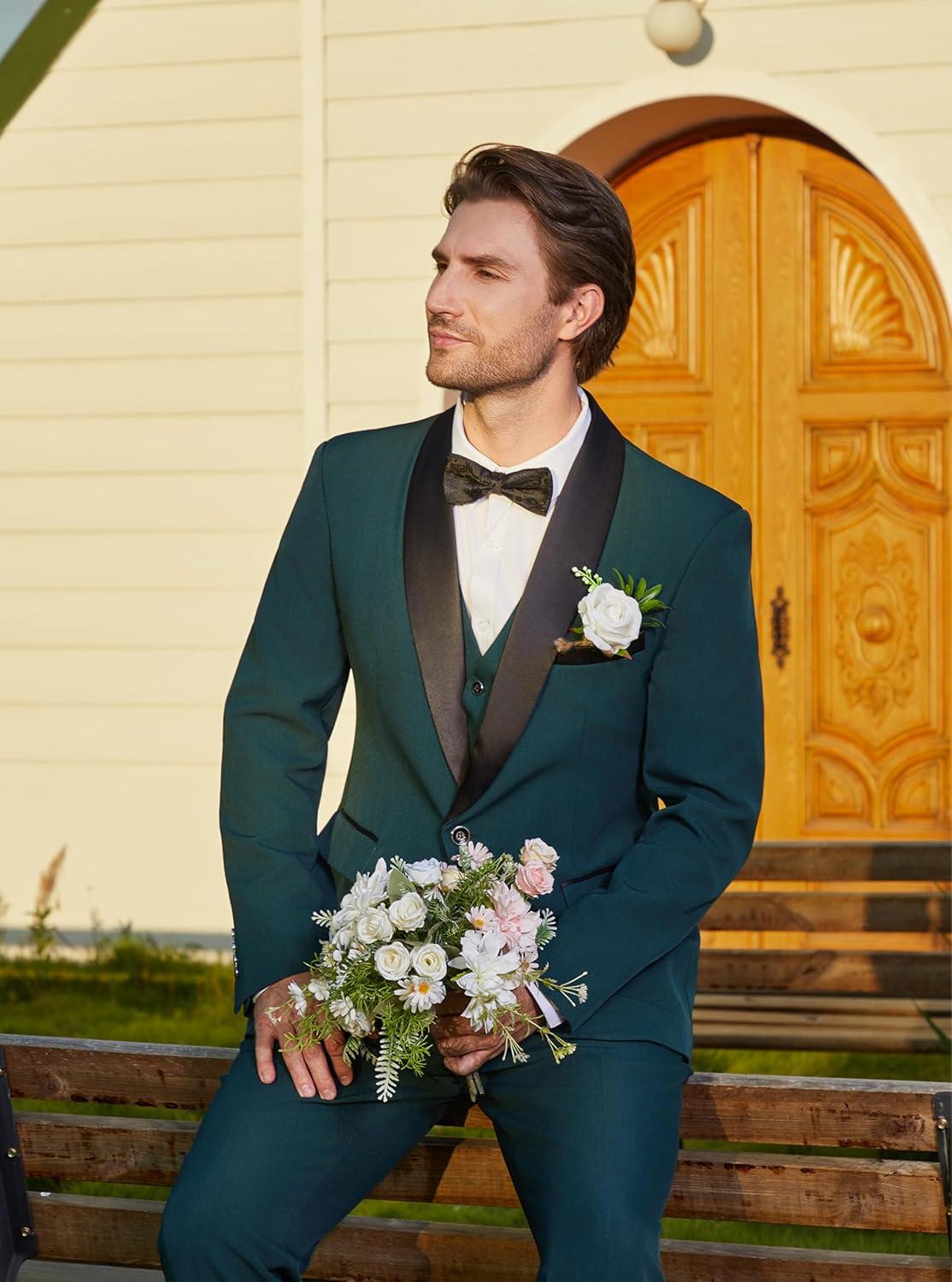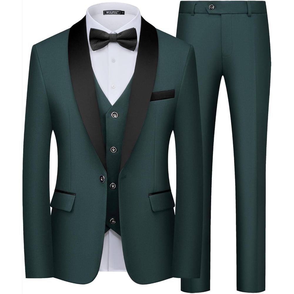 WULFUL Men’s 3 Piece Suits Slim Fit Tuxedo Suit Set One Button Shawl Lapel Blazer Jacket Vest Pants Set for Prom, Business(Dark Green)