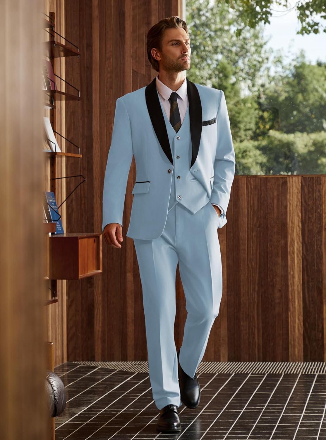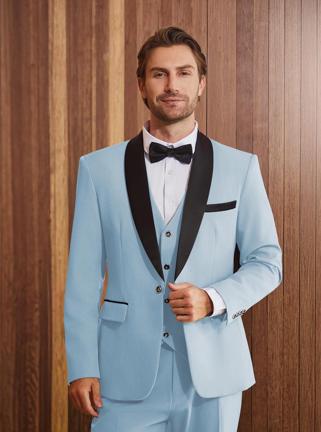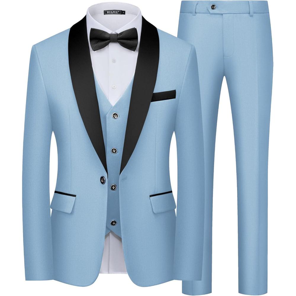 WULFUL Men's 3 Piece Suits Slim Fit Tuxedo Suit Set One Button Shawl Lapel Blazer Jacket Vest Pants Set for Prom, Business(Light Blue)