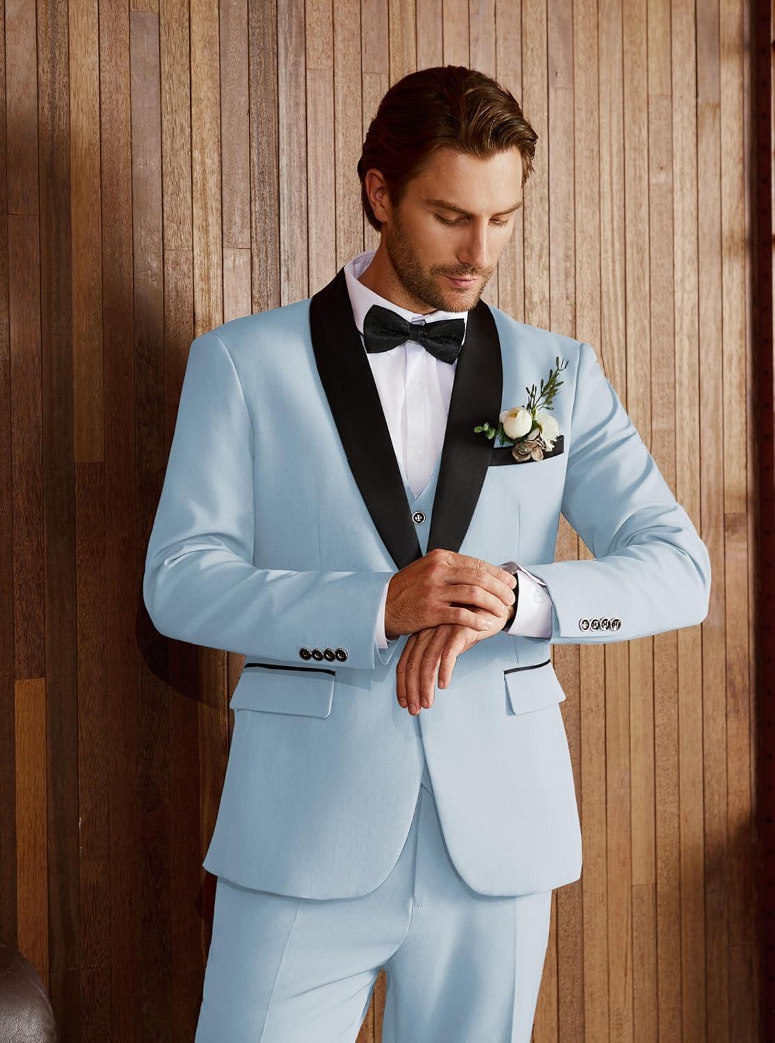 WULFUL Men’s 3 Piece Suits Slim Fit Tuxedo Suit Set One Button Shawl Lapel Blazer Jacket Vest Pants Set for Prom, Business(Light Blue)