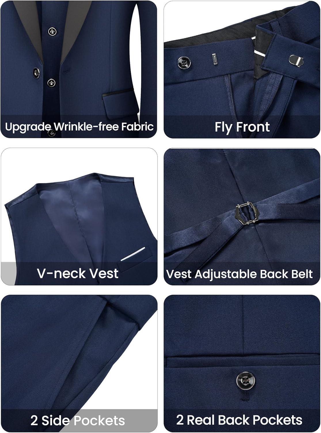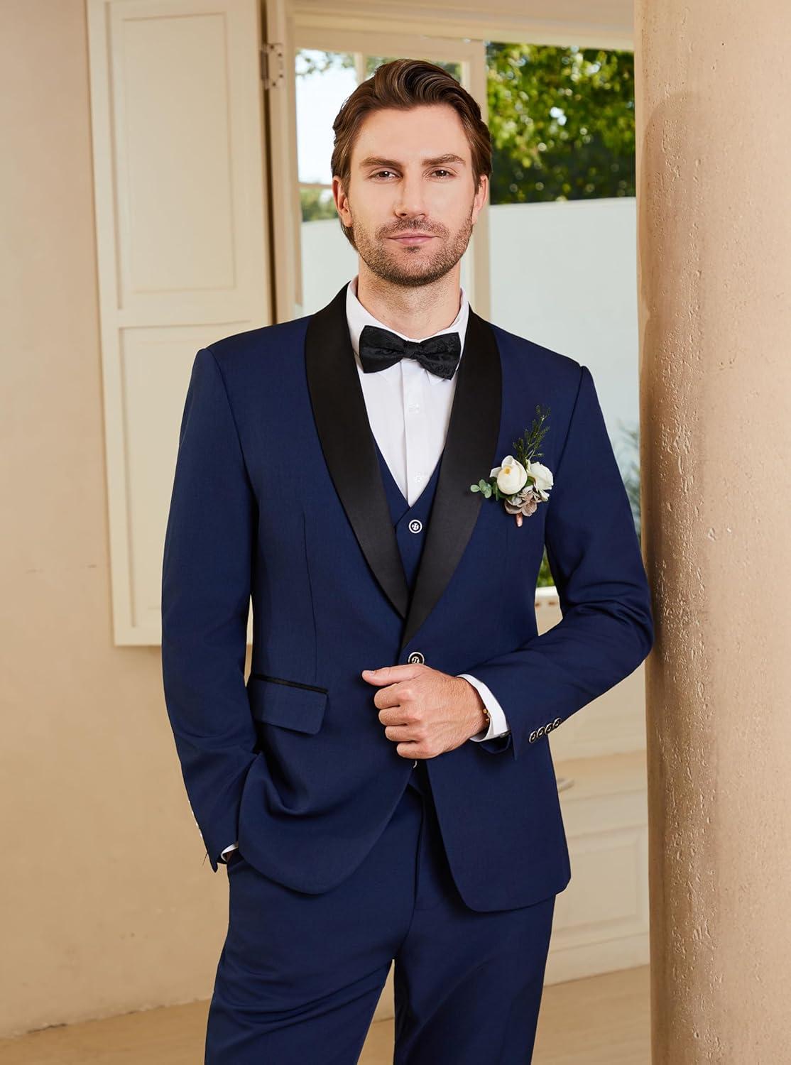 WULFUL Men’s 3 Piece Suits Slim Fit Tuxedo Suit Set One Button Shawl Lapel Blazer Jacket Vest Pants Set for Prom, Business(Navy)