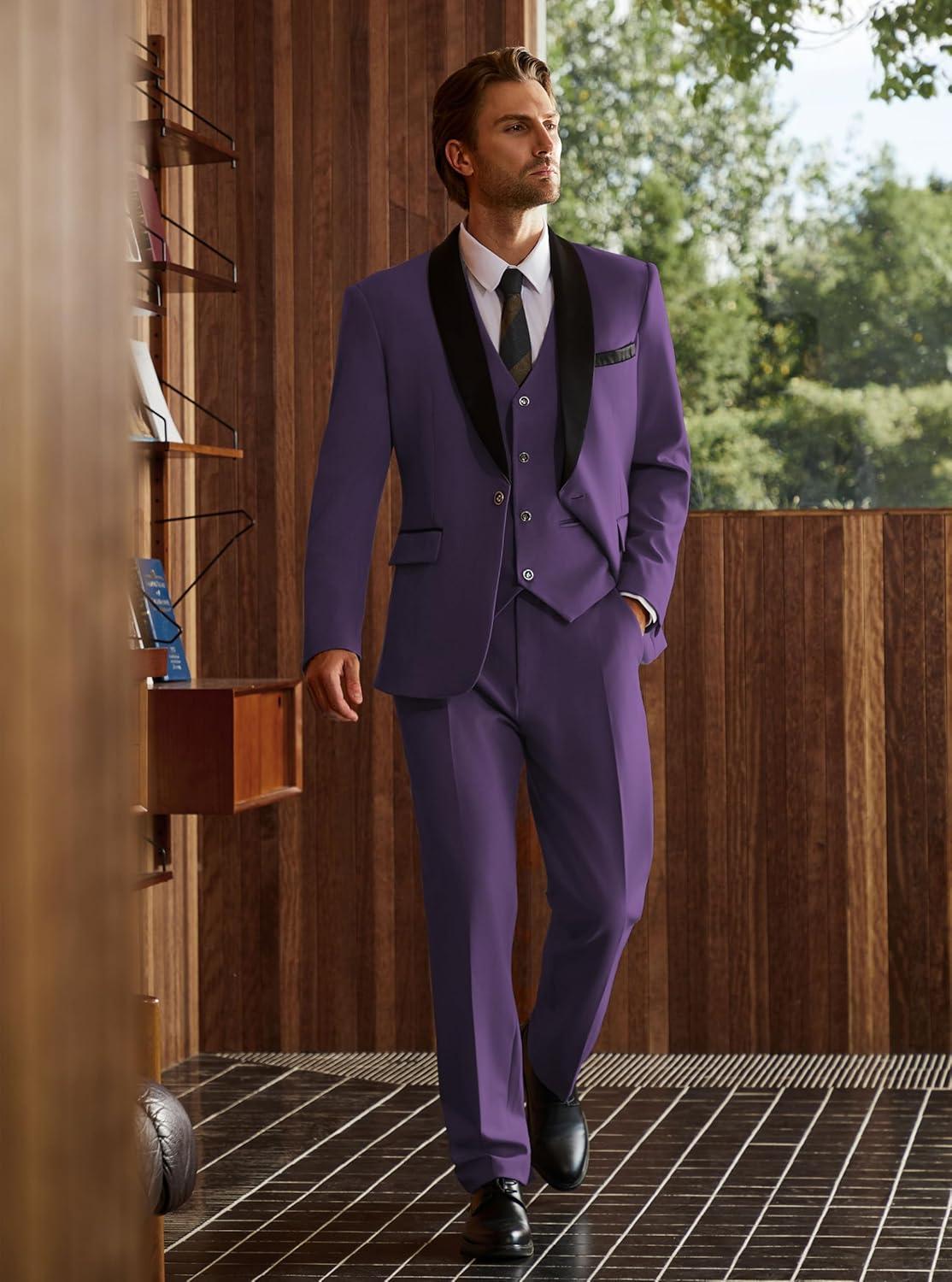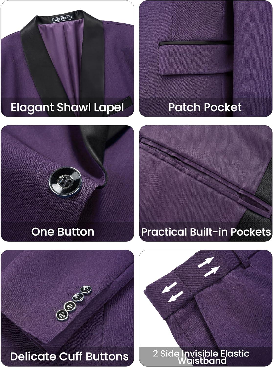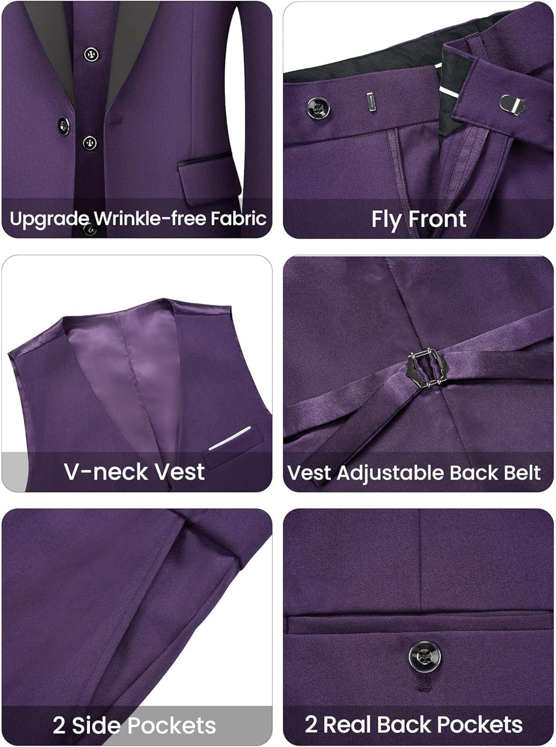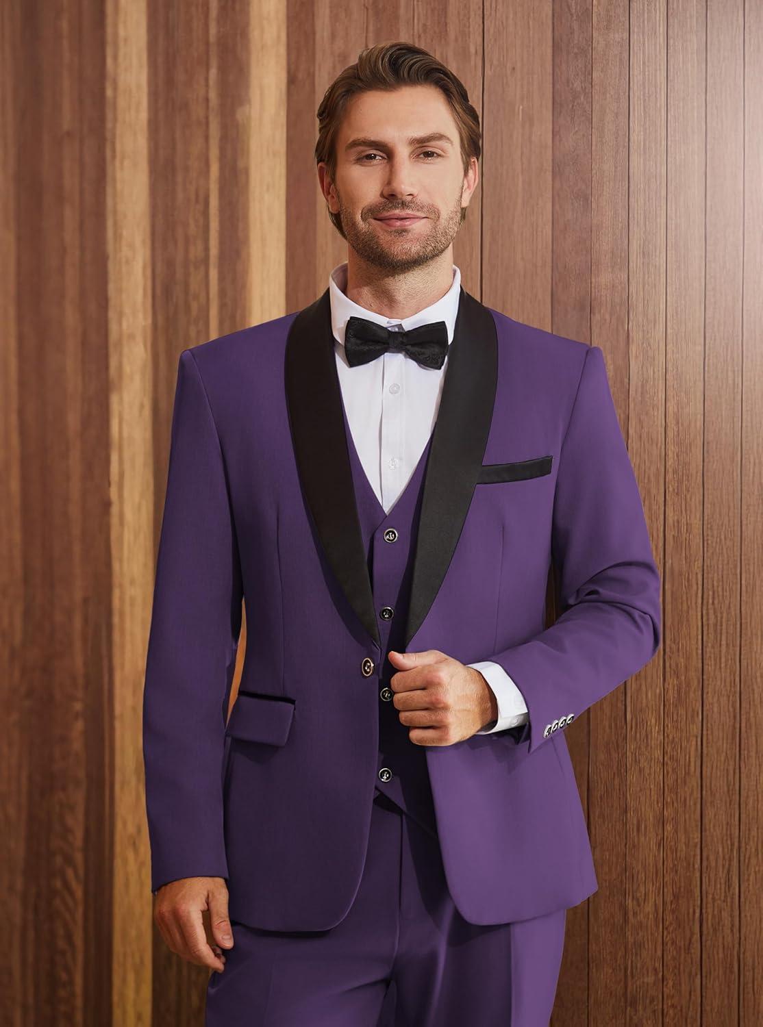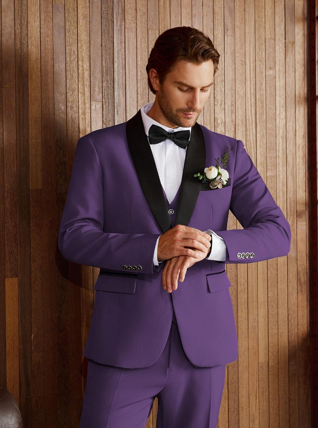 WULFUL Men's 3 Piece Suits Slim Fit Tuxedo Suit Set One Button Shawl Lapel Blazer Jacket Vest Pants Set for Prom, Business(Purple)
