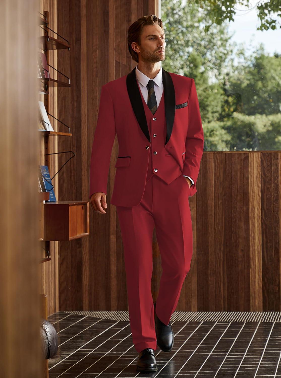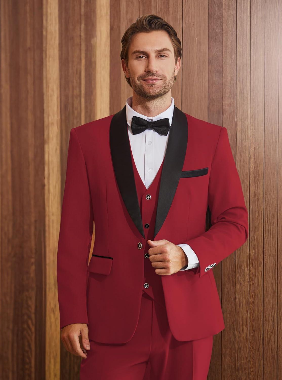 WULFUL Men's 3 Piece Suits Slim Fit Tuxedo Suit Set One Button Shawl Lapel Blazer Jacket Vest Pants Set for Prom, Business(Red)