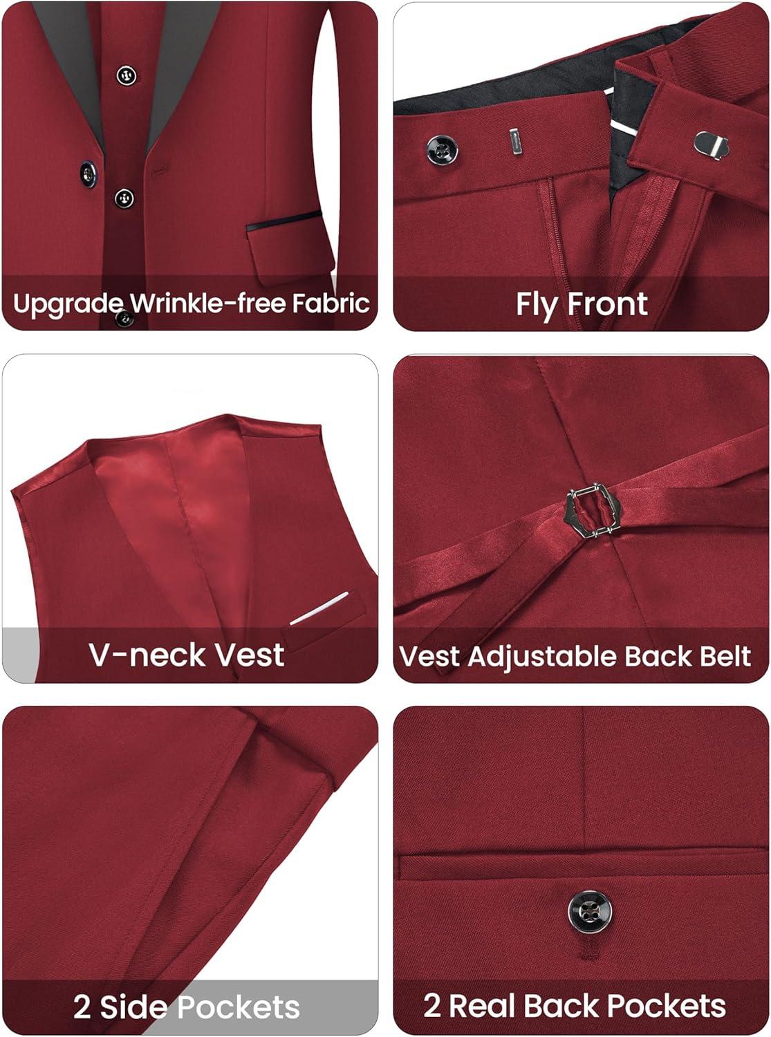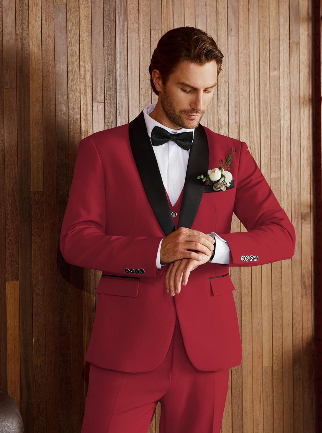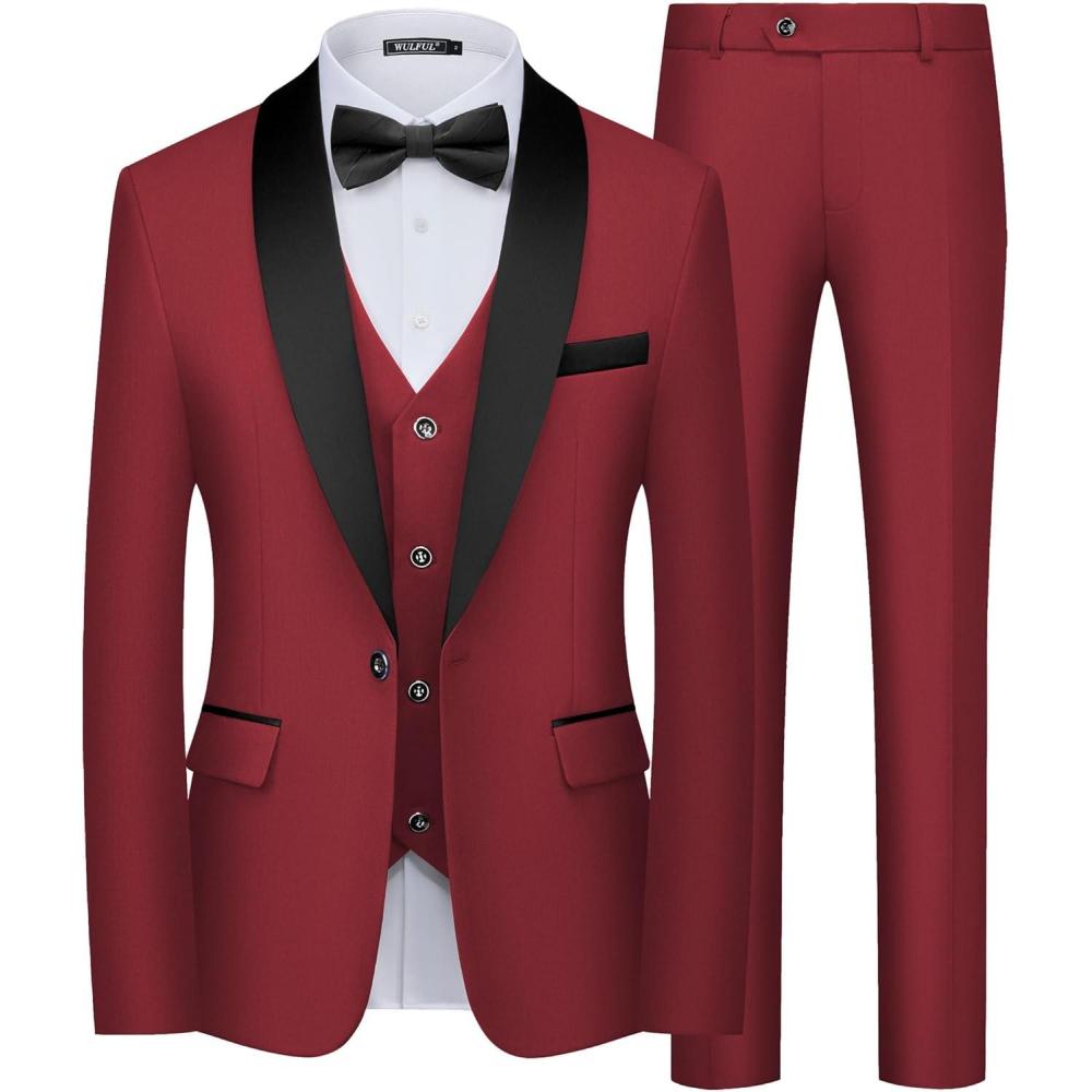 WULFUL Men’s 3 Piece Suits Slim Fit Tuxedo Suit Set One Button Shawl Lapel Blazer Jacket Vest Pants Set for Prom, Business(Red)