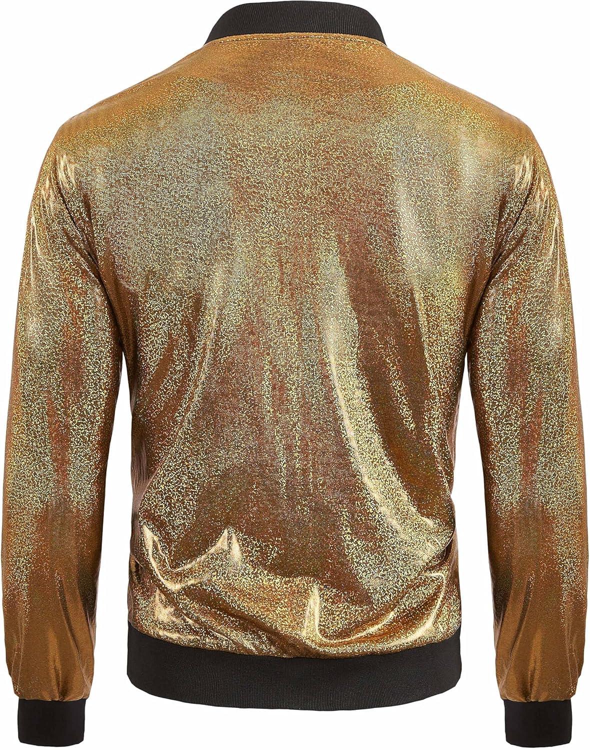 WULFUL Men's 70s Disco Costume Party Sequin Metallic Varsity Bomber Jacket(Gold02)