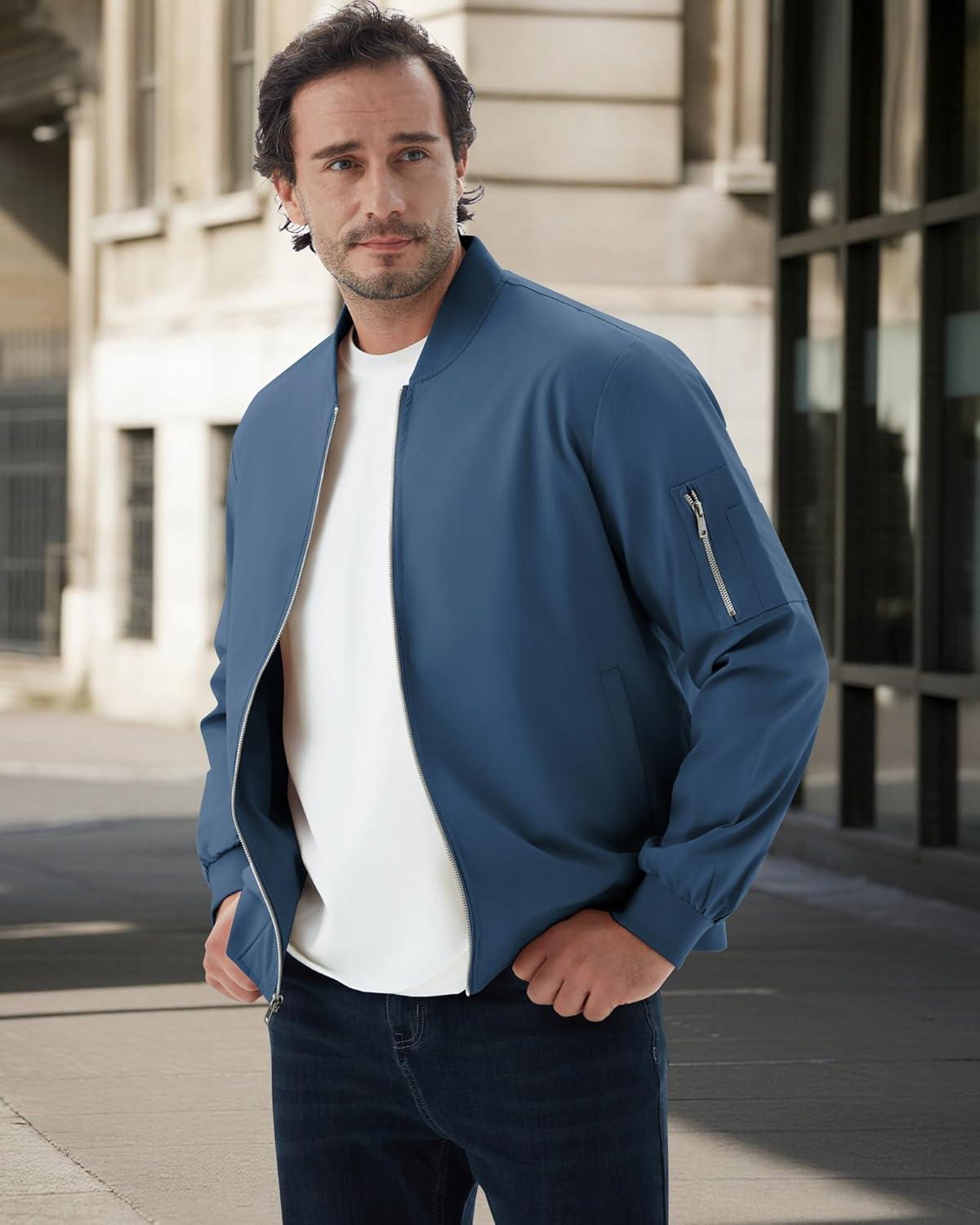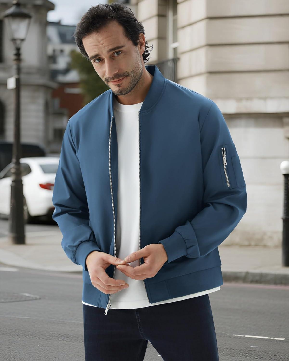 WULFUL Men's Bomber Jacket Lightweight Casual Windbreaker Zip Up Coat with Pocket(Blue)