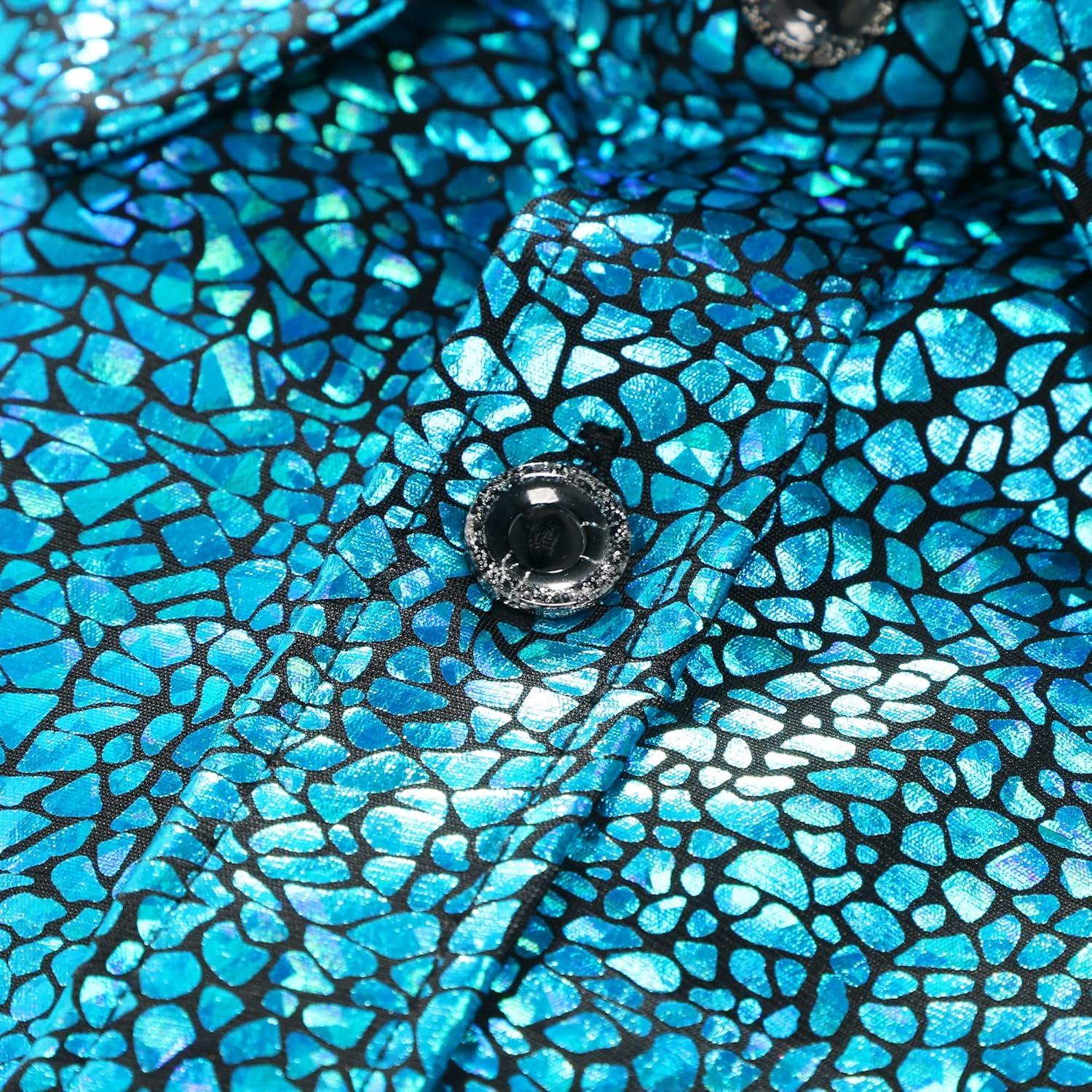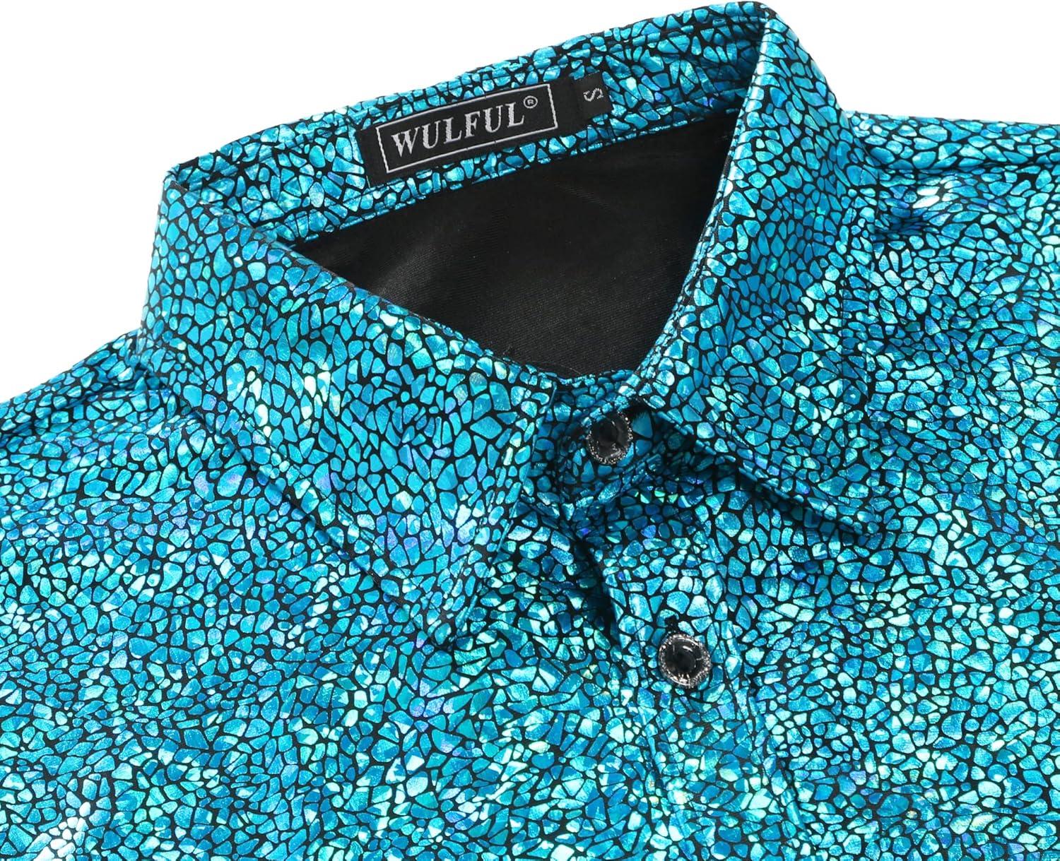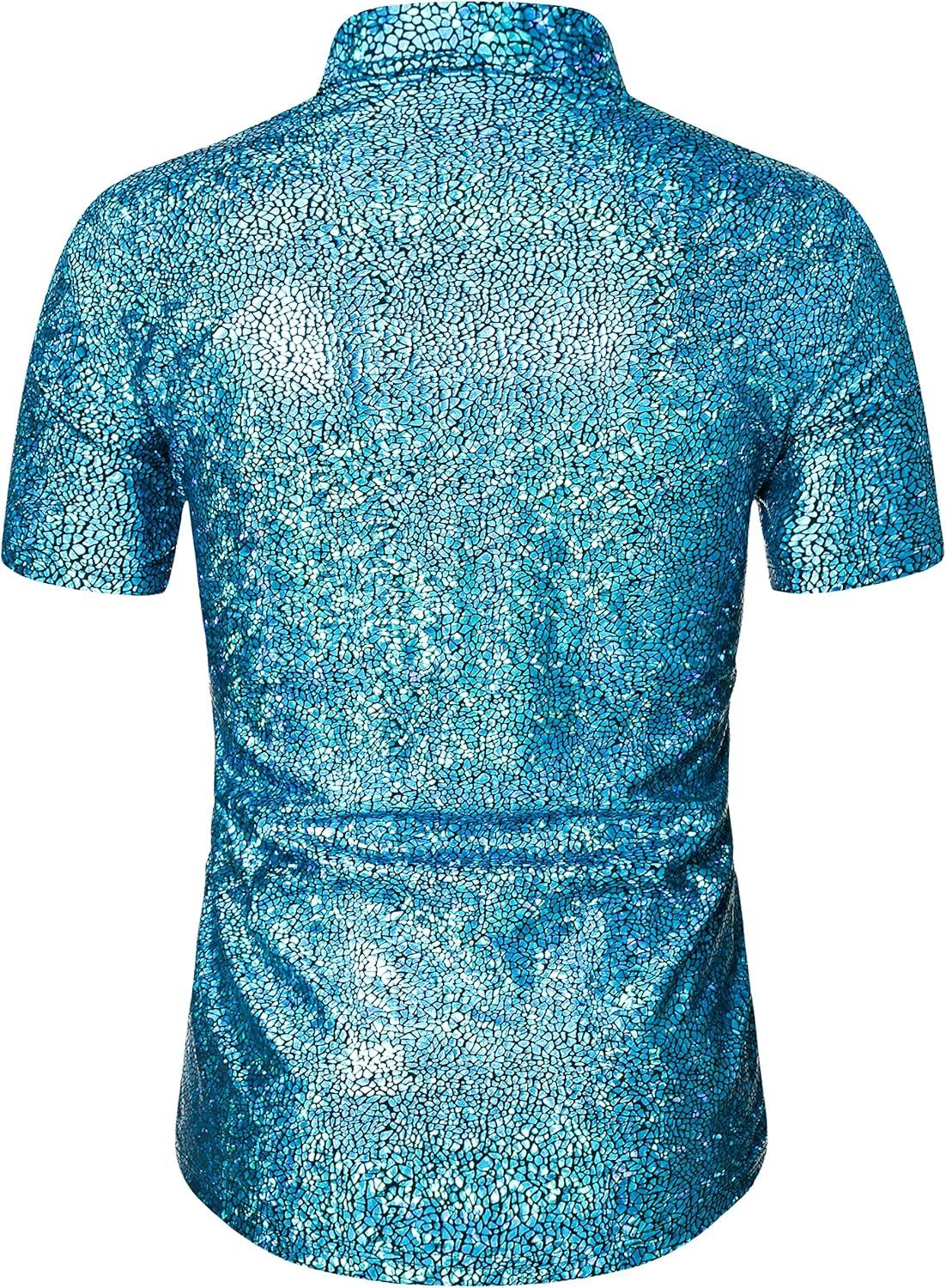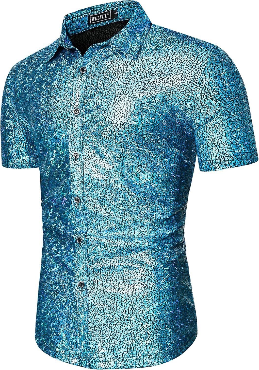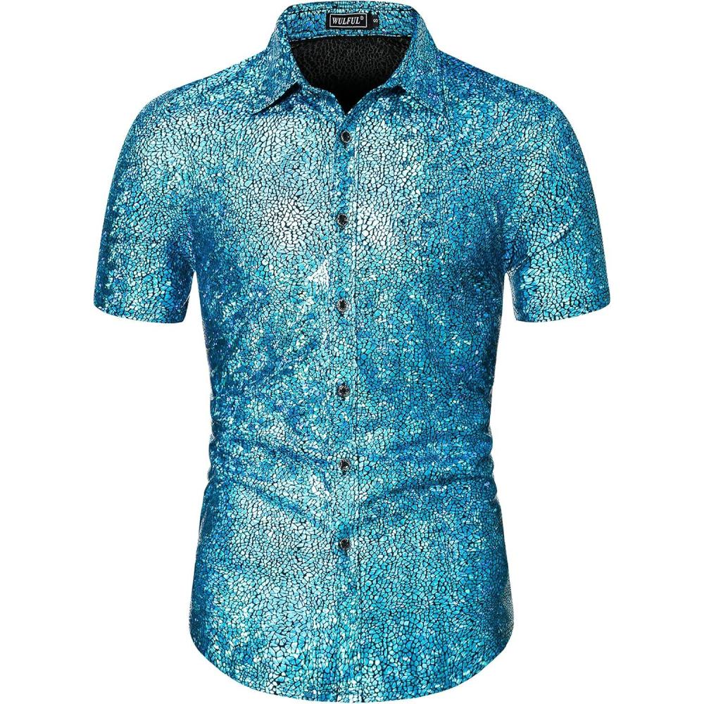 WULFUL Men's Disco Shirt Sequins Short Sleeve Button Down Shirts 70s Party Costume Dress Shirts(Blue0150)