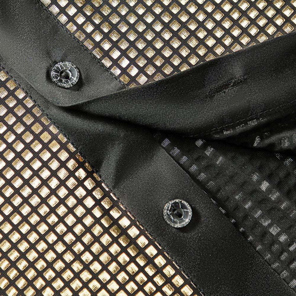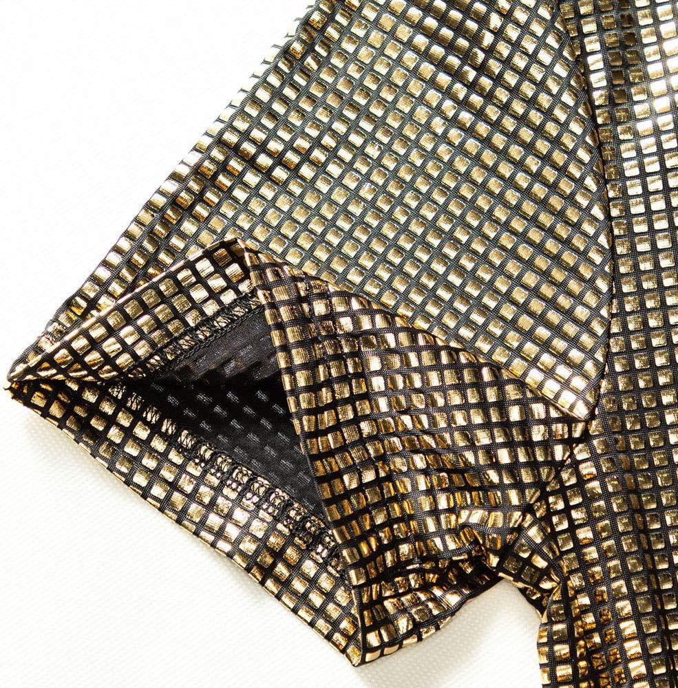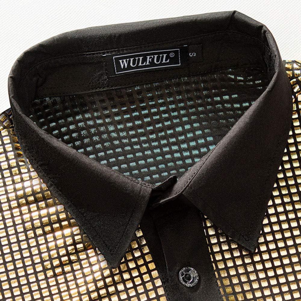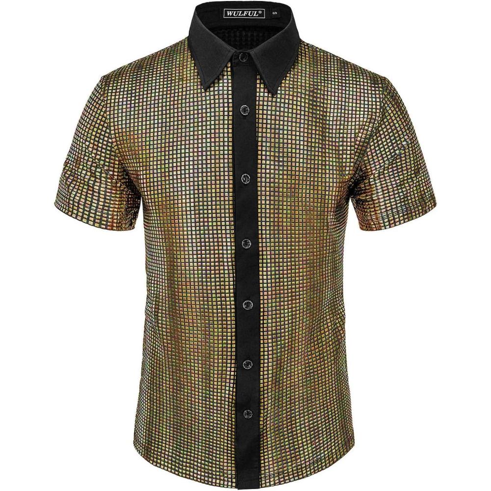 WULFUL Men's Disco Shirt Sequins Short Sleeve Button Down Shirts 70s Party Costume Dress Shirts(Gold)