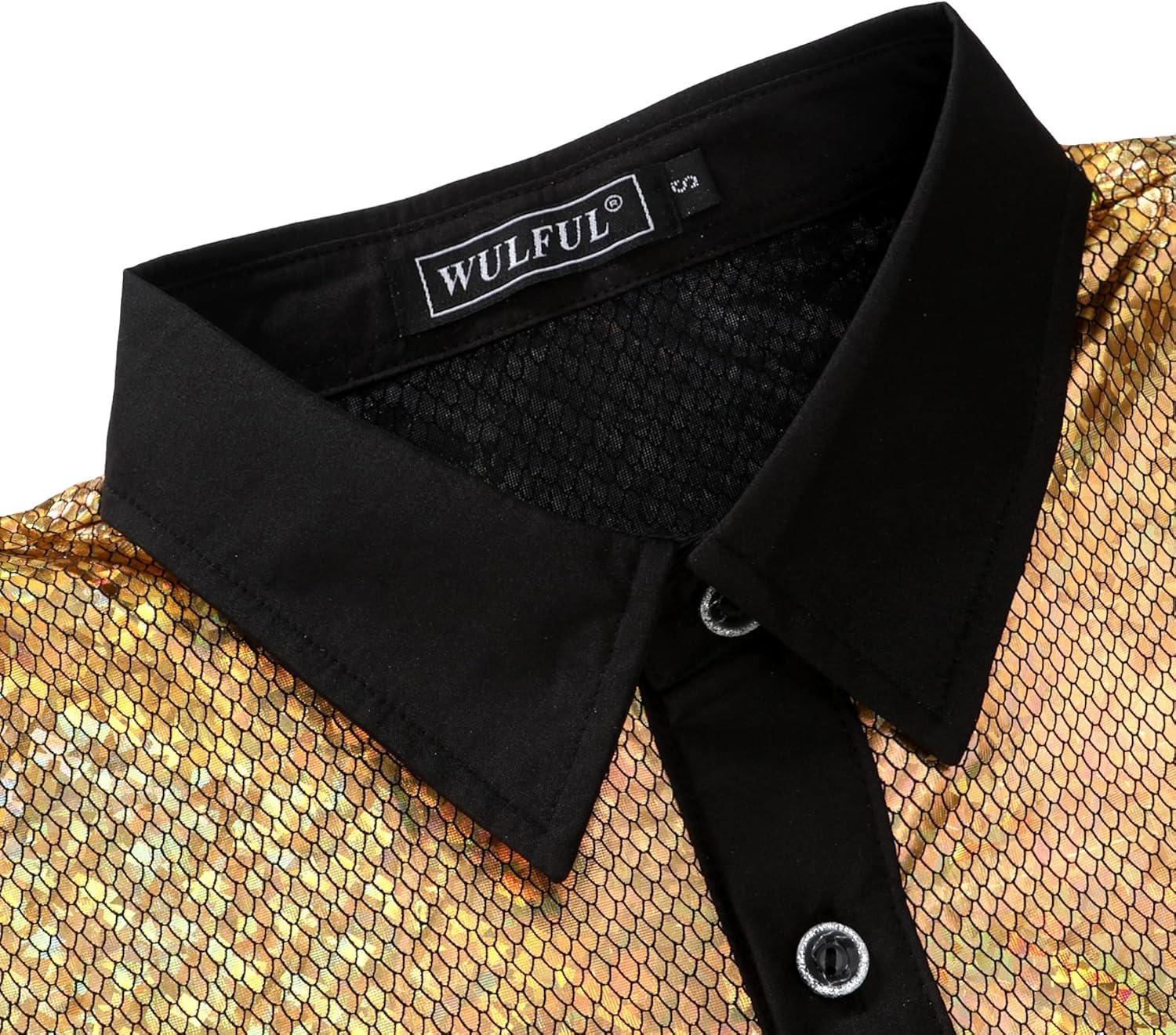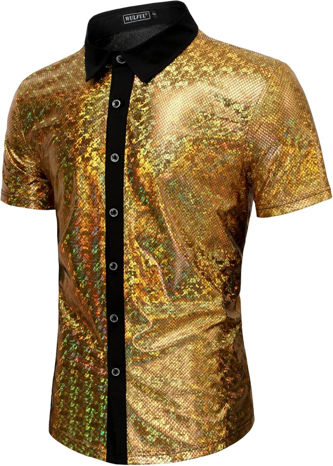 WULFUL Men's Disco Shirt Sequins Short Sleeve Button Down Shirts 70s Party Costume Dress Shirts(Gold053)