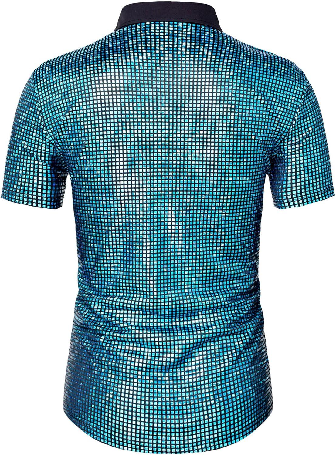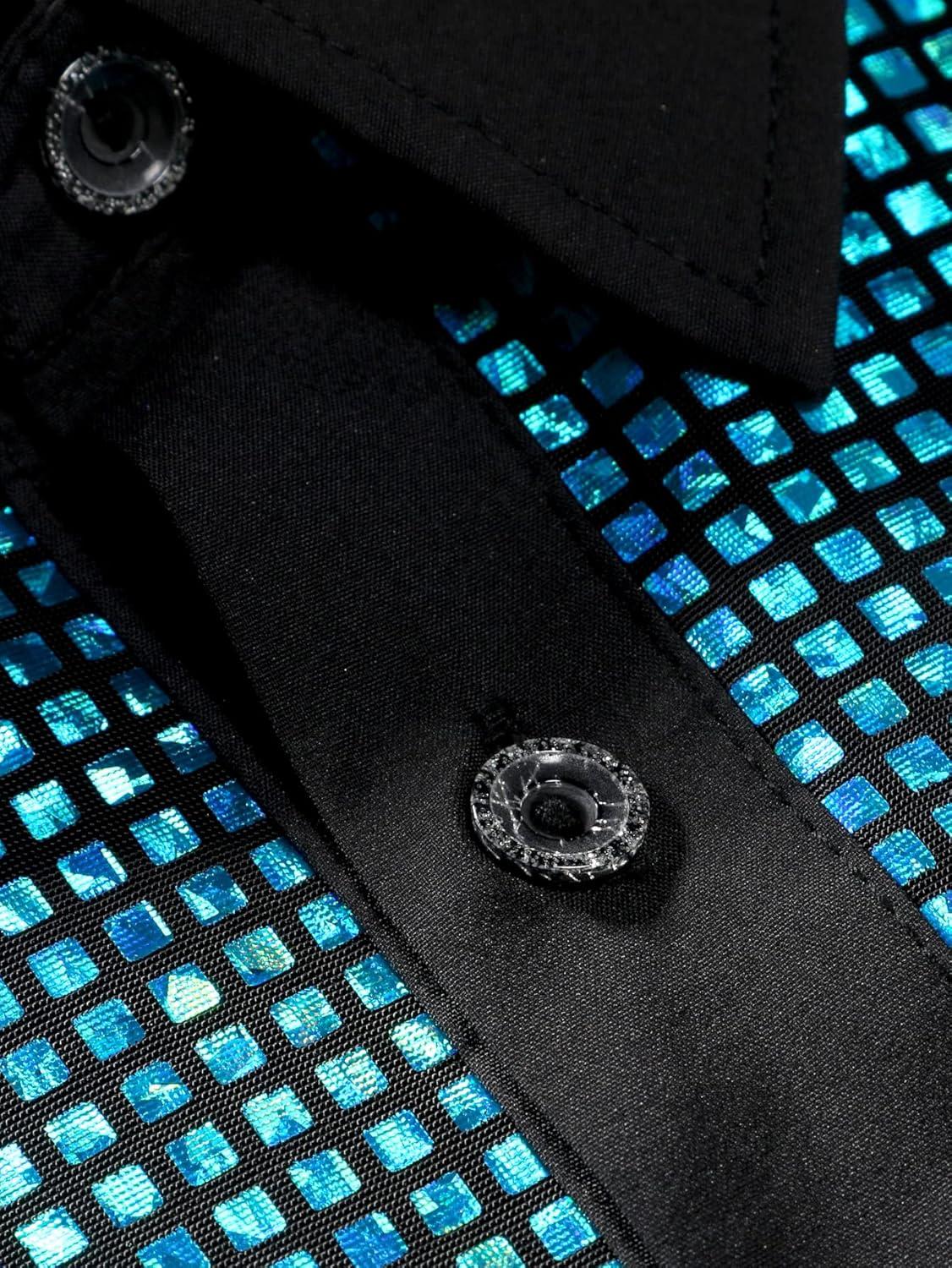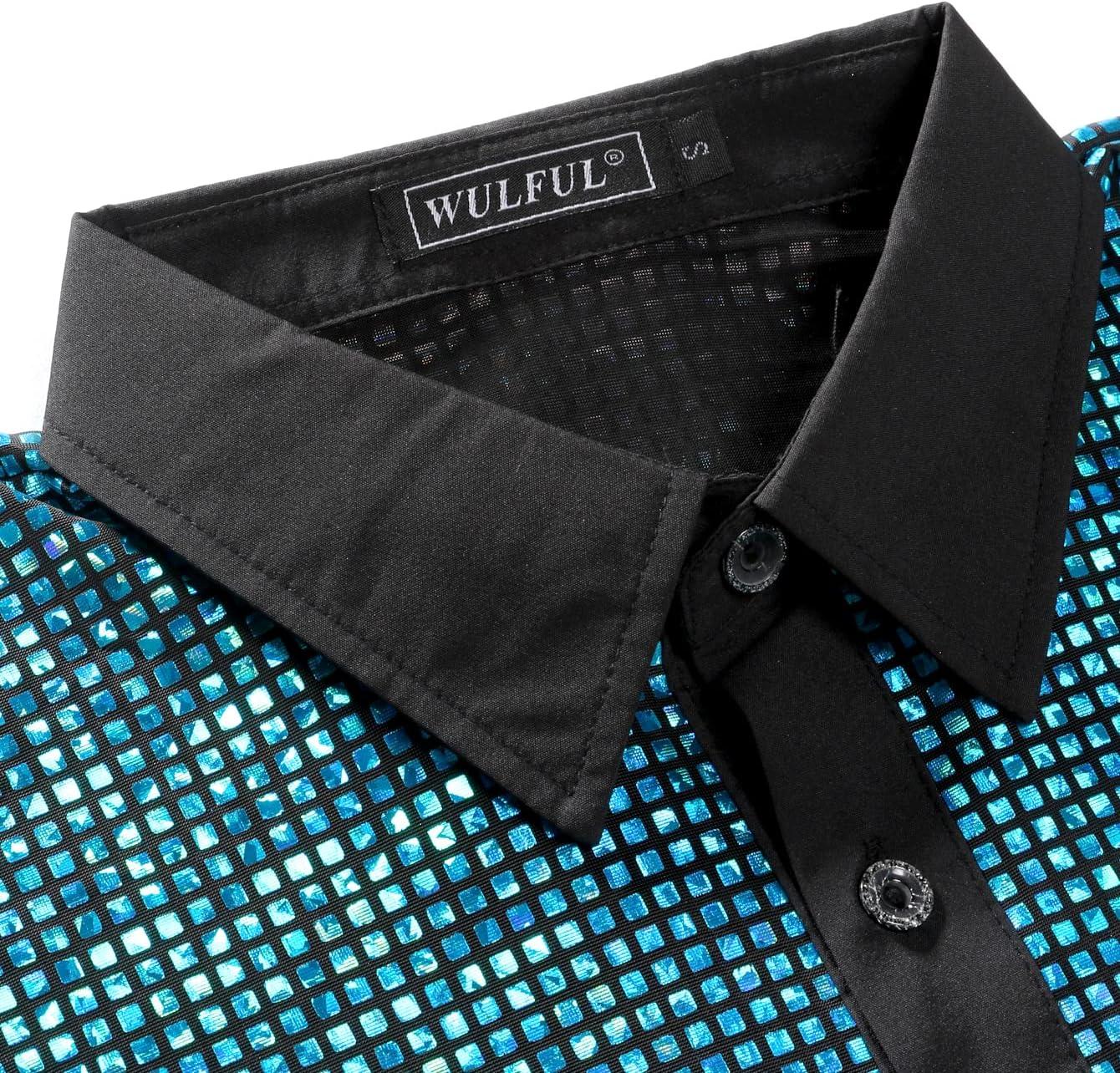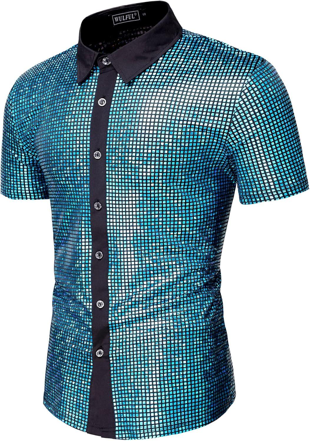 WULFUL Men's Disco Shirt Sequins Short Sleeve Button Down Shirts 70s Party Costume Dress Shirts(Lake Blue)