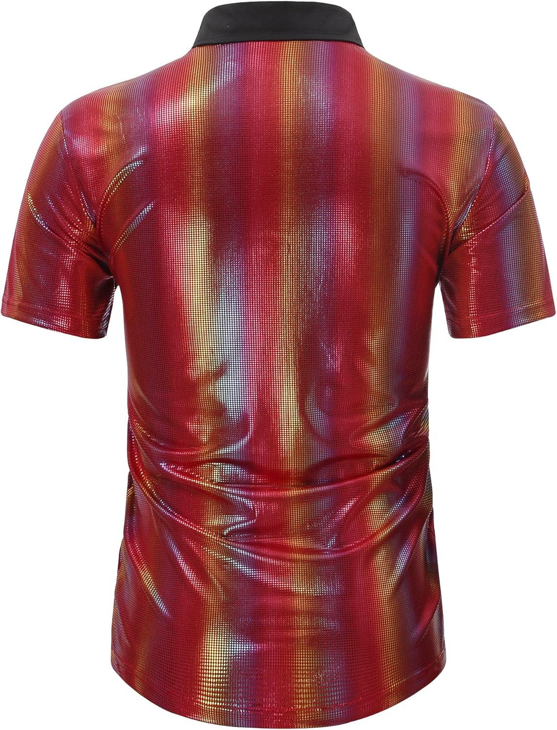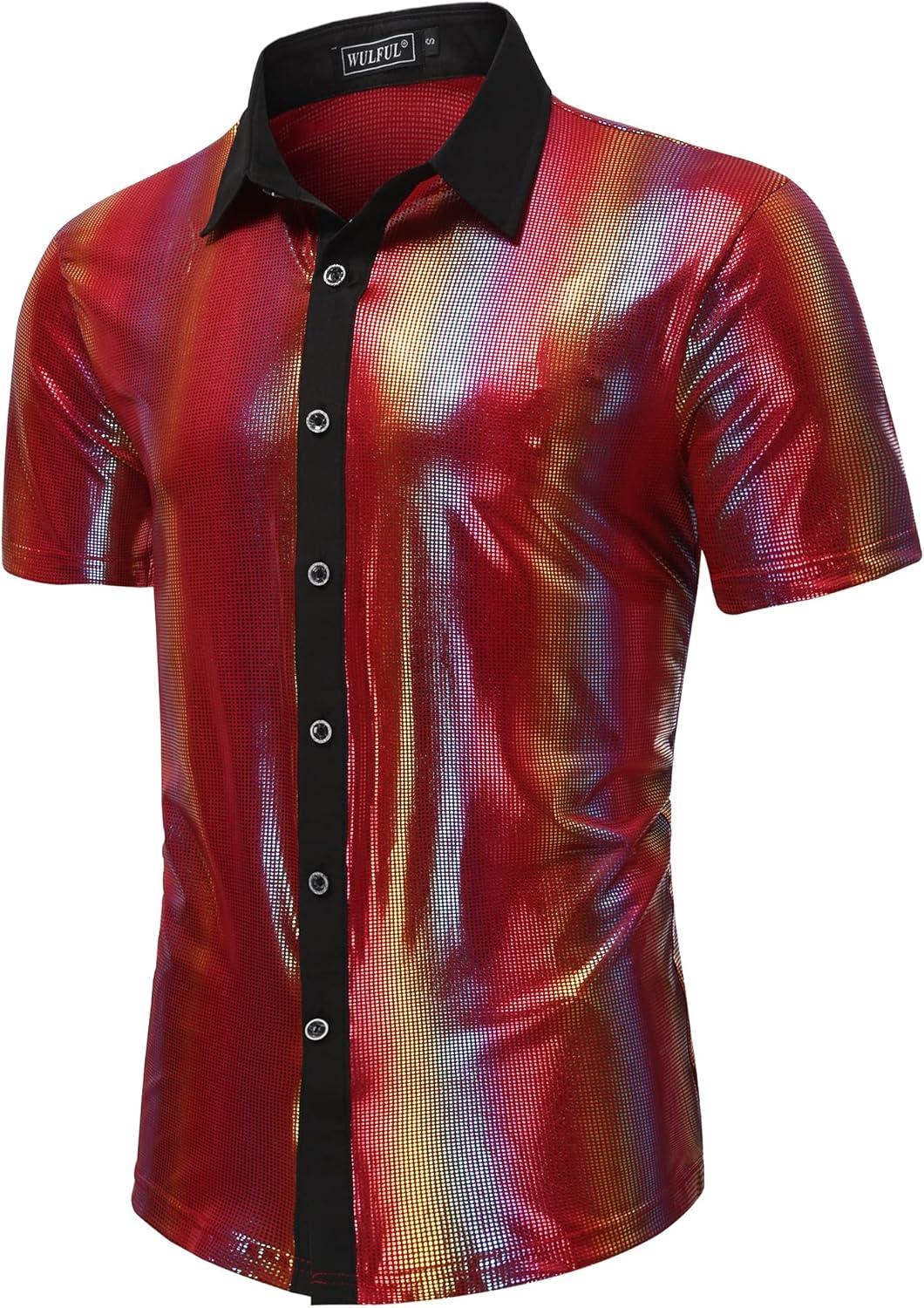 WULFUL Men's Disco Shirt Sequins Short Sleeve Button Down Shirts 70s Party Costume Dress Shirts(Multicolor053)