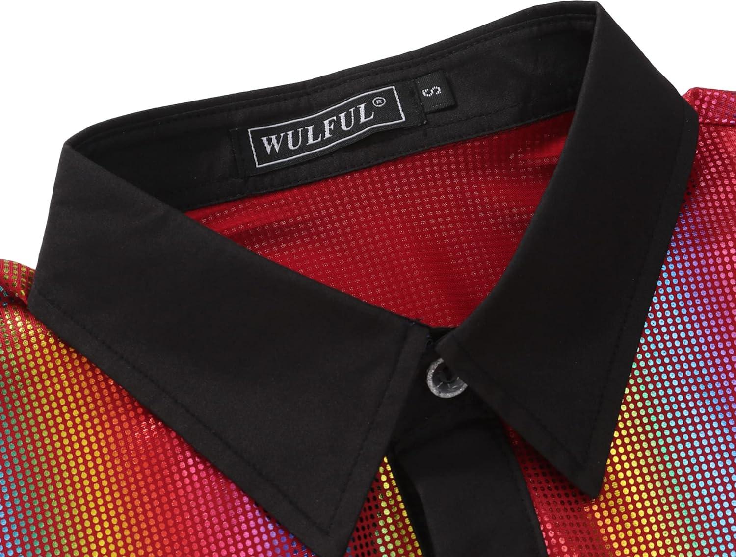 WULFUL Men’s Disco Shirt Sequins Short Sleeve Button Down Shirts 70s Party Costume Dress Shirts(Multicolor053)