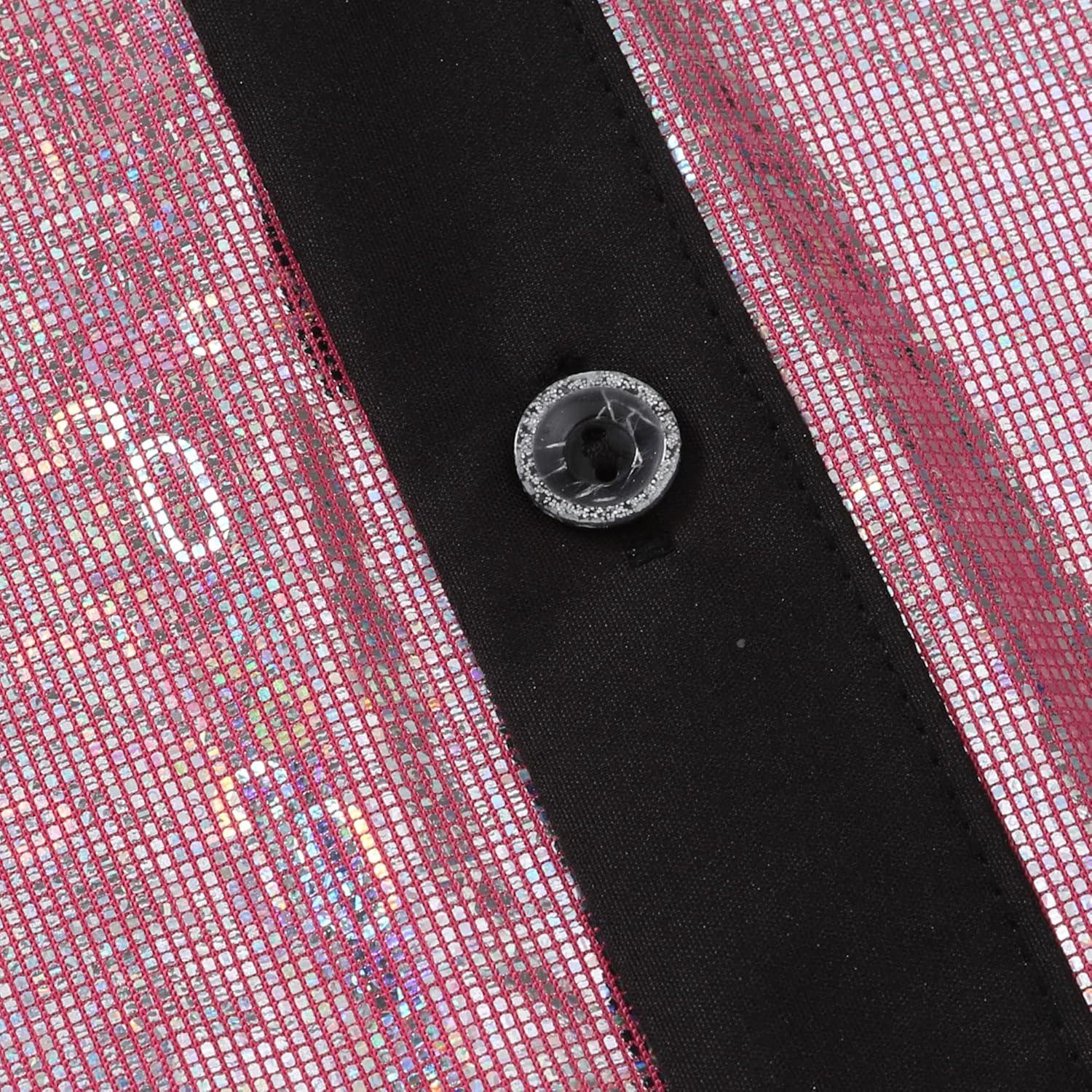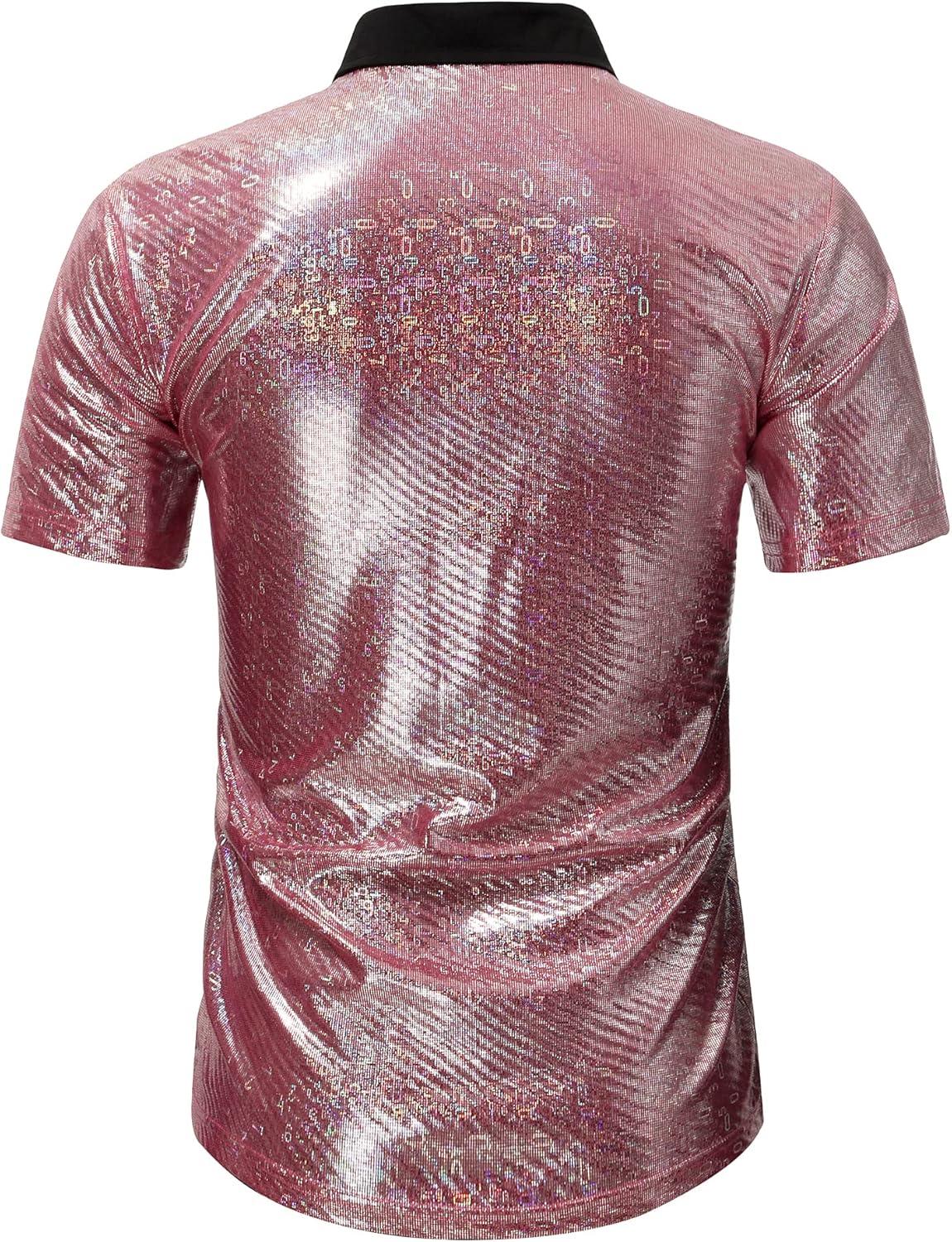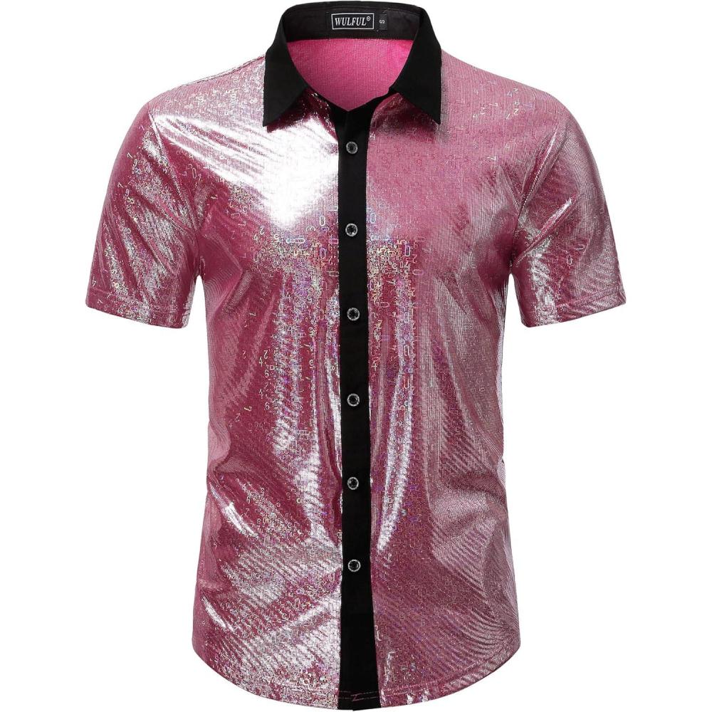WULFUL Men's Disco Shirt Sequins Short Sleeve Button Down Shirts 70s Party Costume Dress Shirts(Pink053)