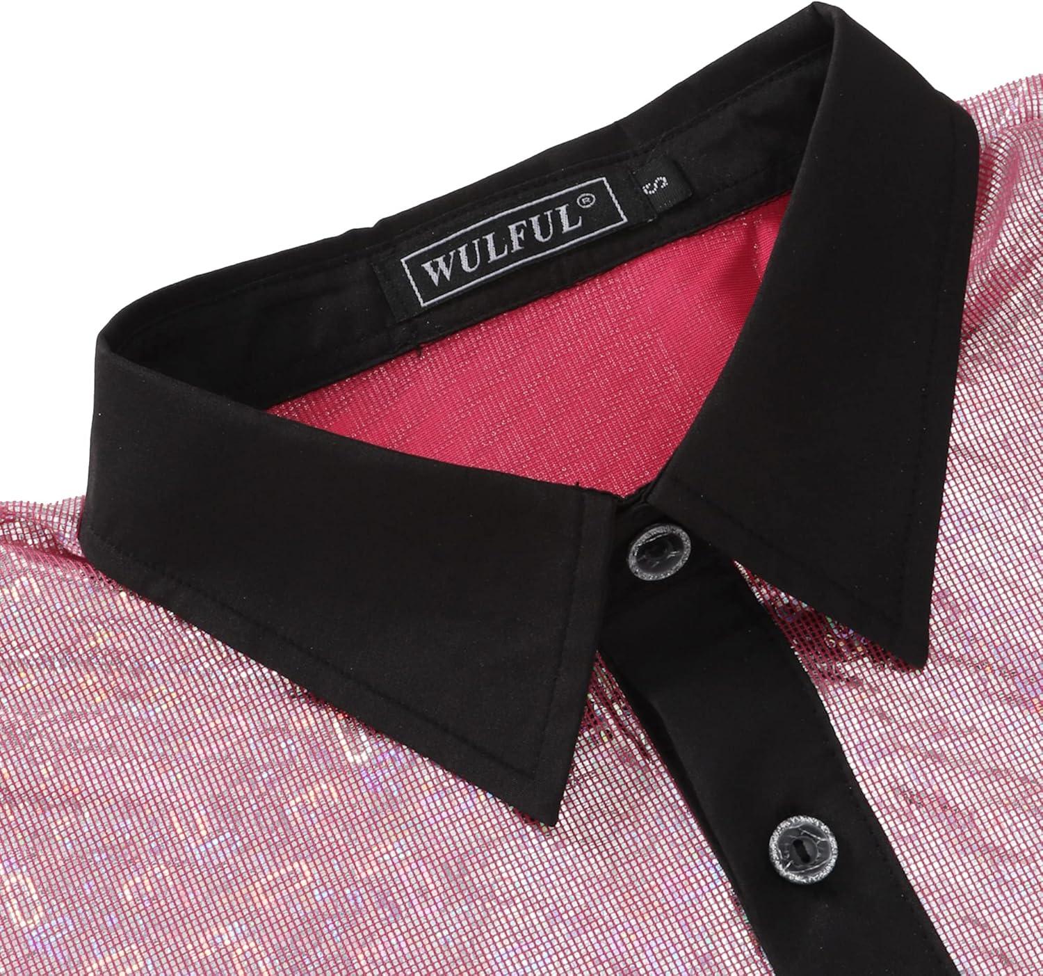 WULFUL Men’s Disco Shirt Sequins Short Sleeve Button Down Shirts 70s Party Costume Dress Shirts(Pink053)