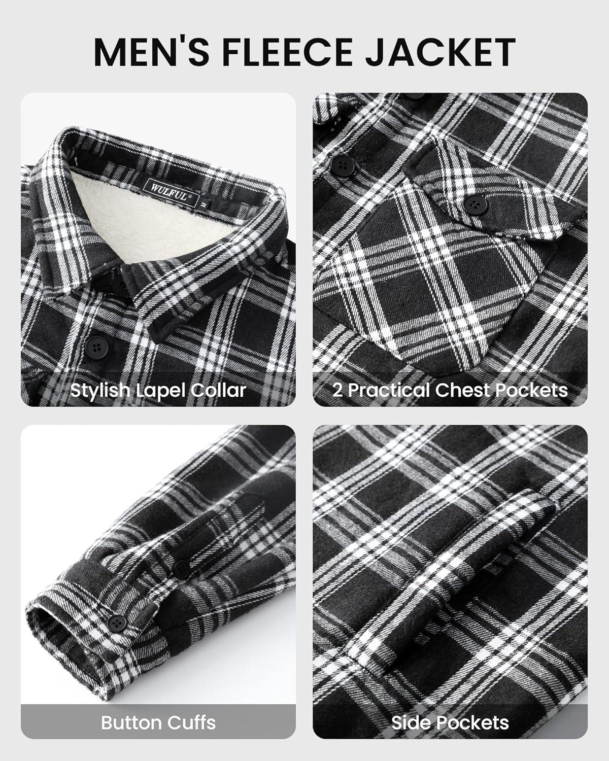WULFUL Men's Flannel Fleece Jackets Sherpa Lined Shirt Jacket Plaid Jackets Shacket Winter Outerwear Warm(Black758)