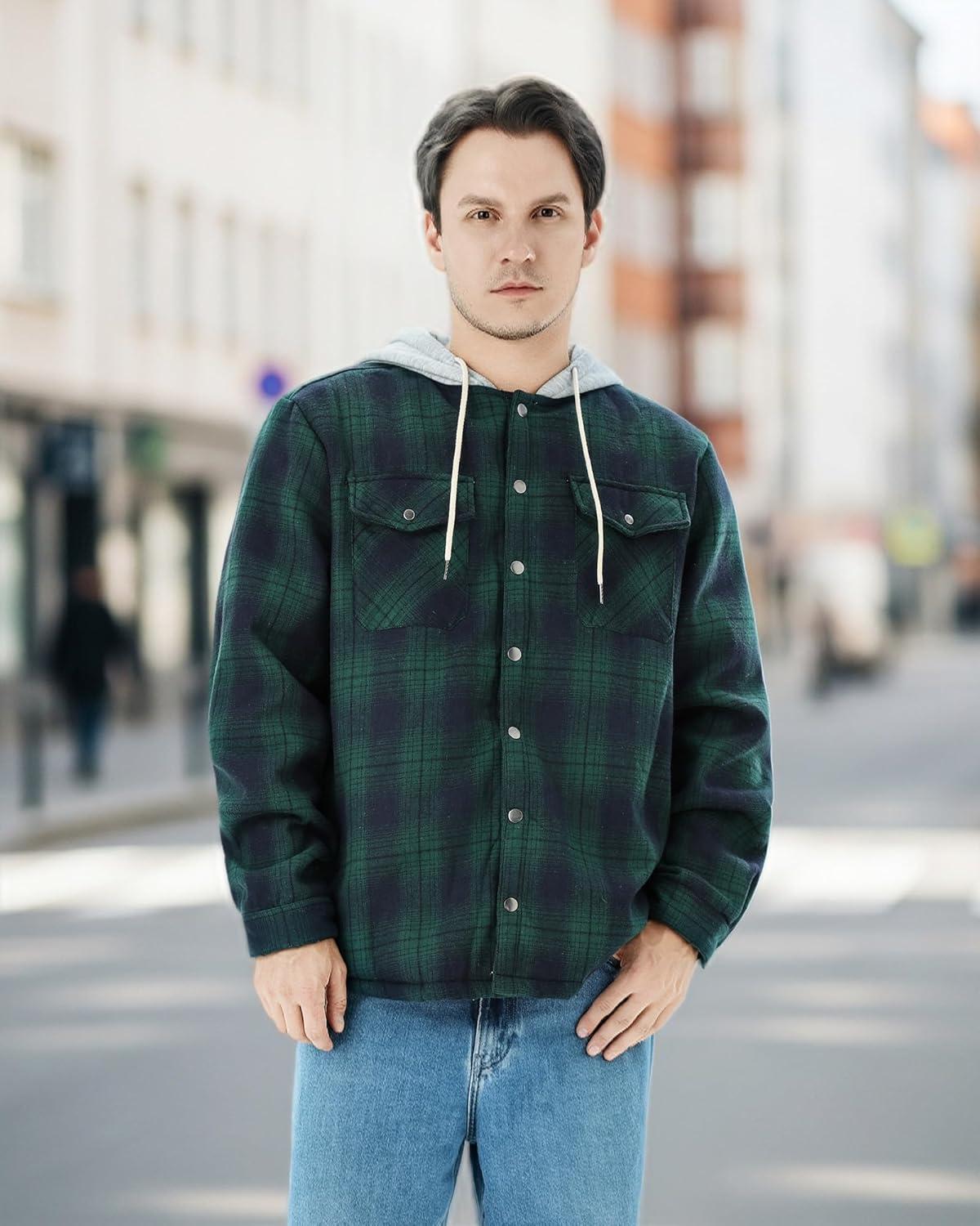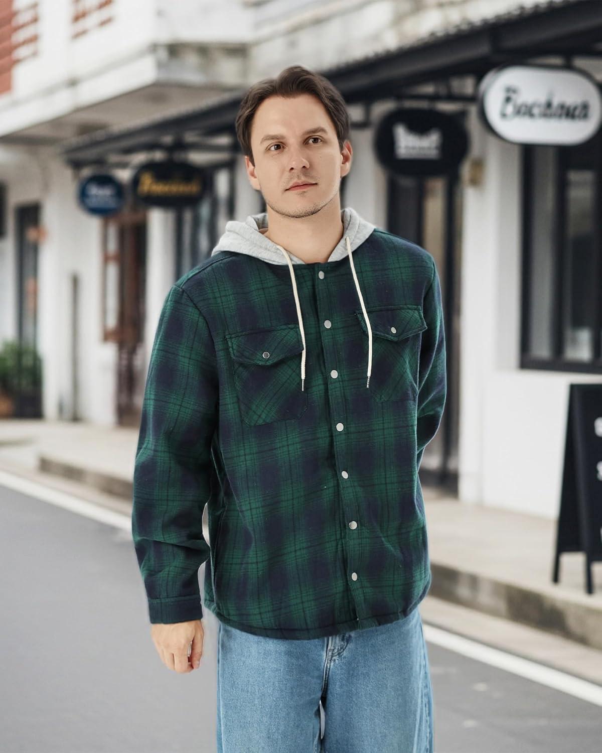 WULFUL Men's Flannel Plaid Shirts Jacket Fleece Lined Winter Shirts Soft Warm Coat with Hood for Men(Green813)