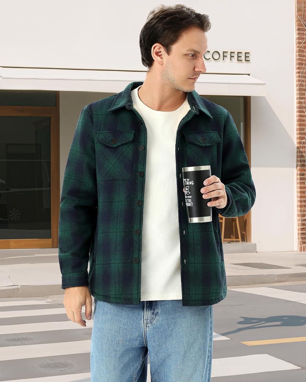WULFUL Men’s Flannel Shirts Jacket Casual Button Down Plaid Outerwear Coat Long Sleeve Fleece Shacket lightweight(Green813)