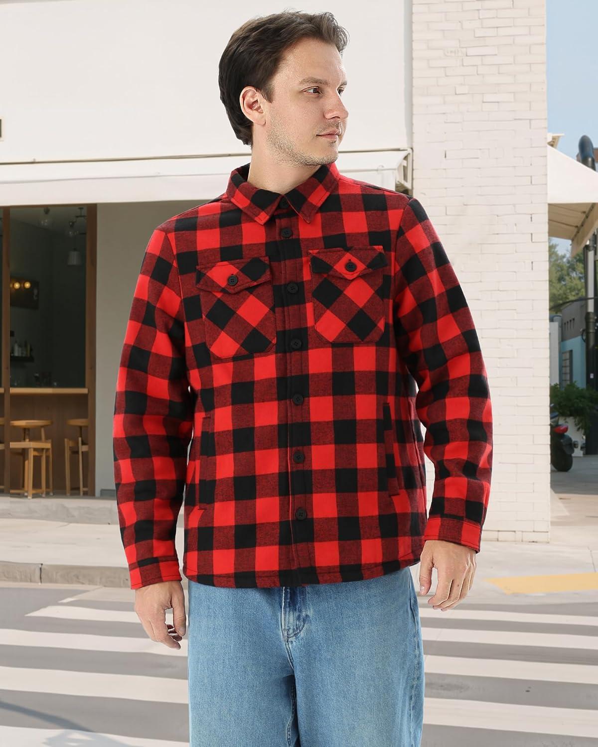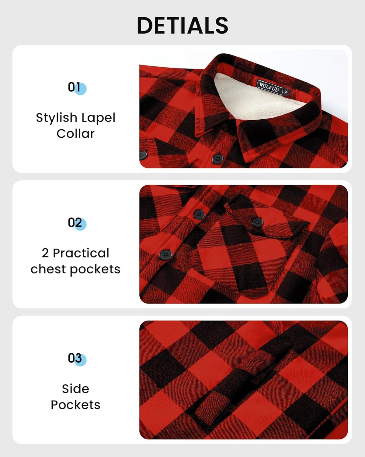 WULFUL Men's Flannel Shirts Jacket Casual Button Down Plaid Outerwear Coat Long Sleeve Fleece Shacket lightweight(Red798)