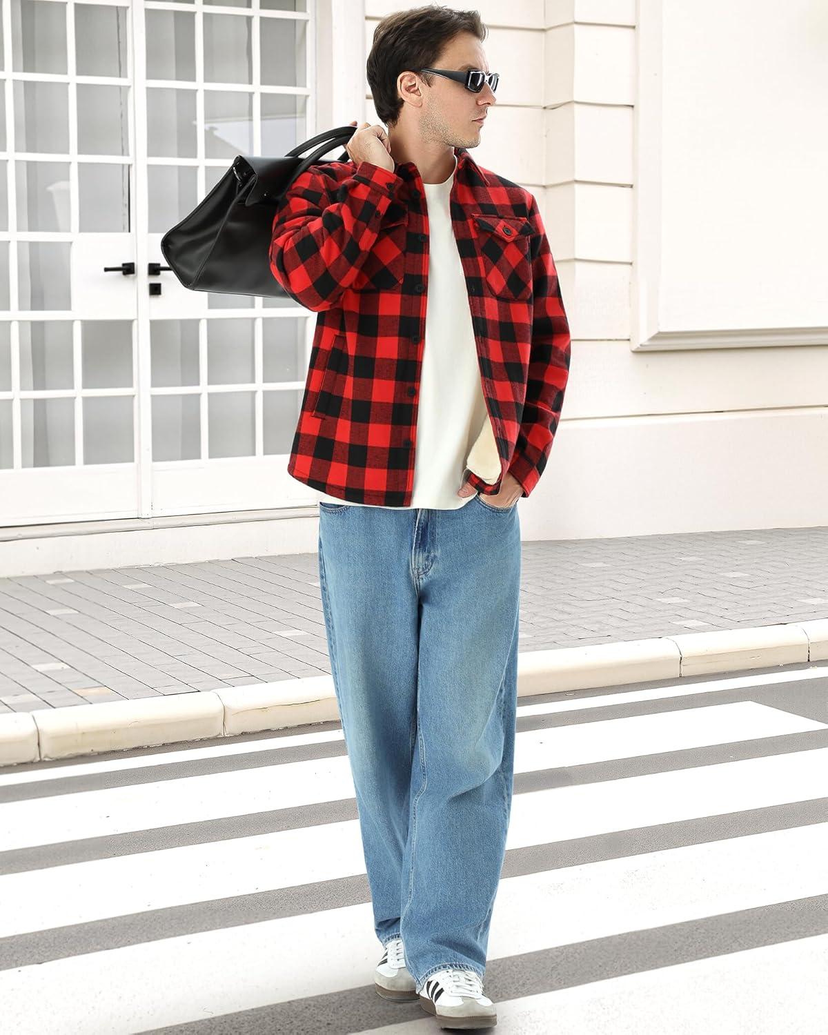 WULFUL Men’s Flannel Shirts Jacket Casual Button Down Plaid Outerwear Coat Long Sleeve Fleece Shacket lightweight(Red798)