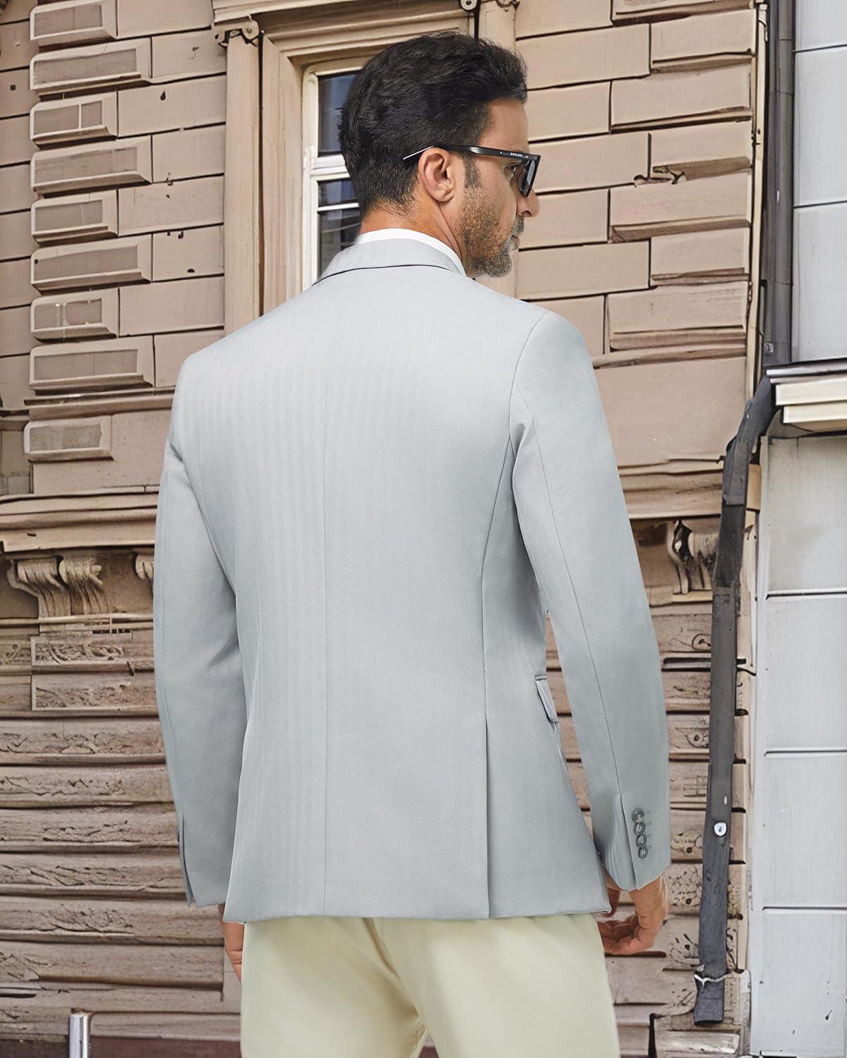 WULFUL Men's Herringbone Blazer Jacket Lightweight Casual Sport Coat One Button Suit Jackets(Light Grey)