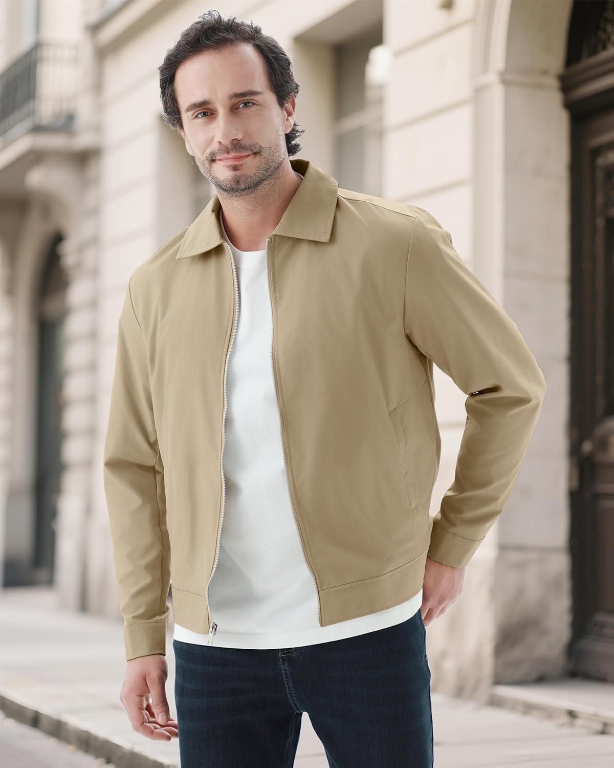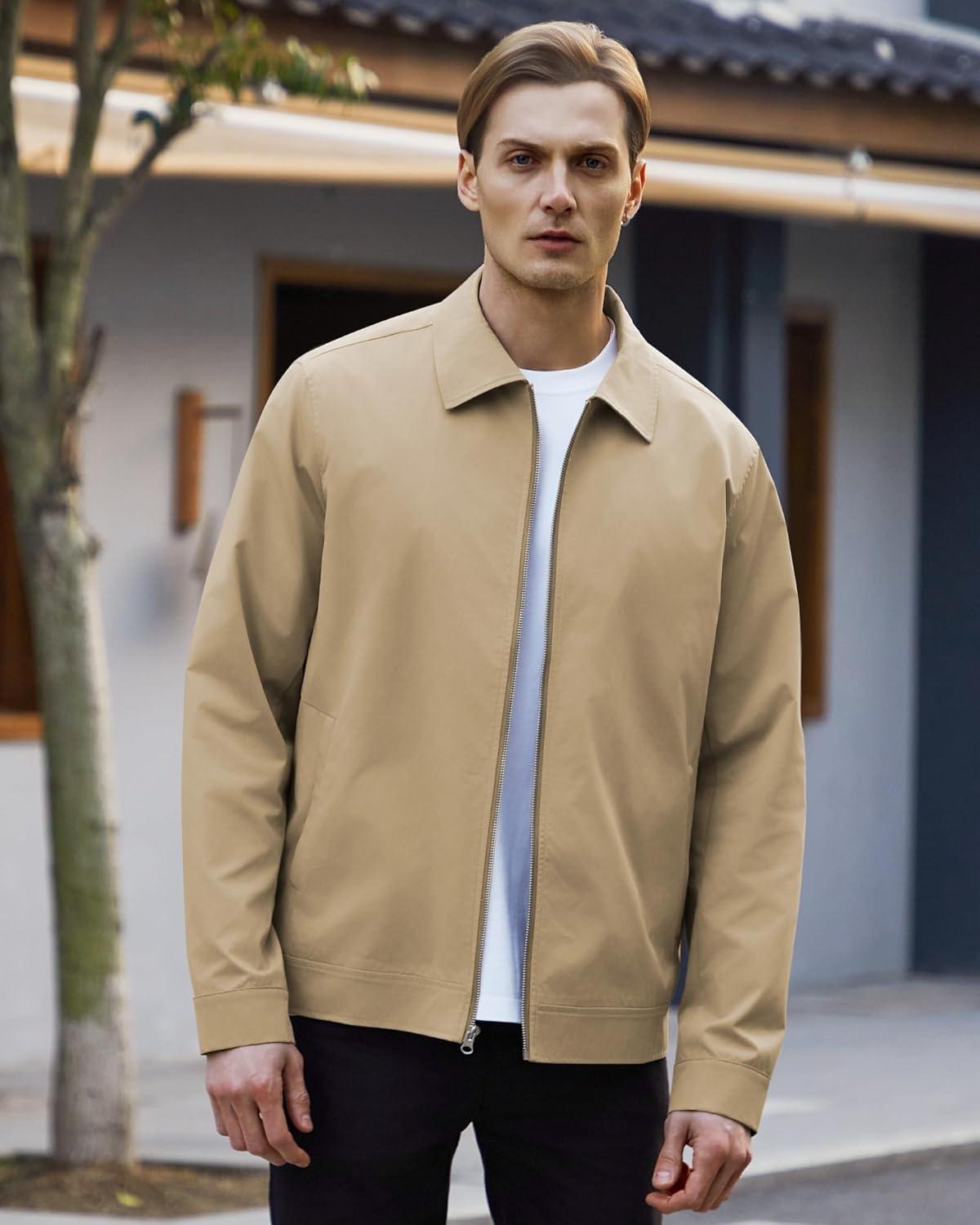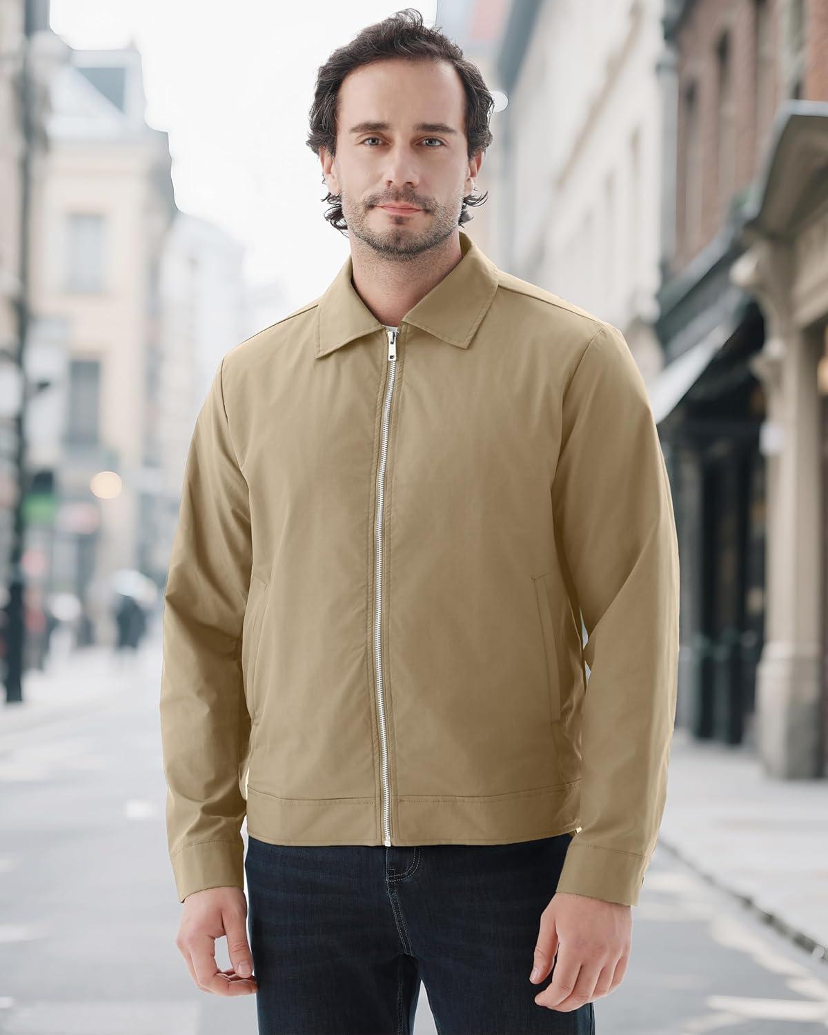 WULFUL Men’s Lightweight Jackets Casual Windbreaker Stylish Light Golf Work Dress Business(Khaki)