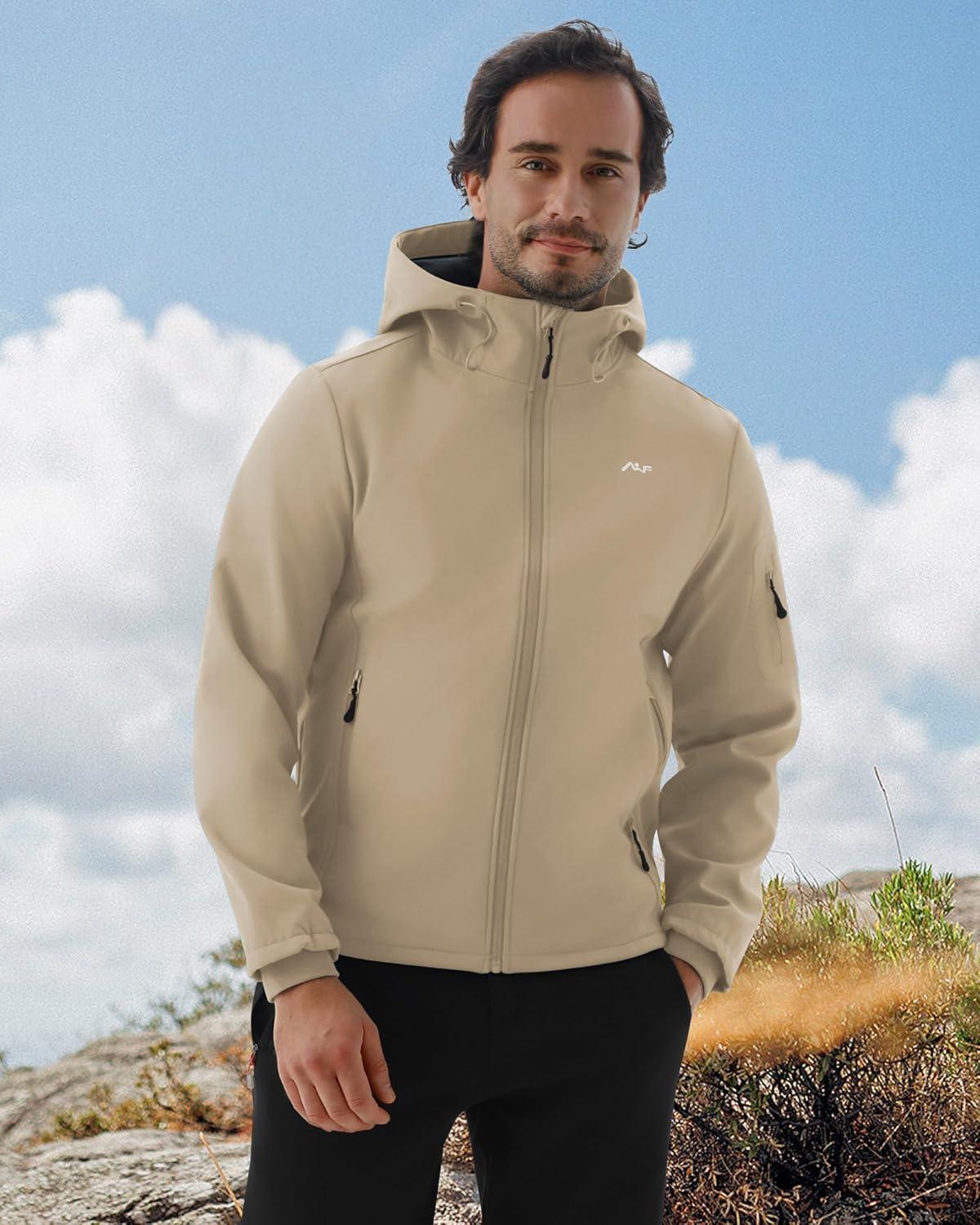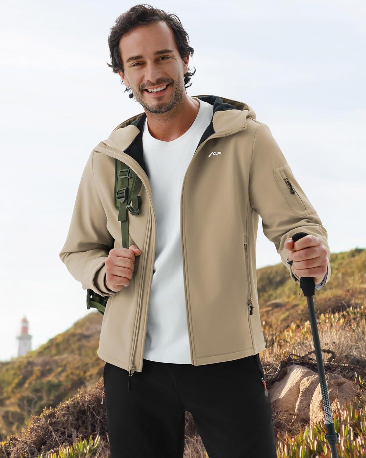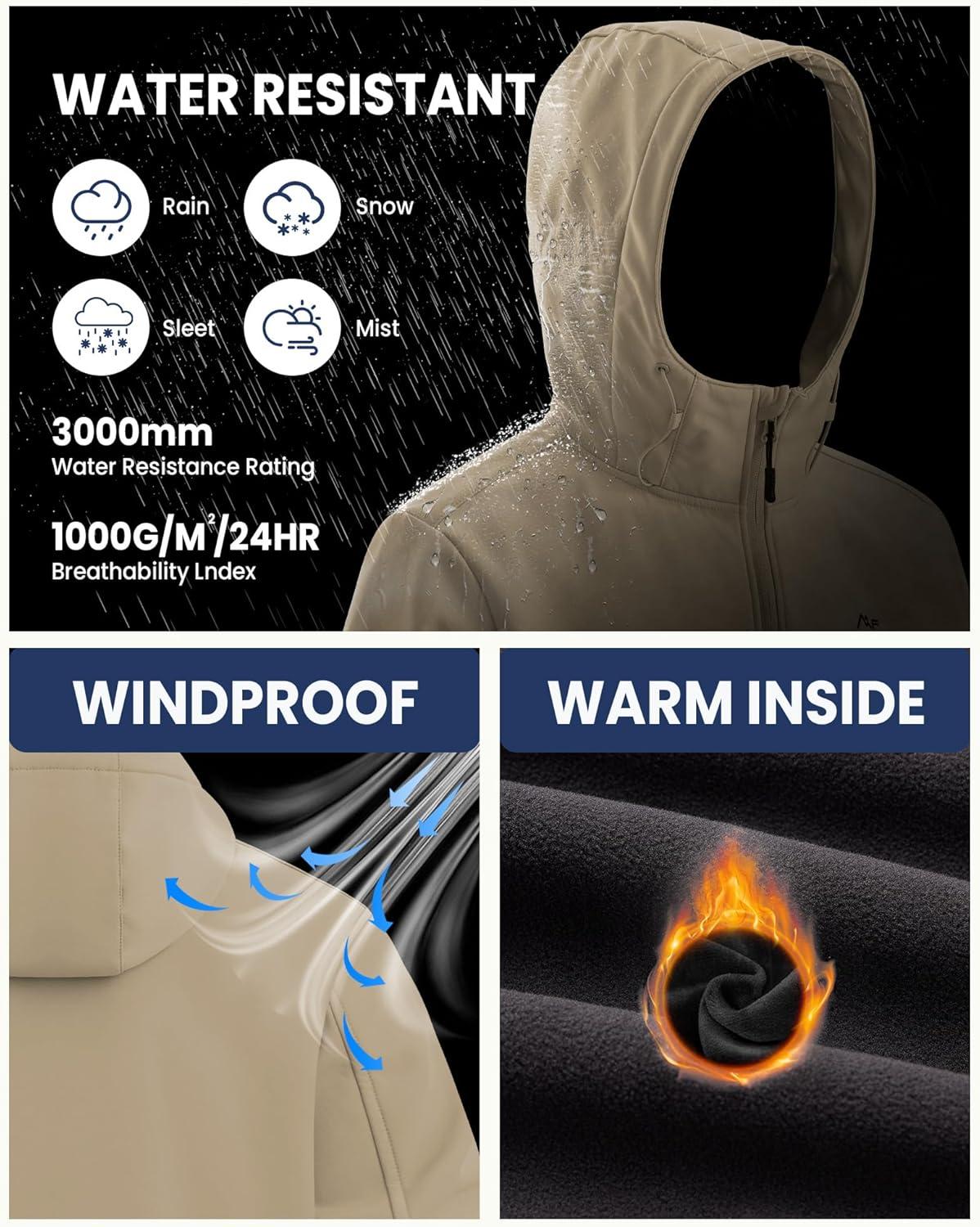 WULFUL Men’s Lightweight Softshell Jacket Warm Fleece Lined Windbreaker Waterproof Soft Shell for Outdoor Hiking(Khaki)