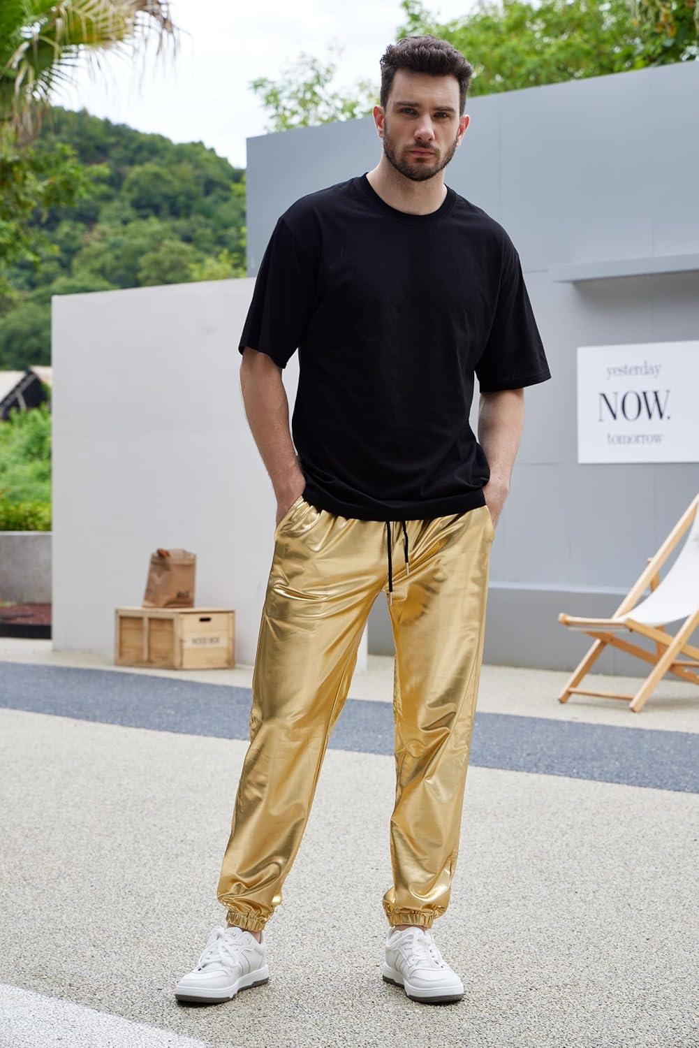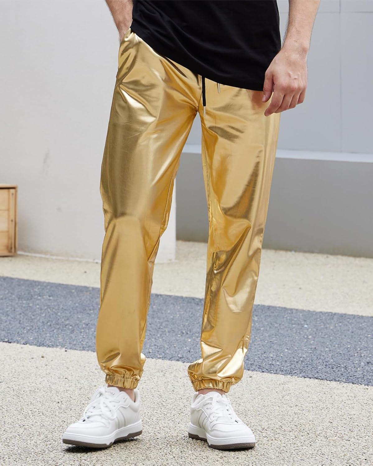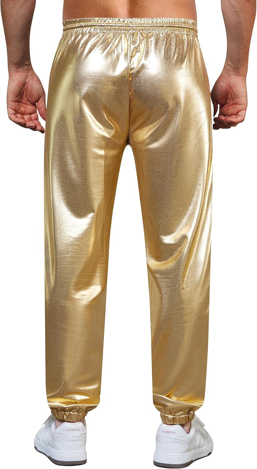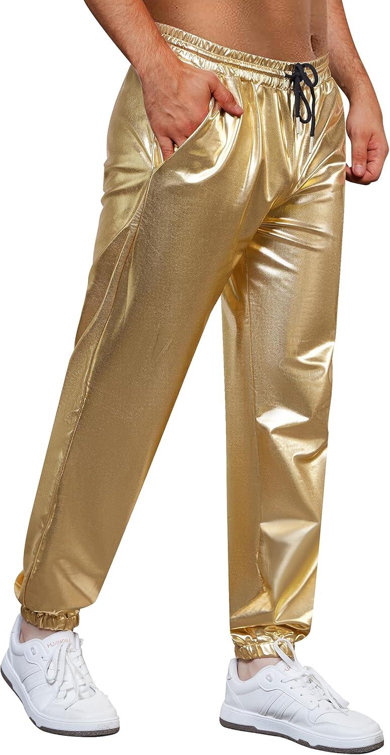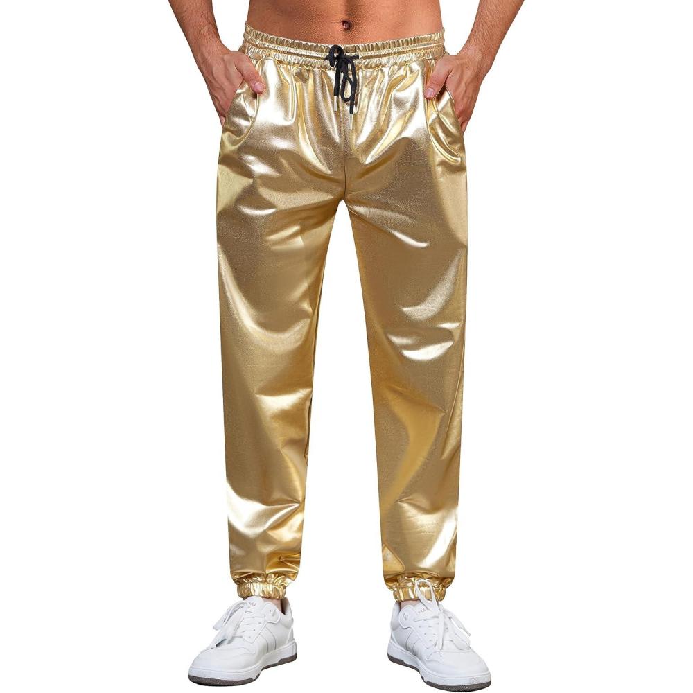 WULFUL Mens Metallic 70s Disco Costume Sequin Party Jogger Pants(Metallic-gold)