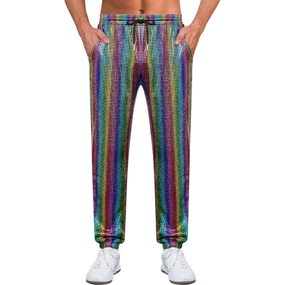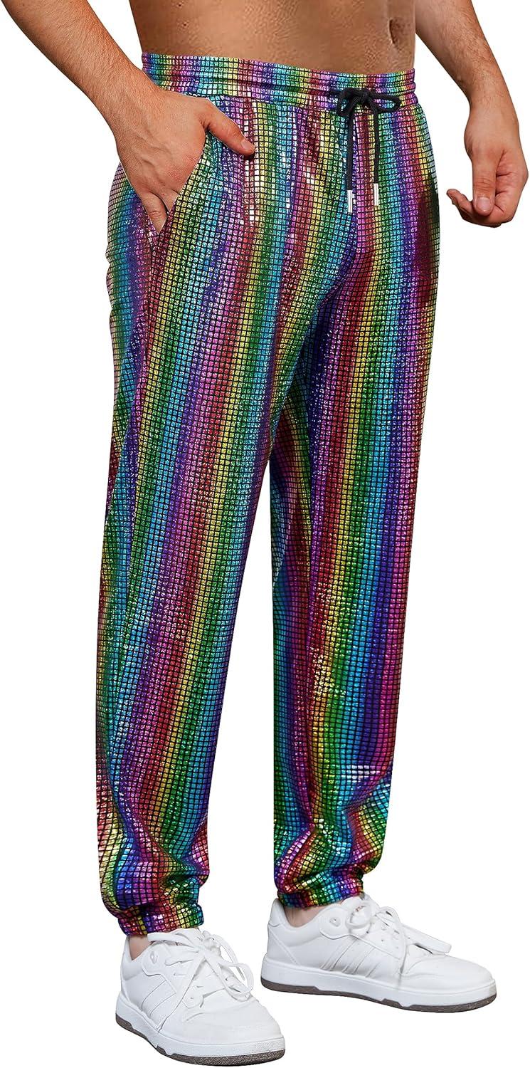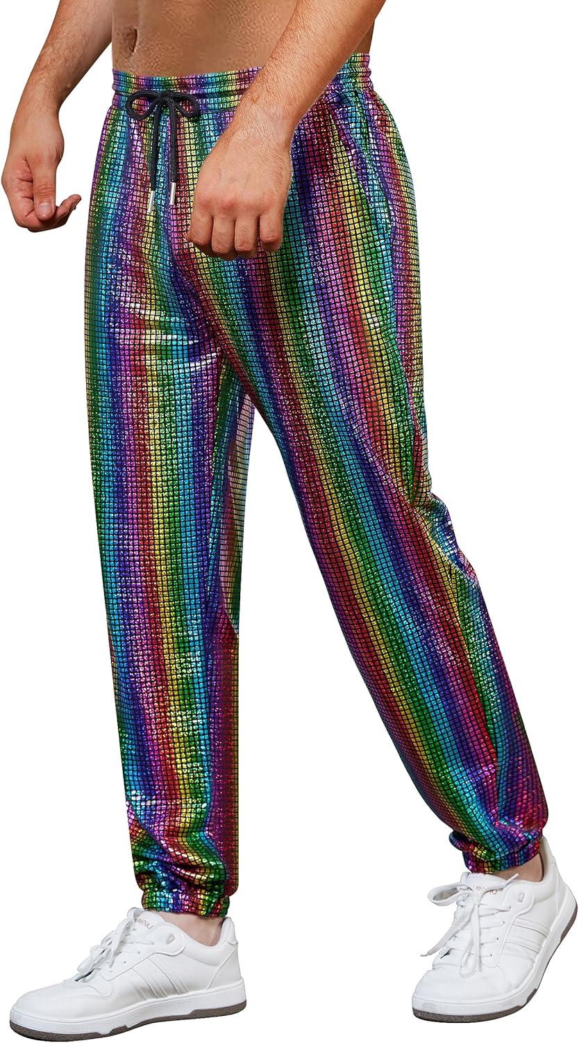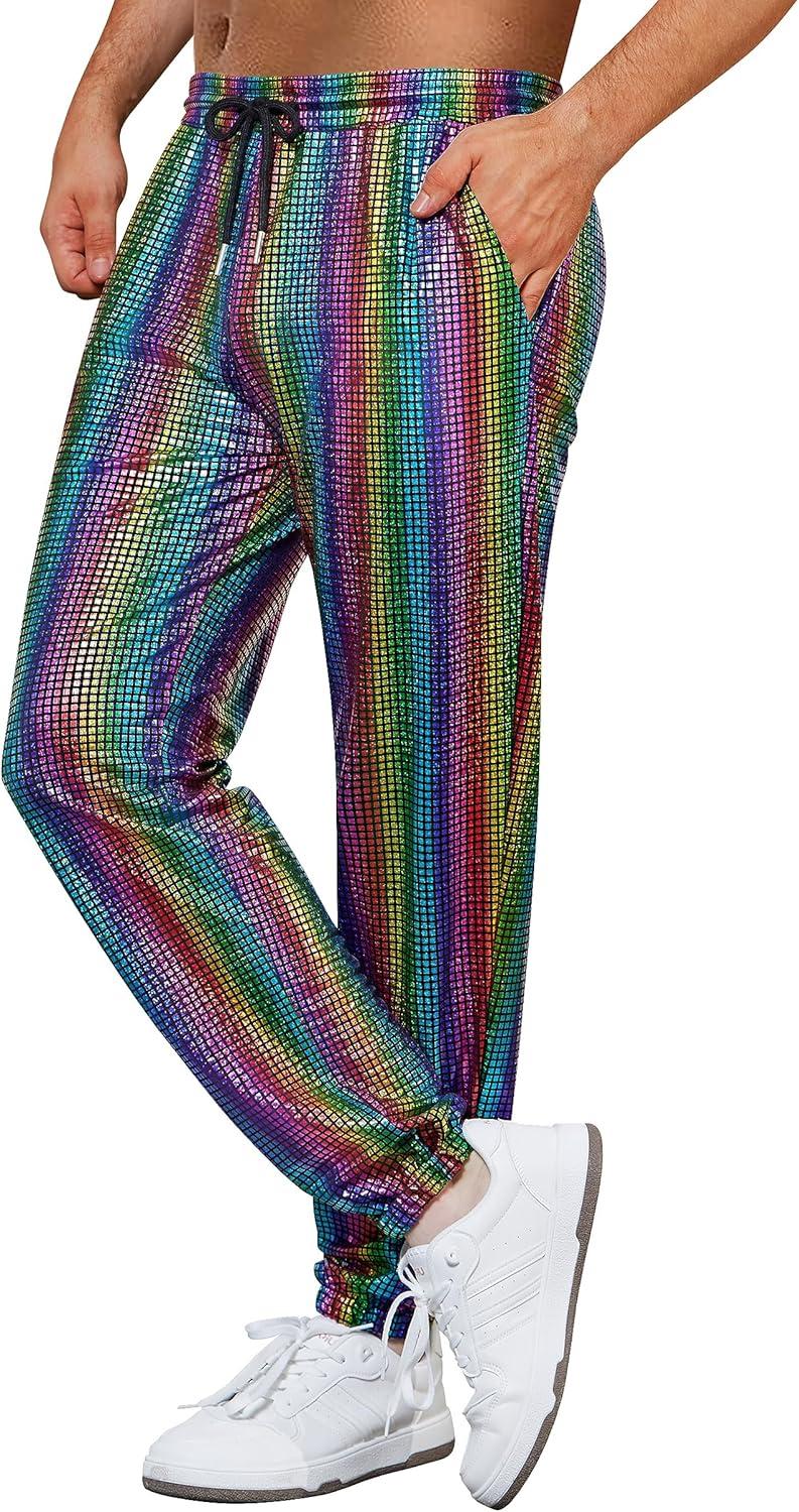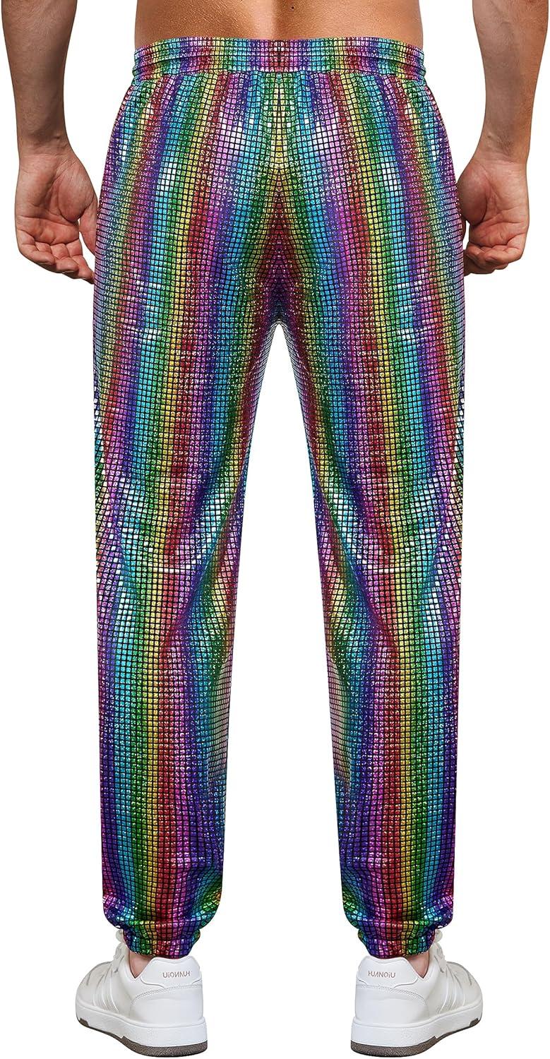 WULFUL Mens Metallic 70s Disco Costume Sequin Party Jogger Pants(Multicoloured)