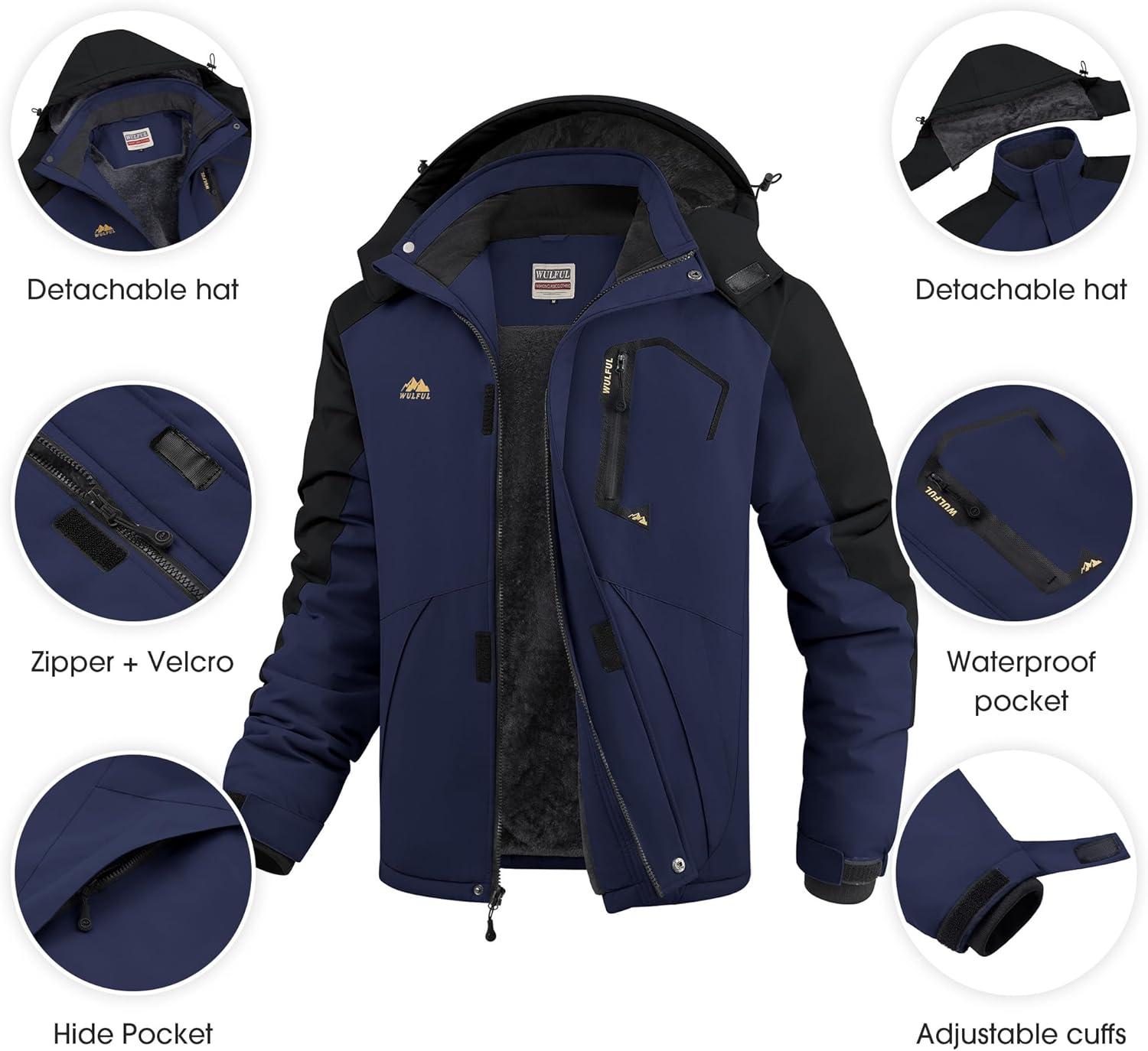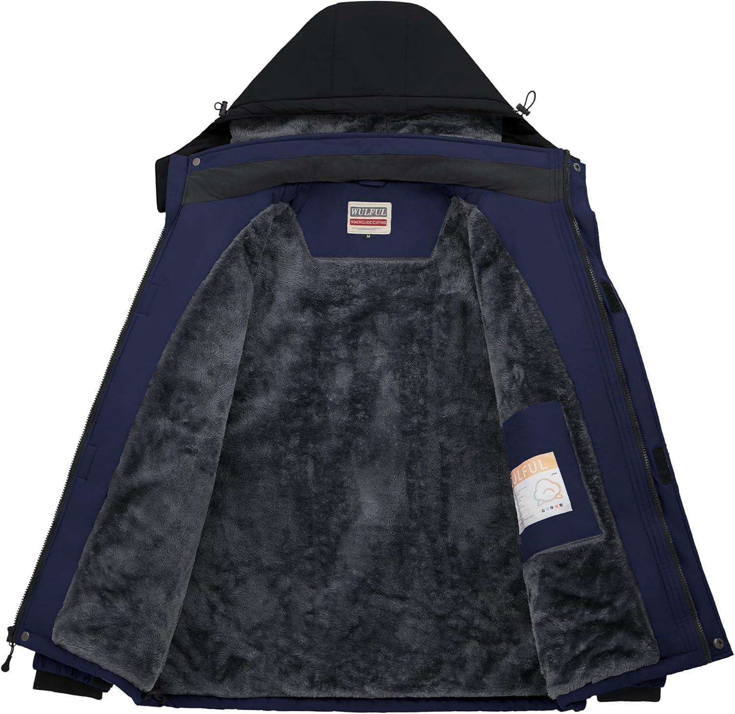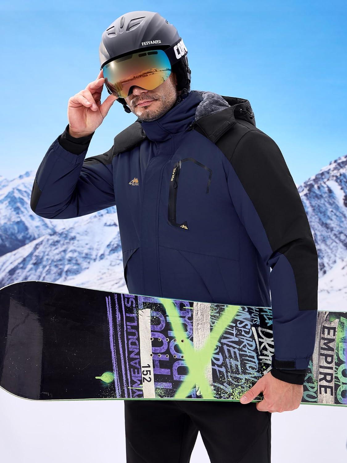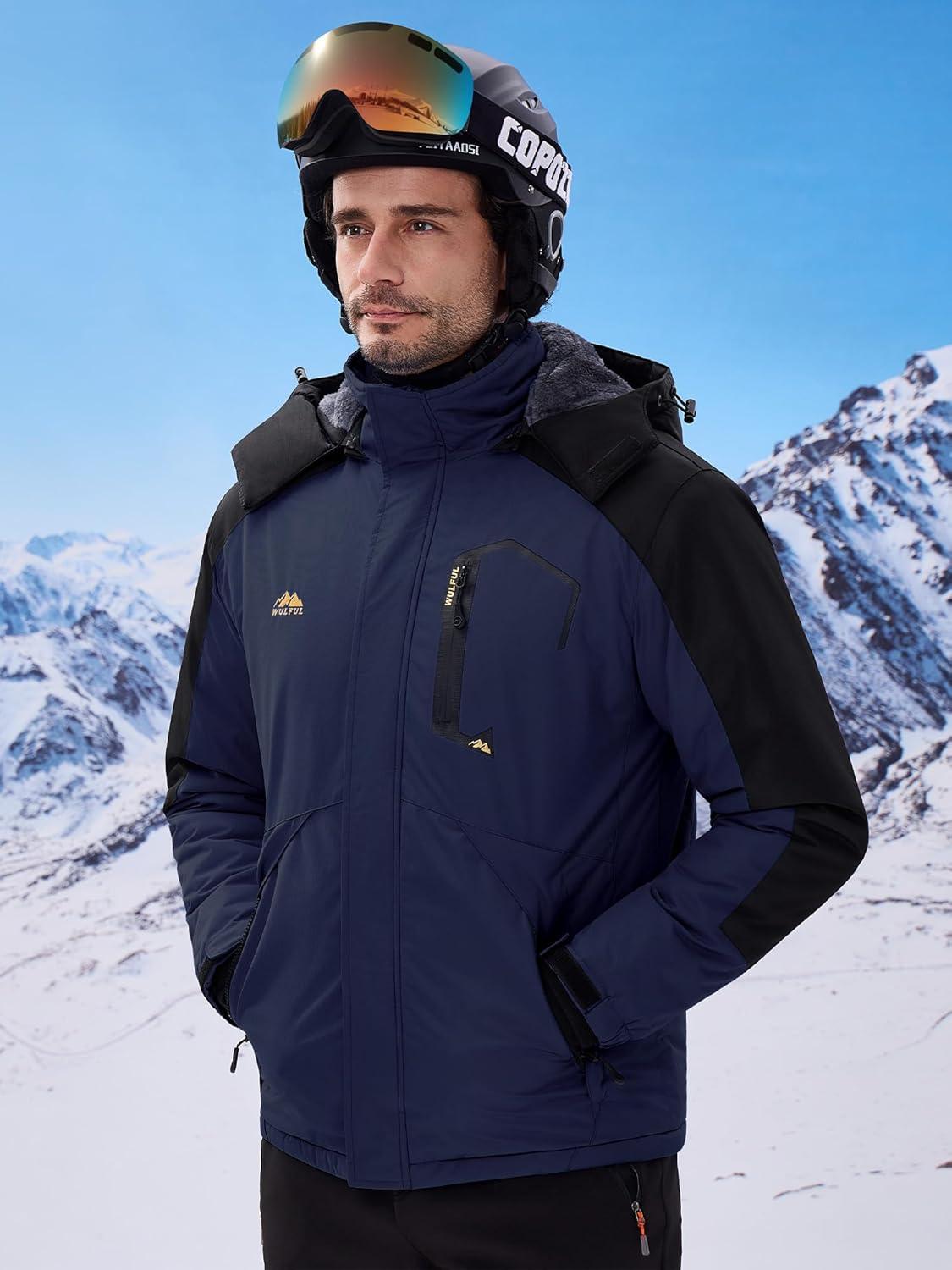 imageWULFUL Mens Ski Jackets Warm Winter Snow Windbreaker Resistant Snowboard Fleece Coat Mountain Waterproof Parka with HoodBlacknavy