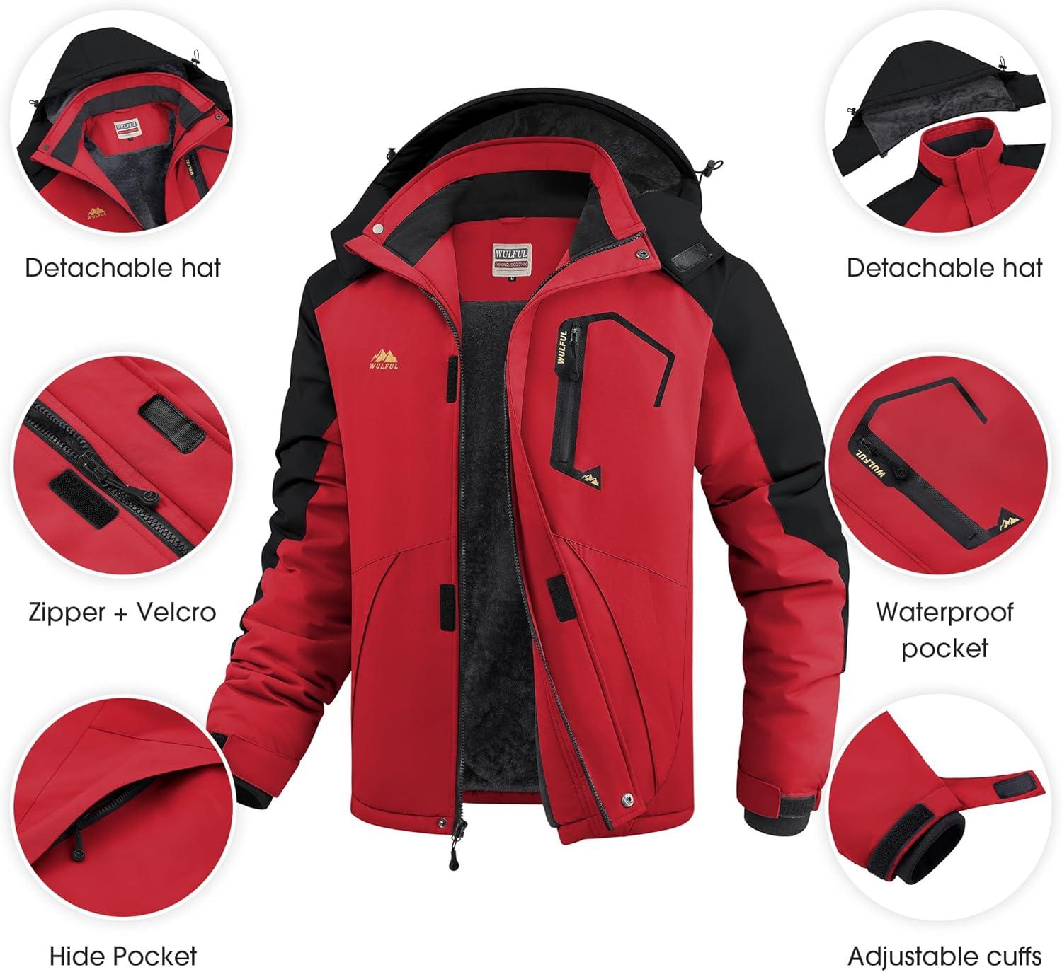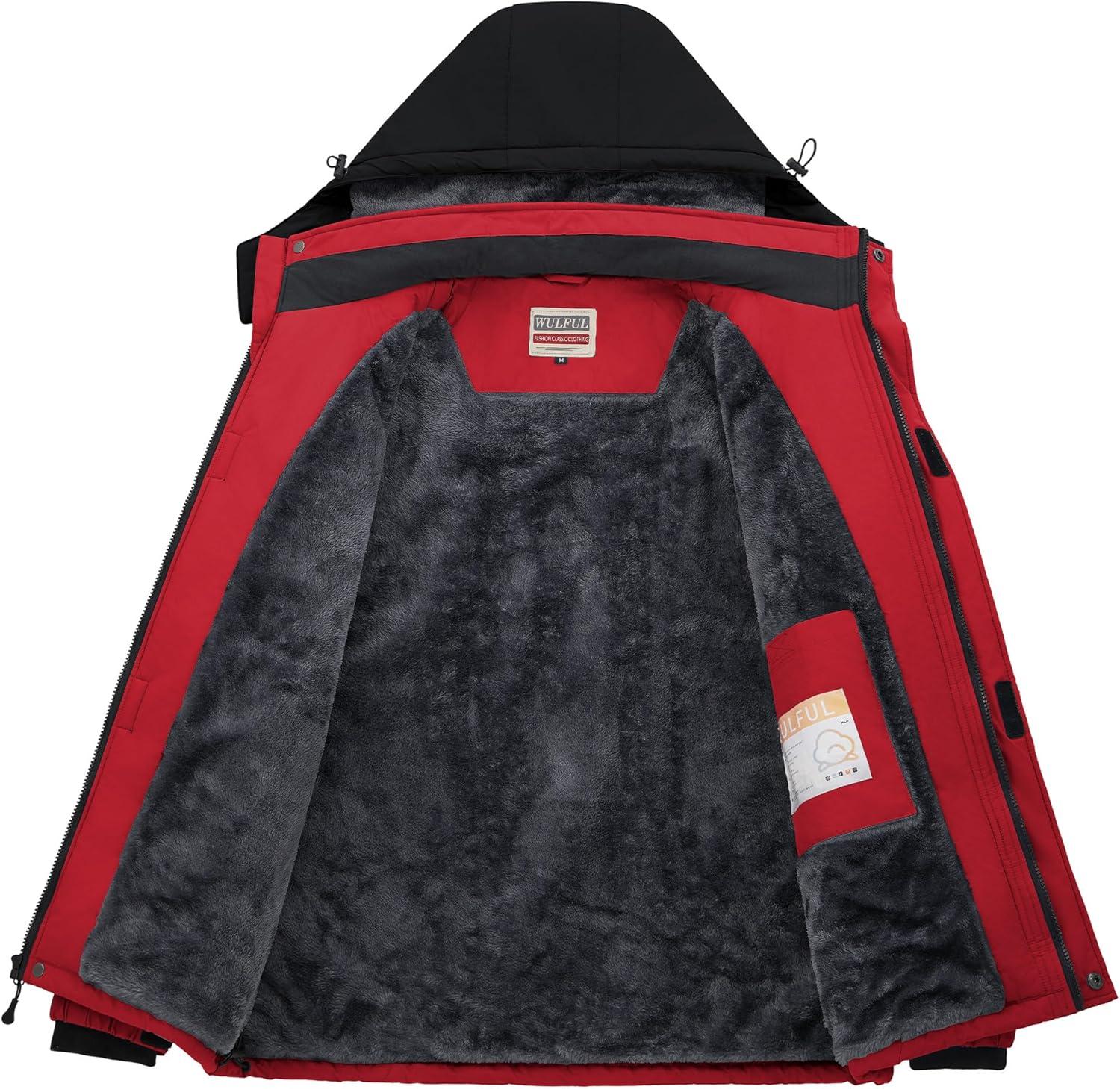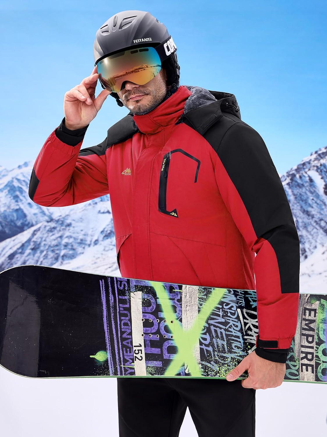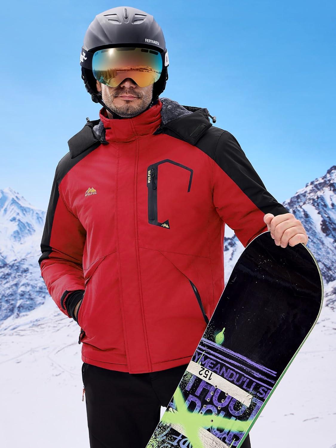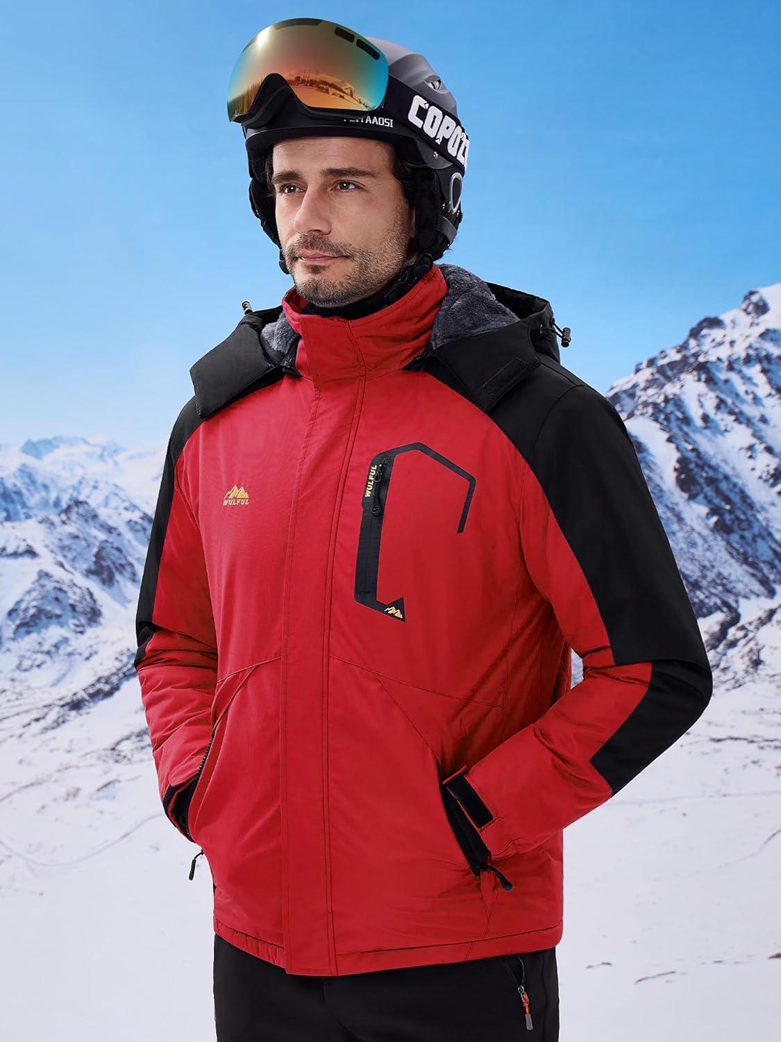 imageWULFUL Mens Ski Jackets Warm Winter Snow Windbreaker Resistant Snowboard Fleece Coat Mountain Waterproof Parka with HoodBlackred