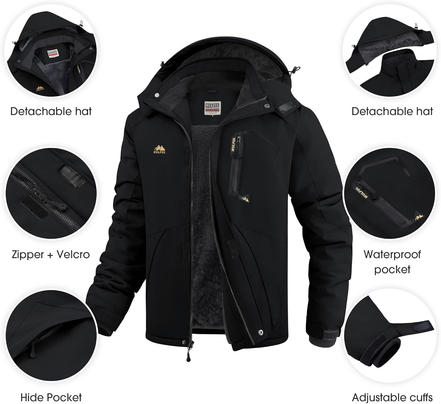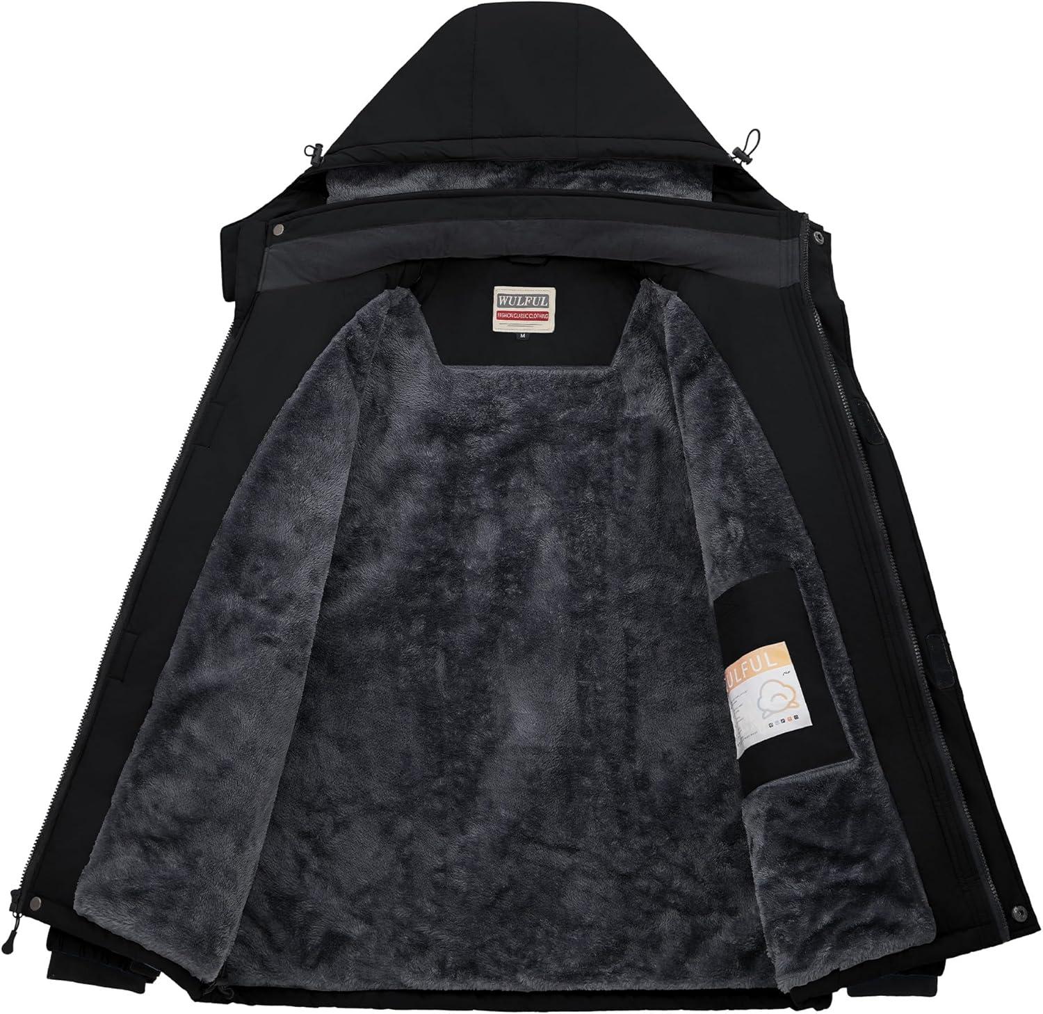 imageWULFUL Mens Ski Jackets Warm Winter Snow Windbreaker Resistant Snowboard Fleece Coat Mountain Waterproof Parka with HoodBlack