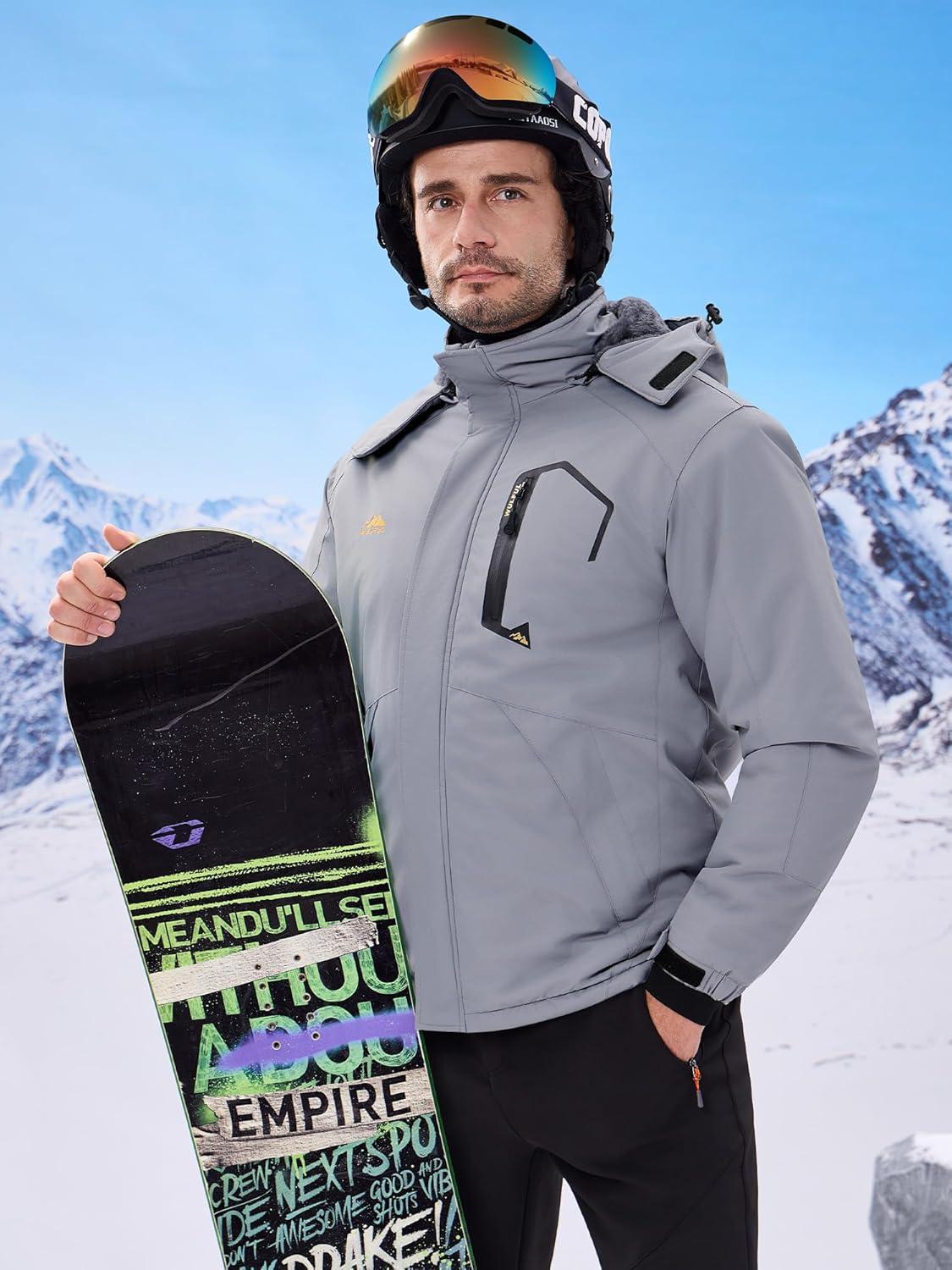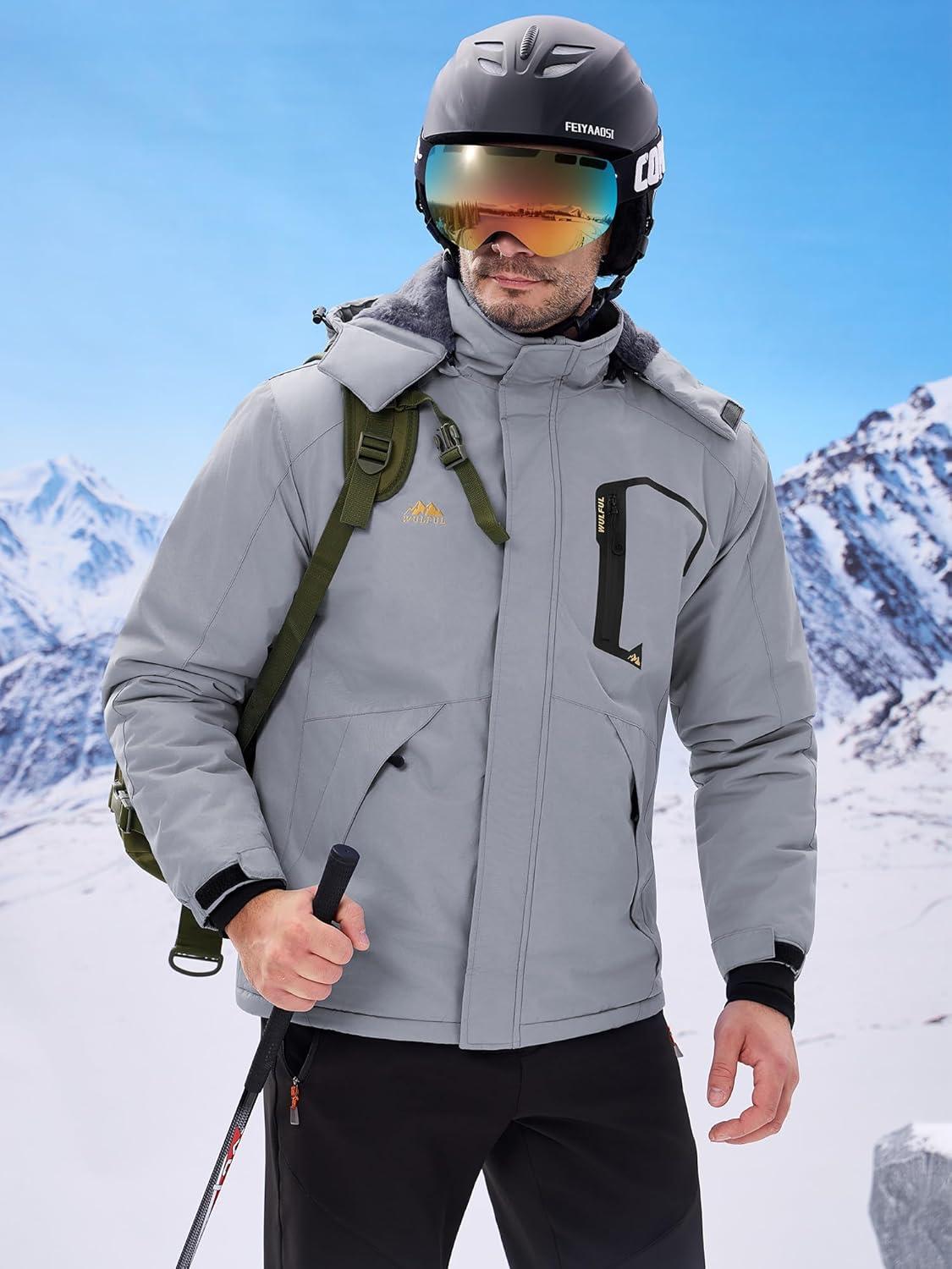 WULFUL Men’s Ski Jackets Warm Winter Snow Windbreaker Resistant Snowboard Fleece Coat Mountain Waterproof Parka with Hood(Gray)