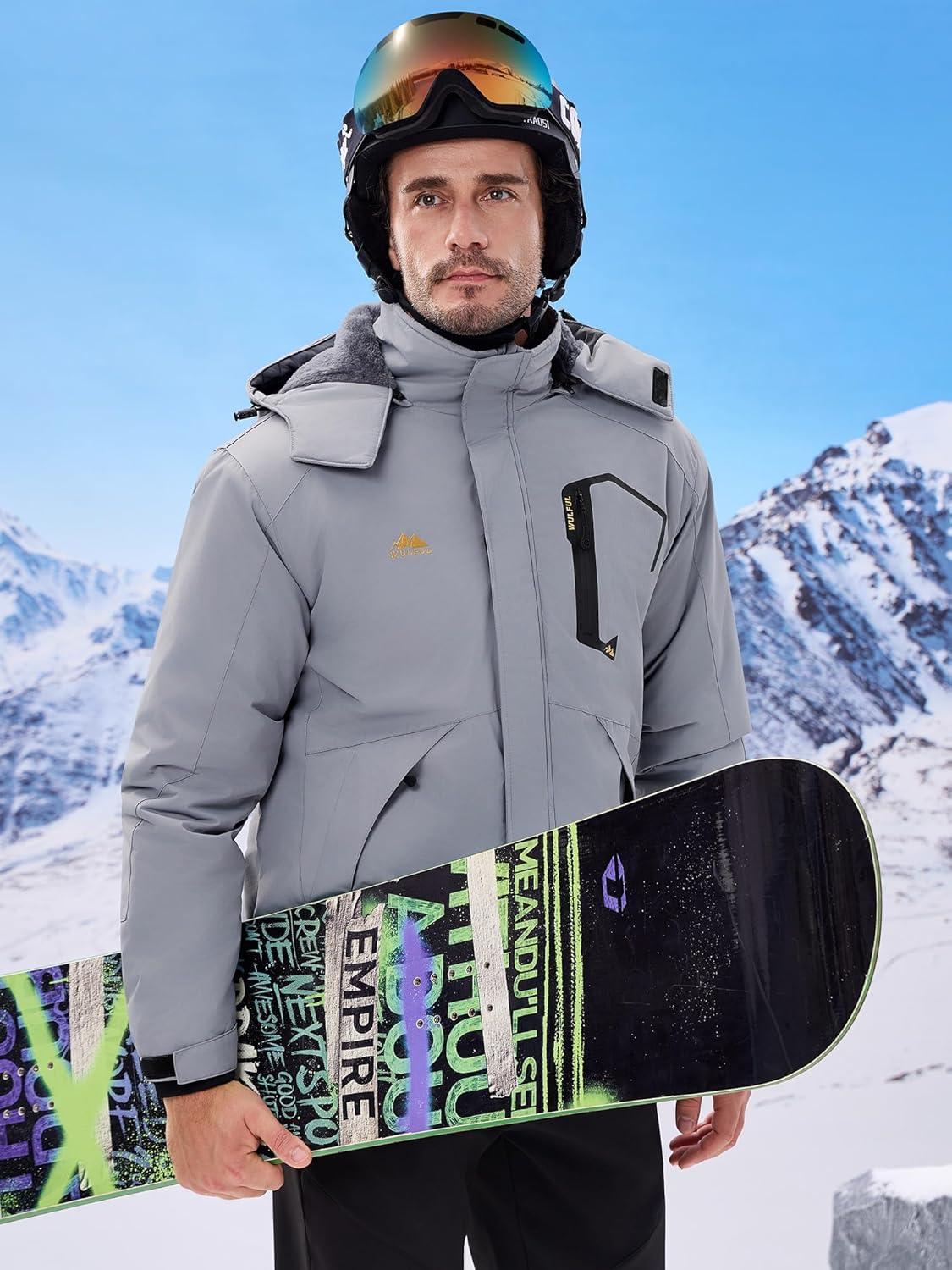WULFUL Men's Ski Jackets Warm Winter Snow Windbreaker Resistant Snowboard Fleece Coat Mountain Waterproof Parka with Hood(Gray)