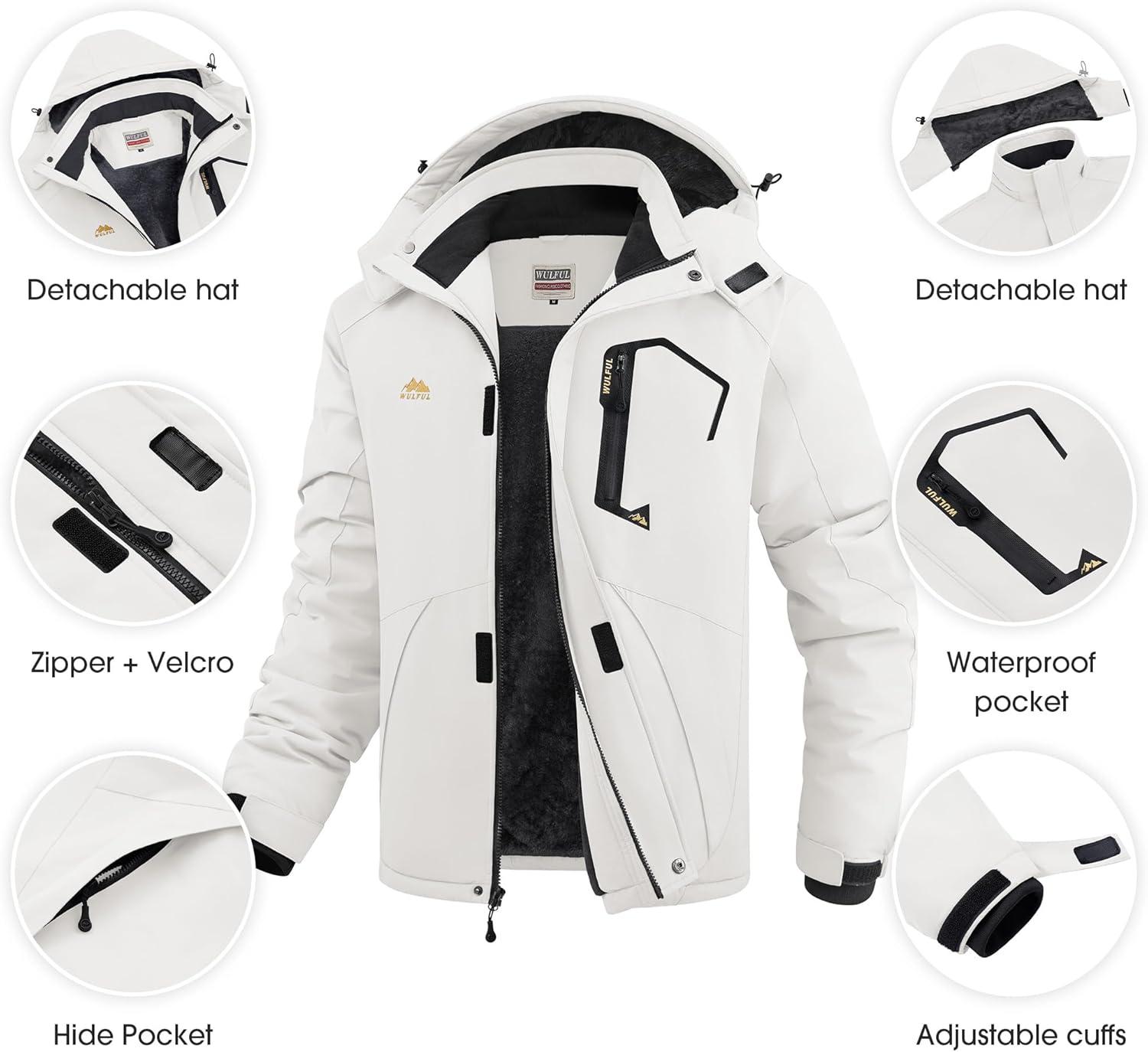 imageWULFUL Mens Ski Jackets Warm Winter Snow Windbreaker Resistant Snowboard Fleece Coat Mountain Waterproof Parka with HoodWhite
