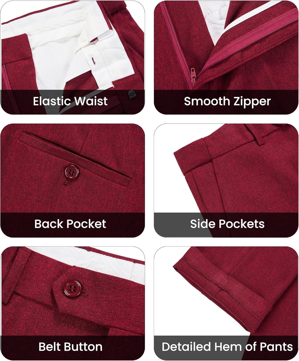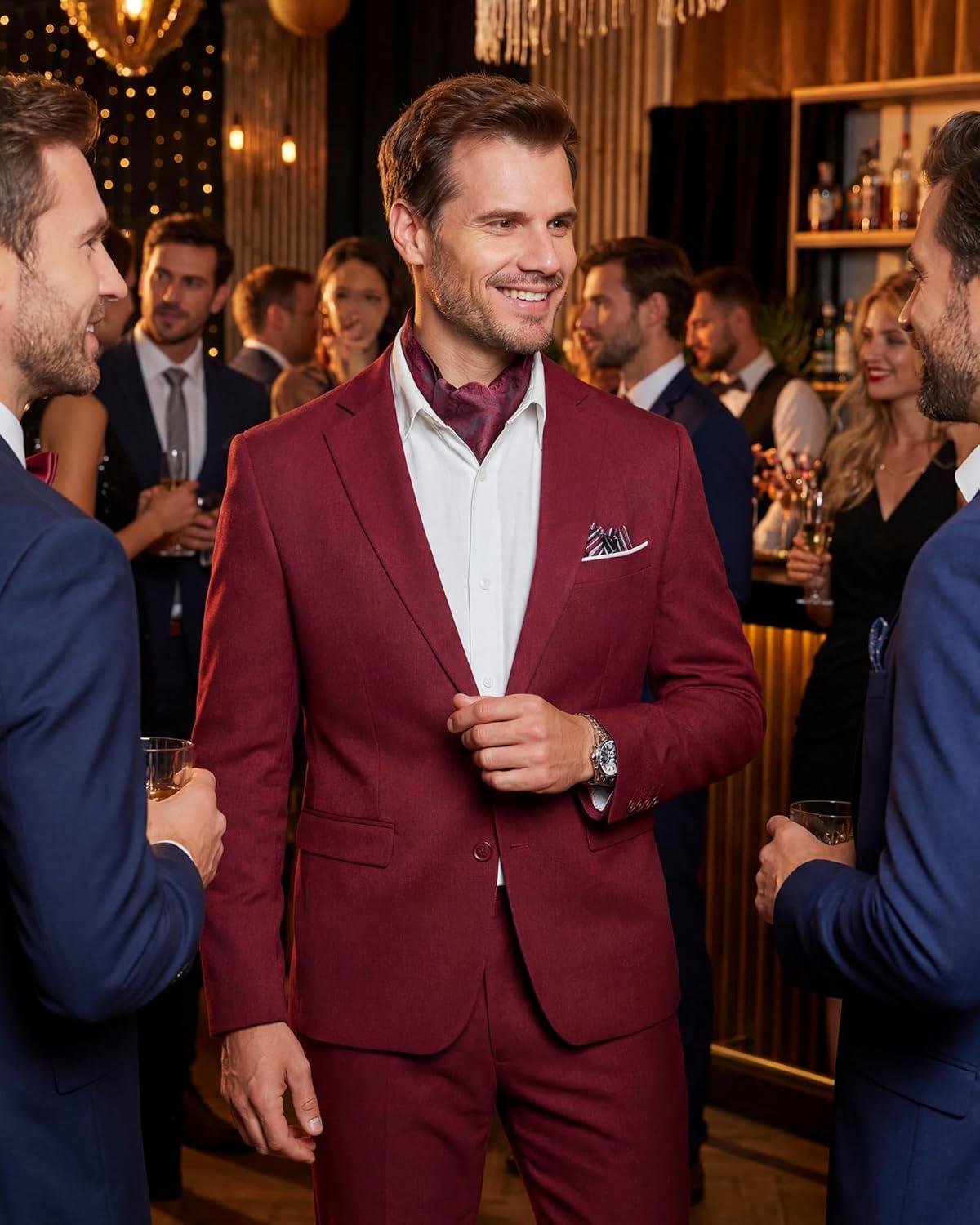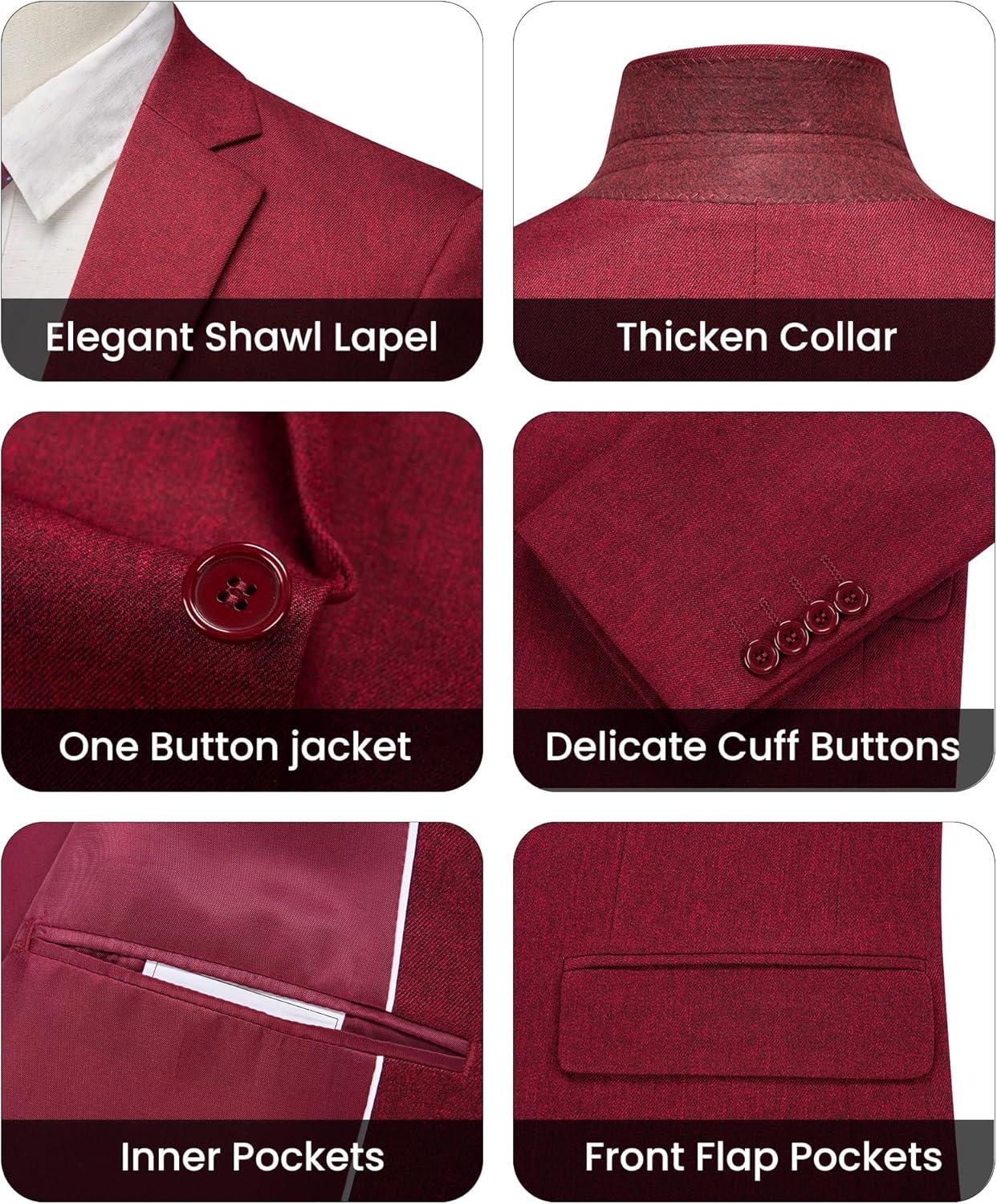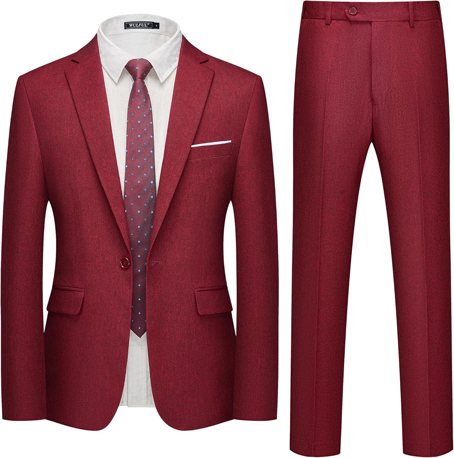 WULFUL Men's Slim Fit 2 Piece Suit, One Button Solid Blazer Business Party Jacket Vest Pants Set(Wine Red)