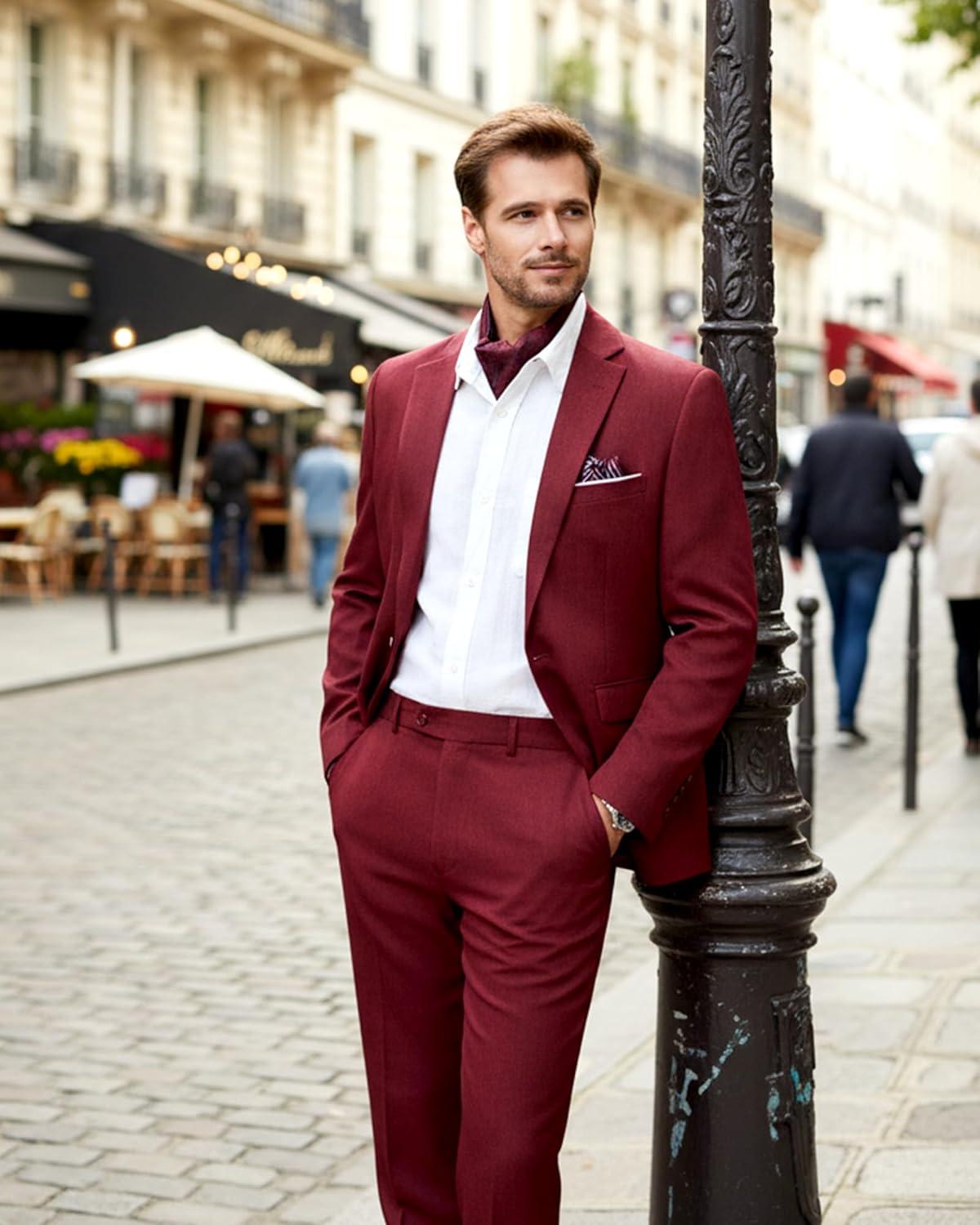 WULFUL Men’s Slim Fit 2 Piece Suit, One Button Solid Blazer Business Party Jacket Vest Pants Set(Wine Red)