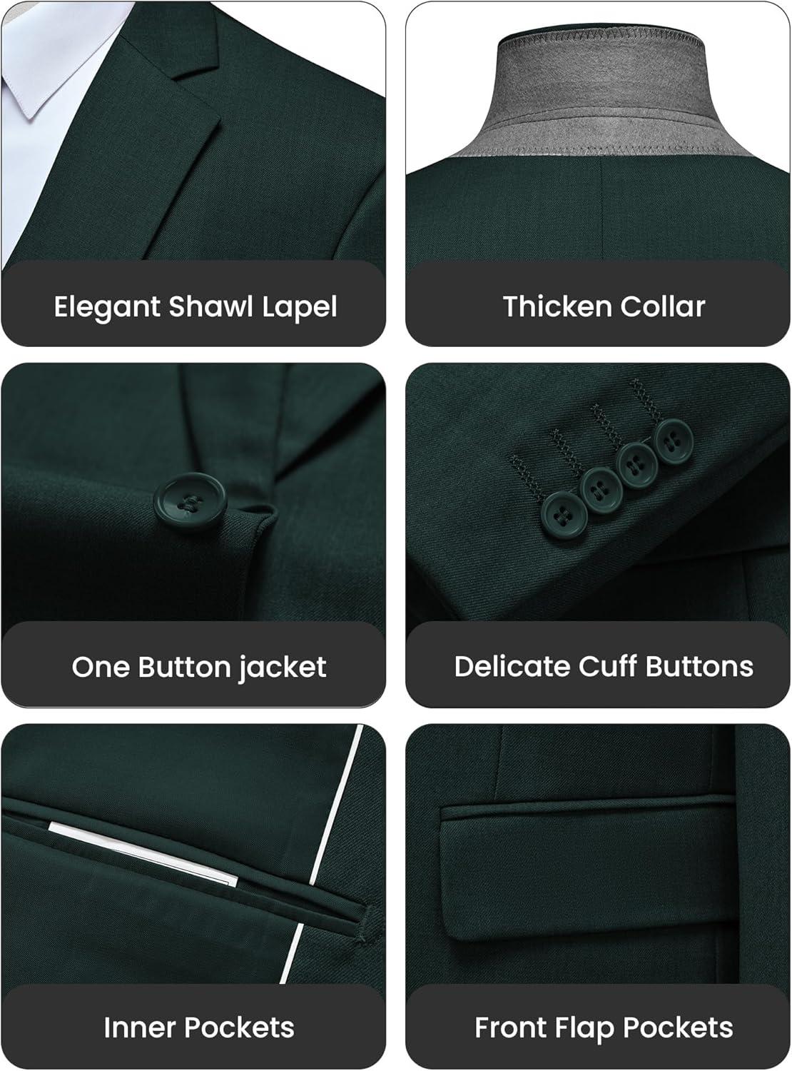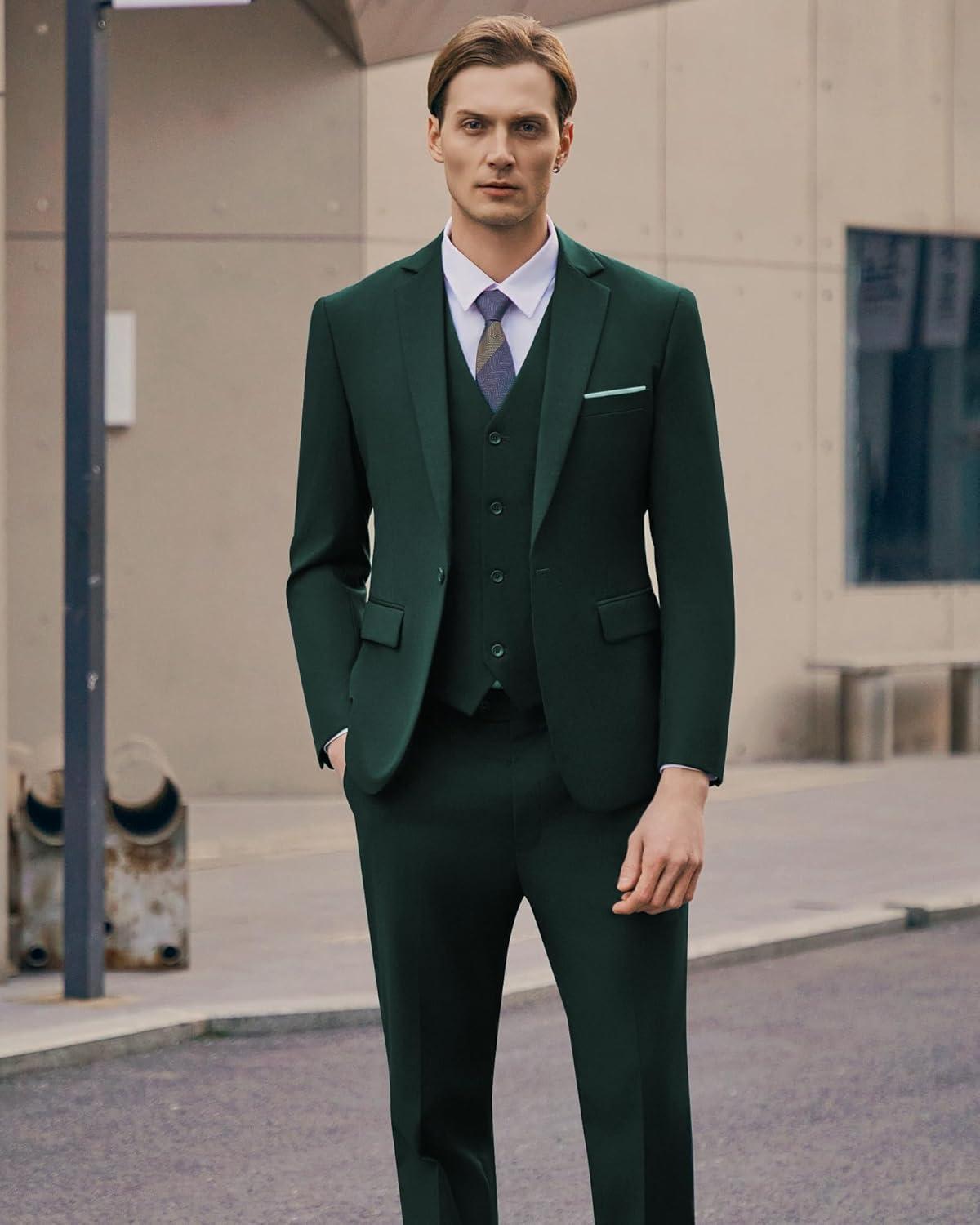WULFUL Men’s Slim Fit 3 Piece Suit, One Button Solid Blazer Business Party Jacket Vest Pants Set(Dark Green)