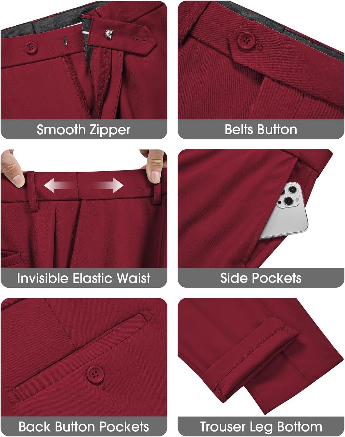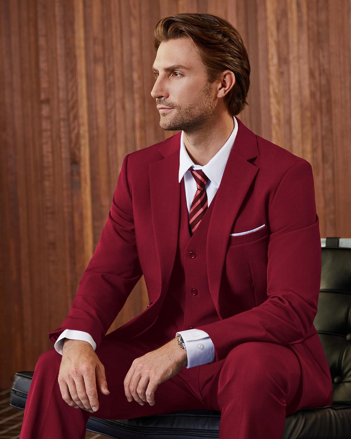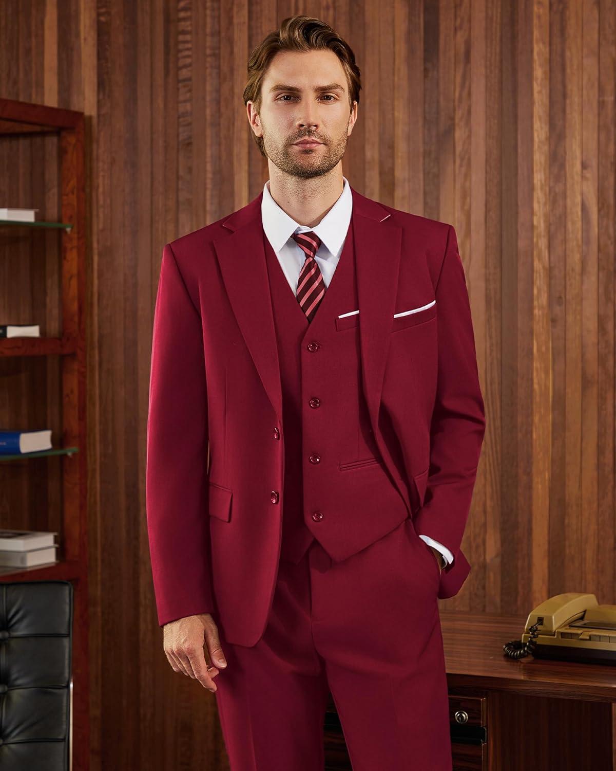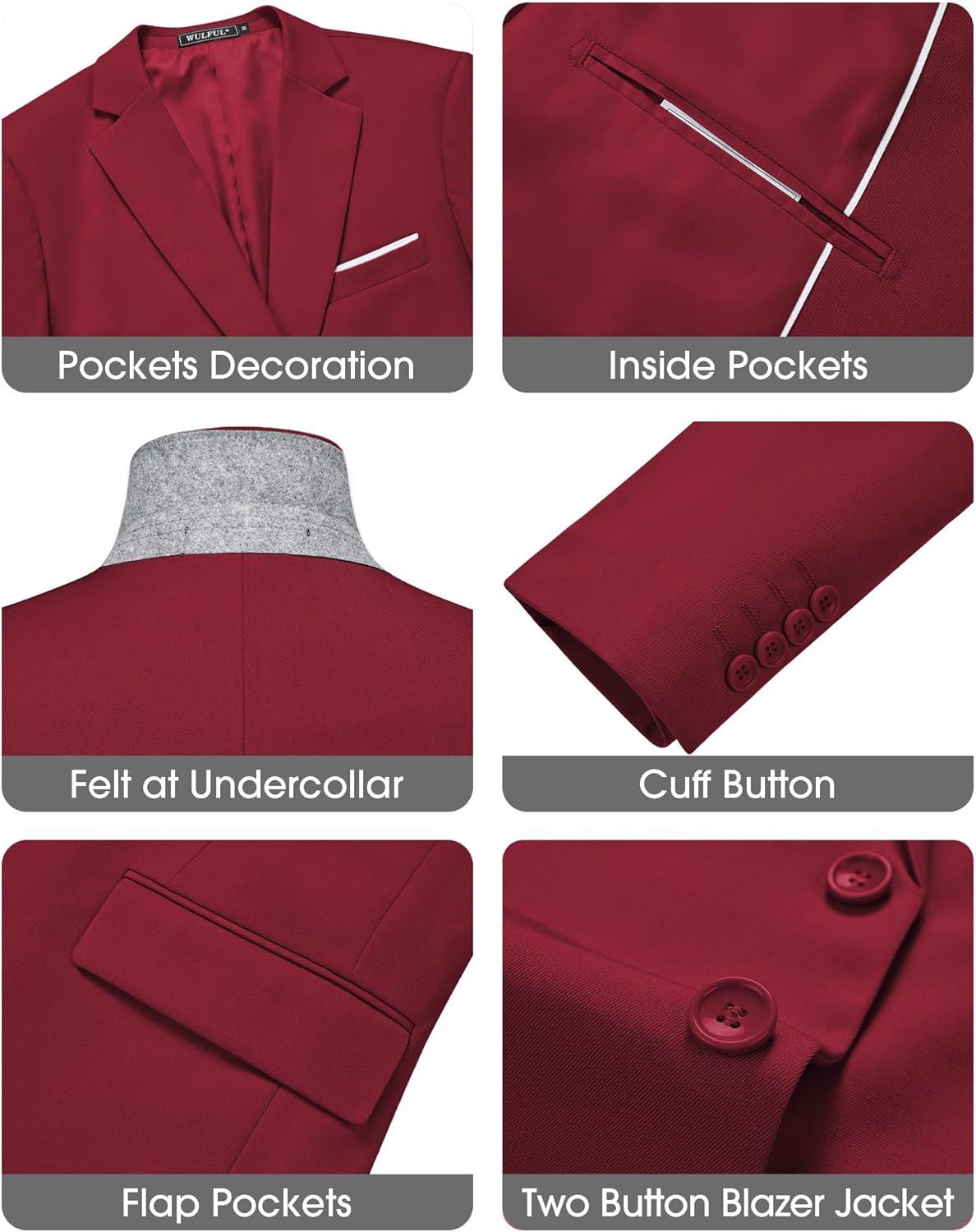 WULFUL Men's Slim Fit 3 Piece Suits Two Button Blazer Vest & Pants Tuxedo Set for Business Wedding Party(Red)