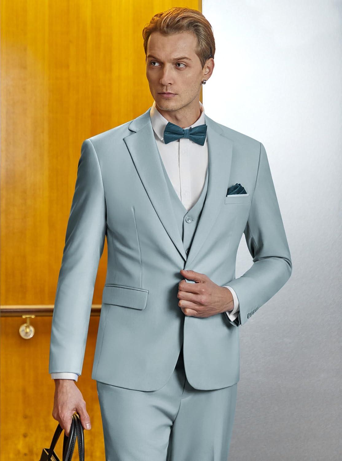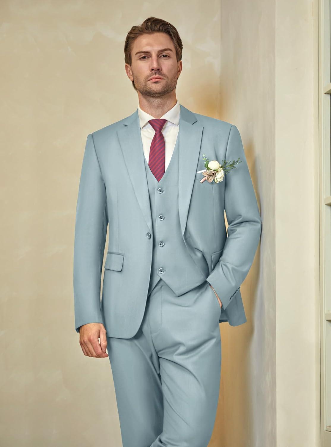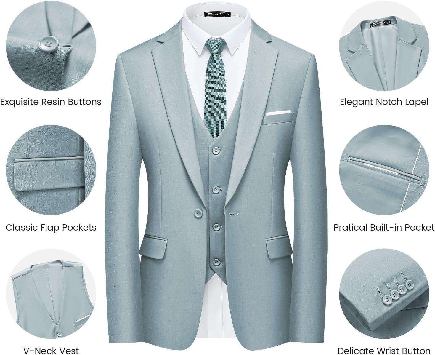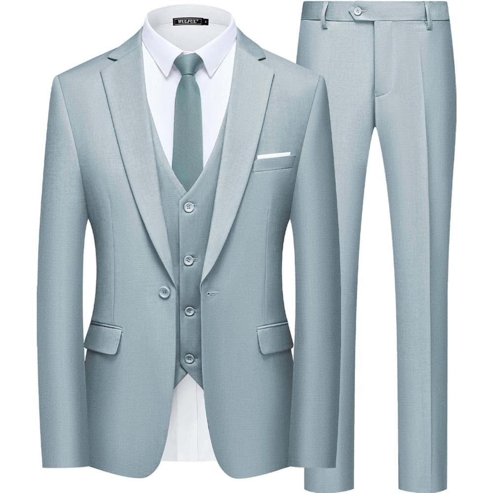 WULFUL Men’s Slim Fit Suit One Button 3-Piece Blazer Dress Business Wedding Party Jacket Vest & Pant(Light Blue-055)