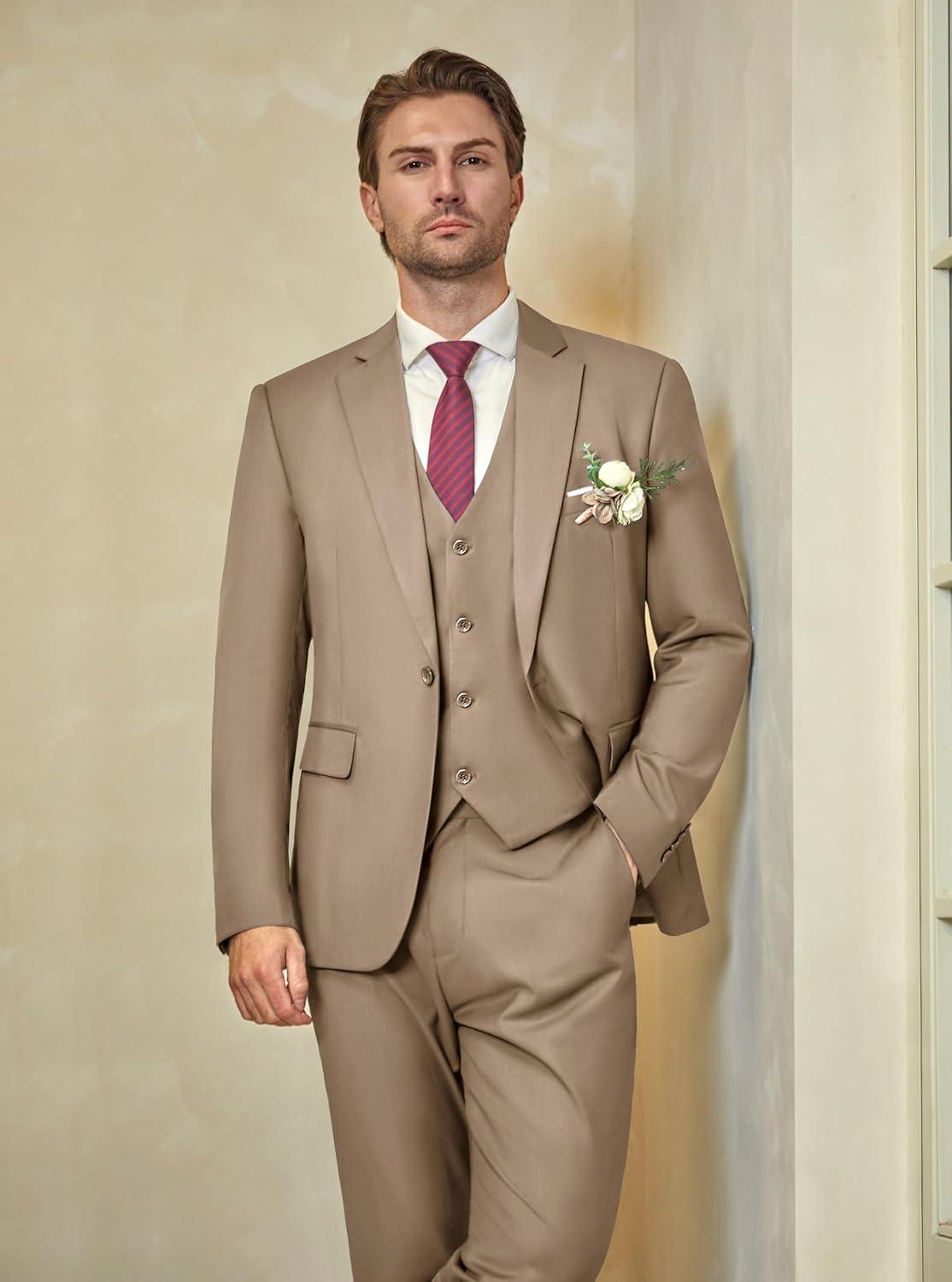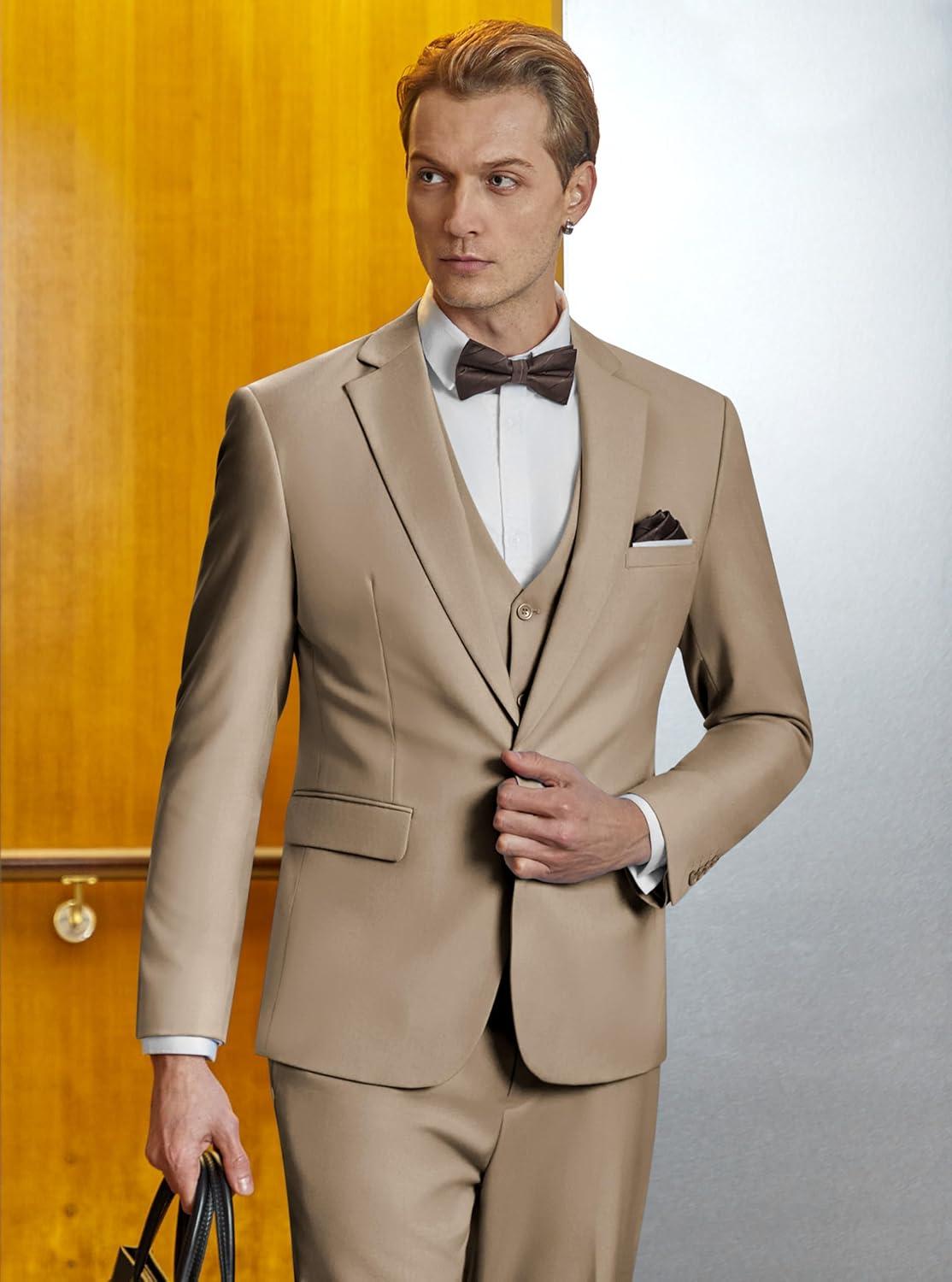 WULFUL Men’s Slim Fit Suit One Button 3-Piece Blazer Dress Business Wedding Party Jacket Vest & Pant(Light Brown)