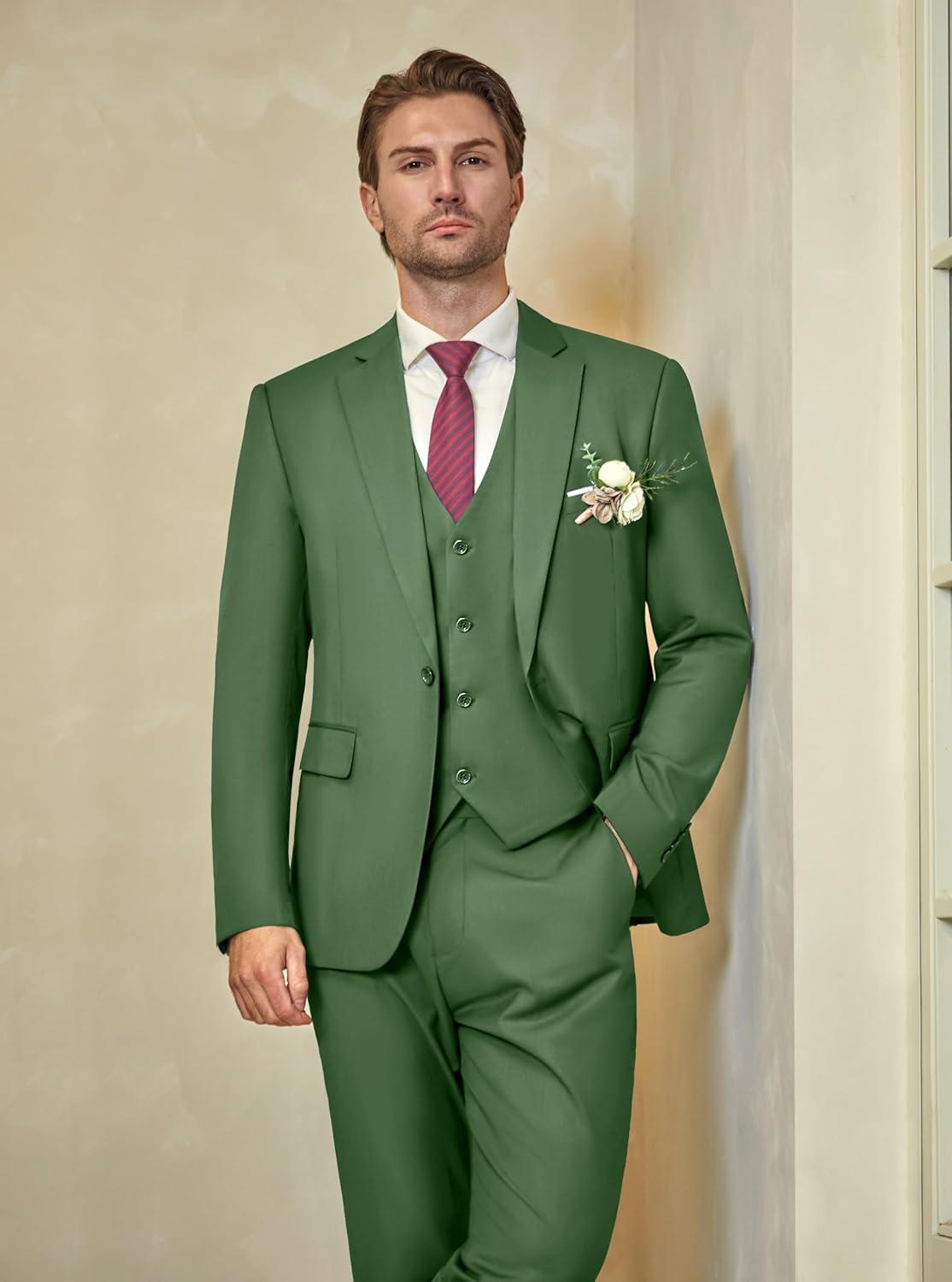 WULFUL Men’s Slim Fit Suit One Button 3-Piece Blazer Dress Business Wedding Party Jacket Vest & Pant(Sage Green-new)