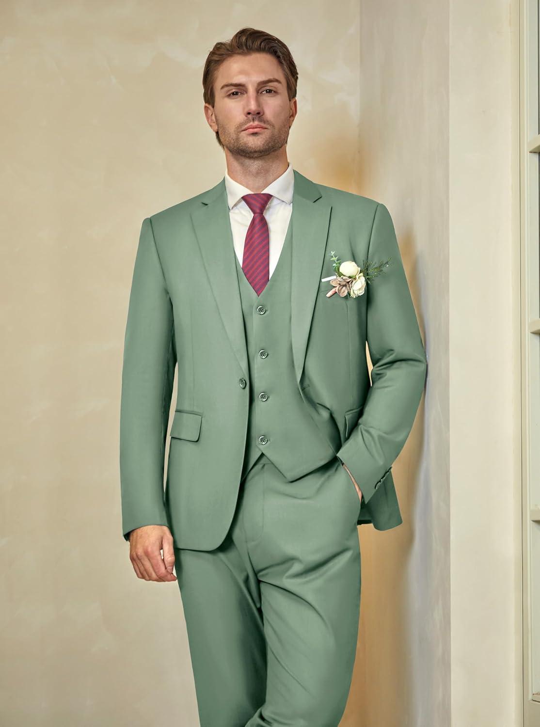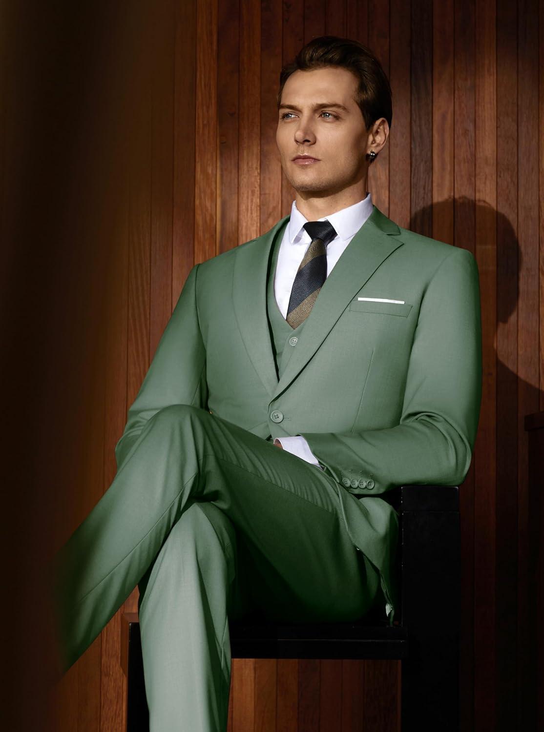 WULFUL Men’s Slim Fit Suit One Button 3-Piece Blazer Dress Business Wedding Party Jacket Vest & Pant(Sage Green-new)