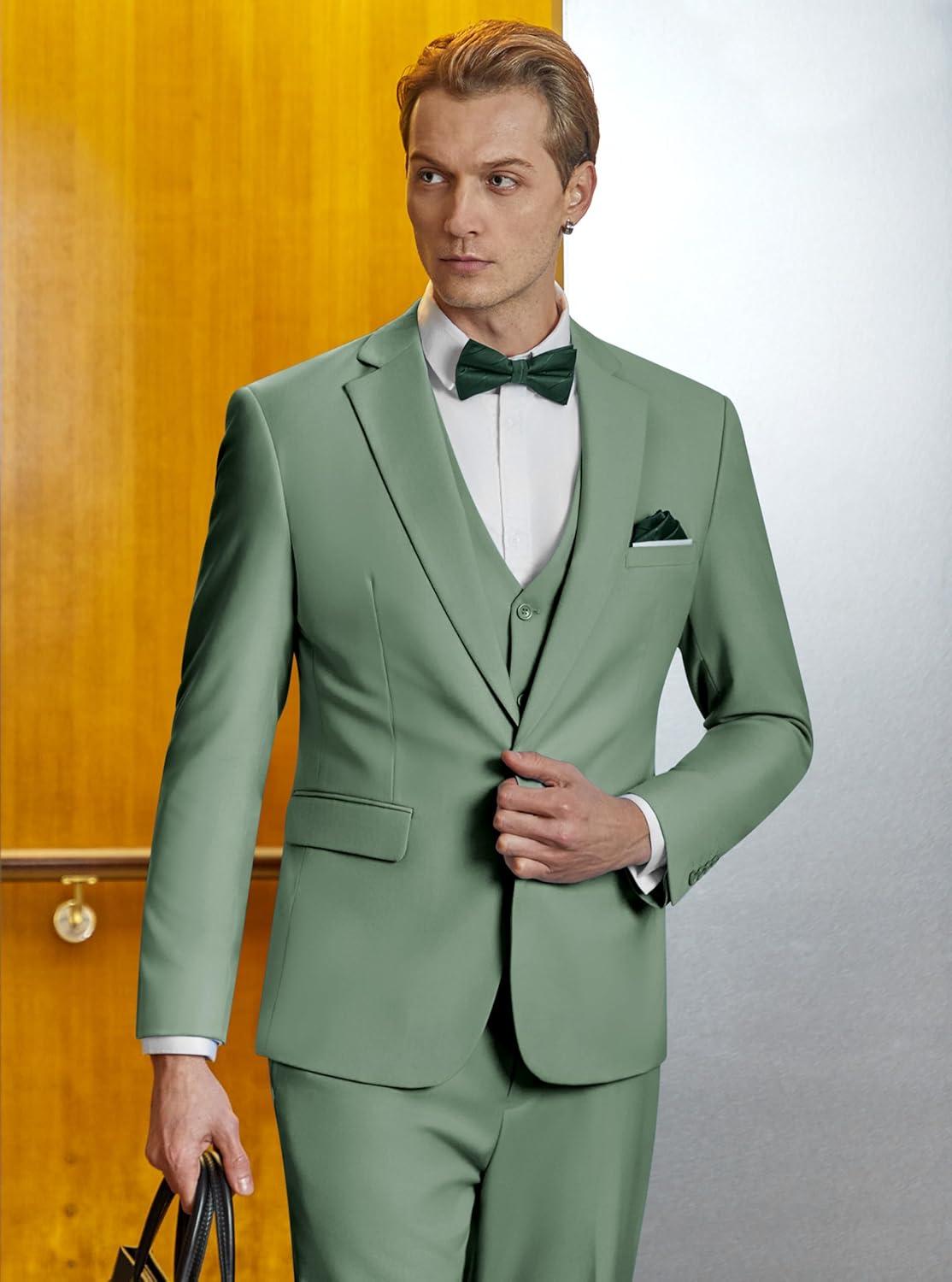 WULFUL Men’s Slim Fit Suit One Button 3-Piece Blazer Dress Business Wedding Party Jacket Vest & Pant(Sage Green)