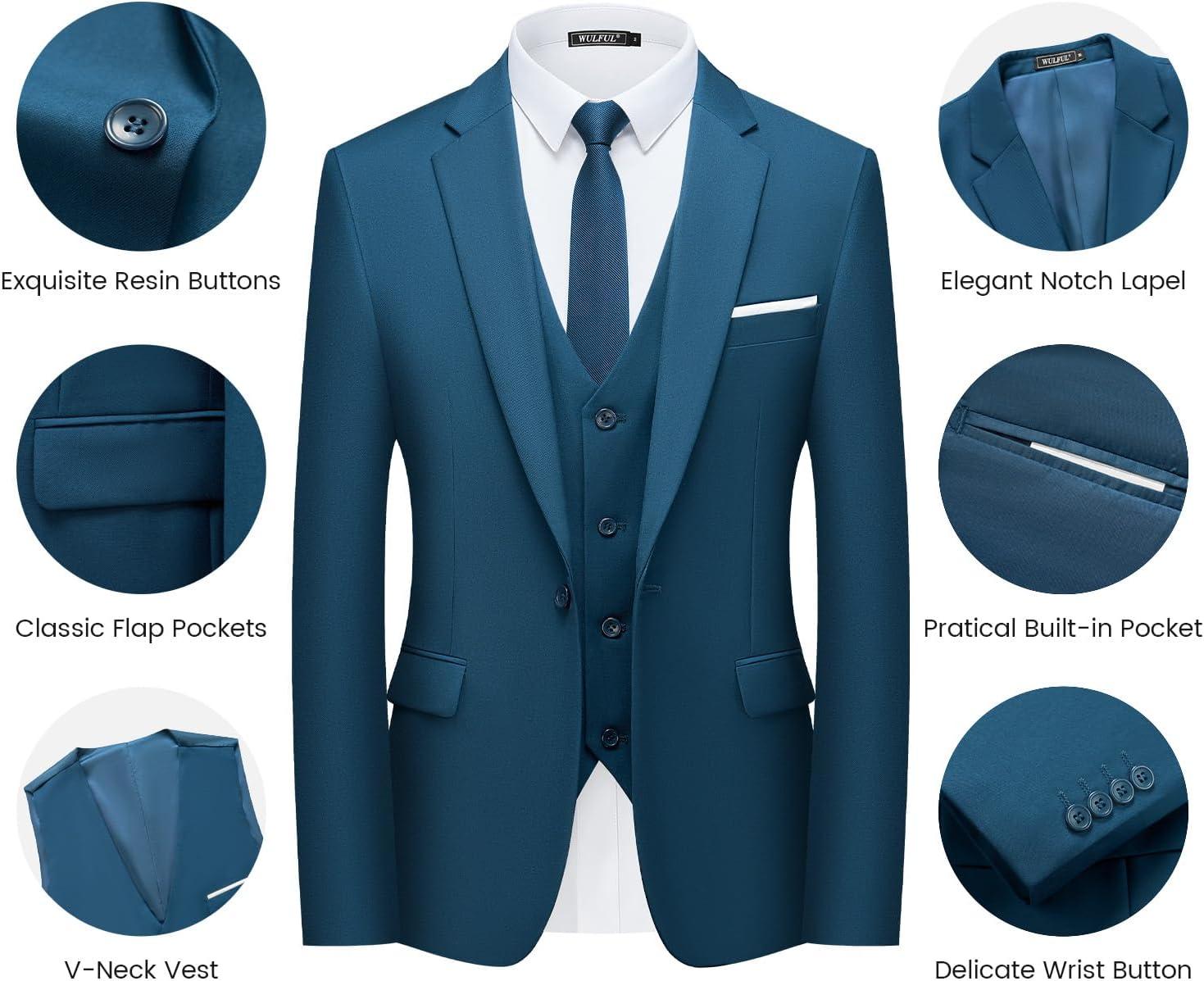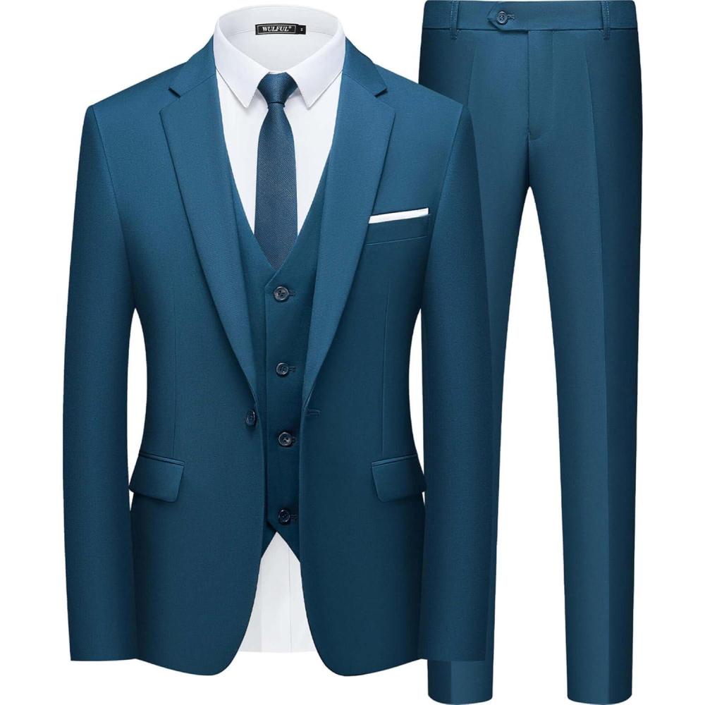 WULFUL Men’s Slim Fit Suit One Button 3-Piece Blazer Dress Business Wedding Party Jacket Vest & Pant(Teal Blue)