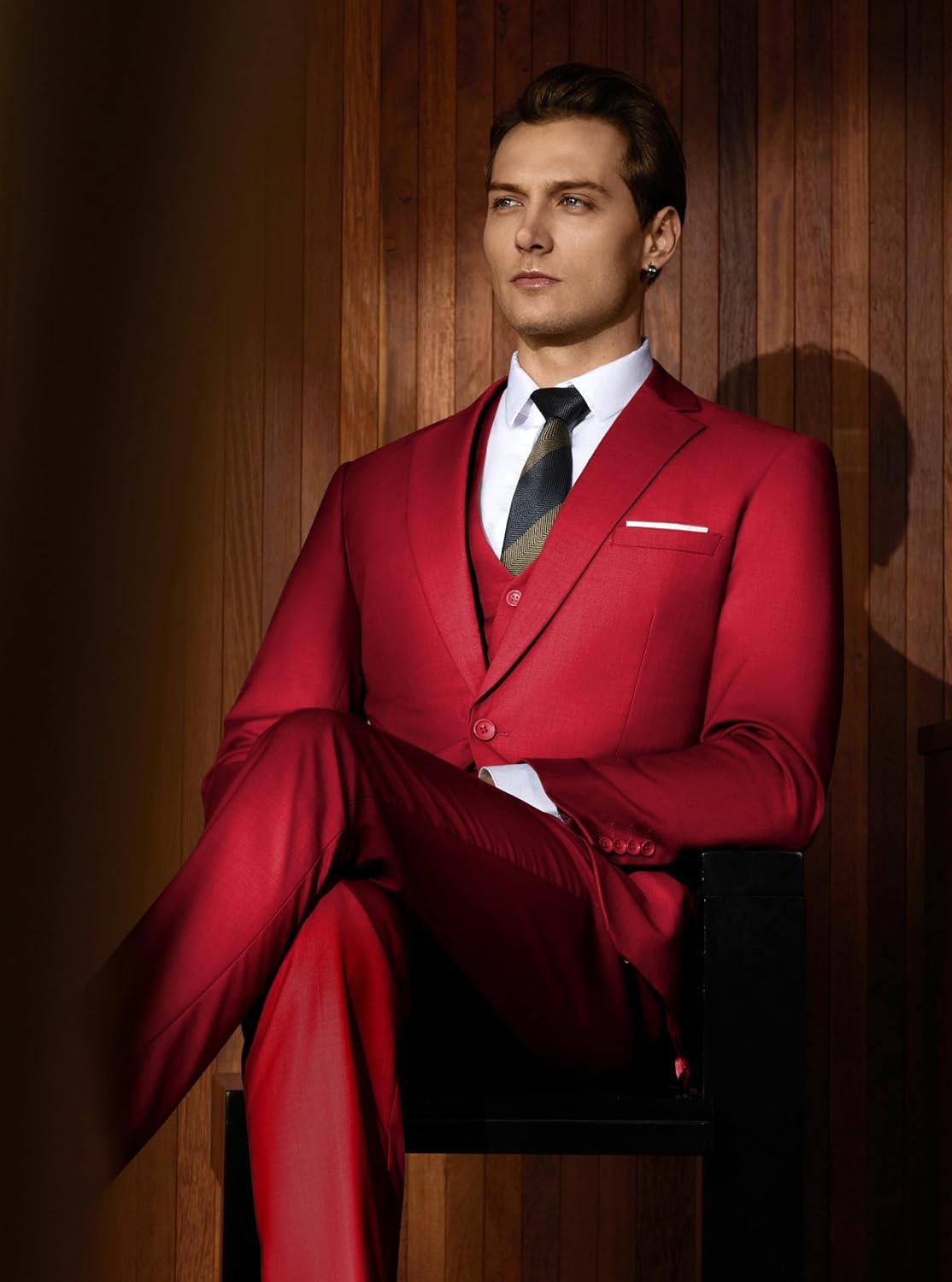 WULFUL Men’s Slim Fit Suit One Button 3-Piece Blazer Dress Business Wedding Party Jacket Vest & Pant(Wine Red)