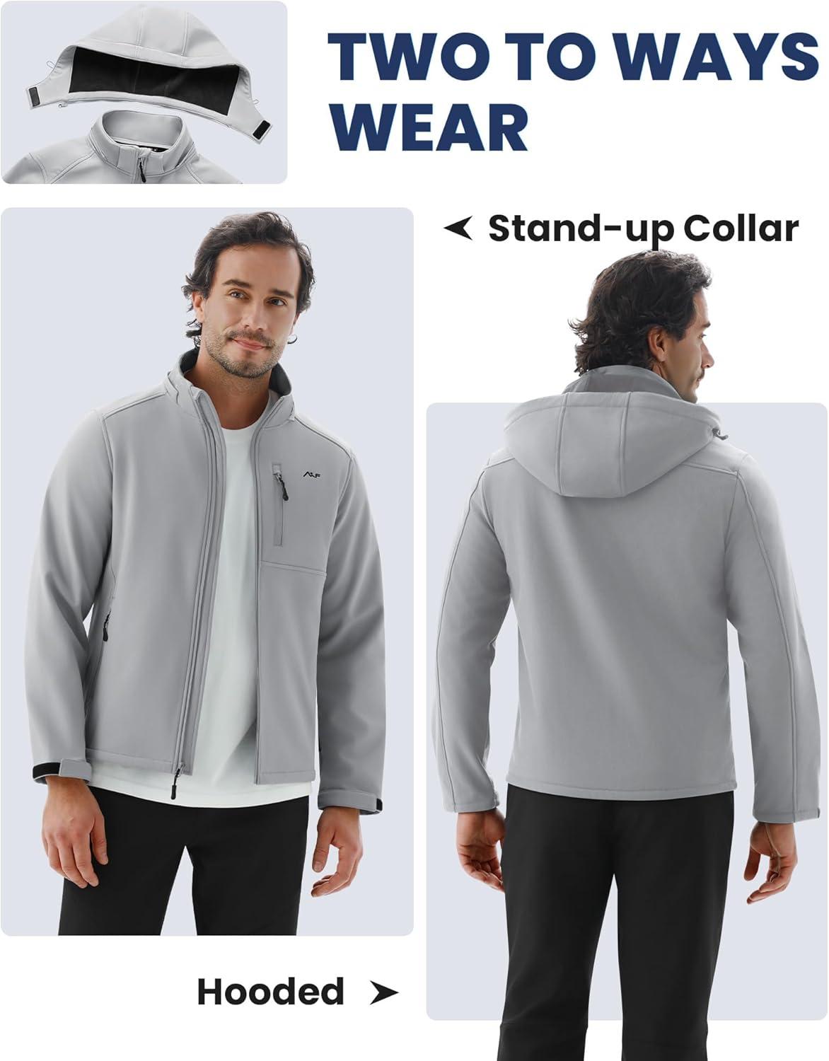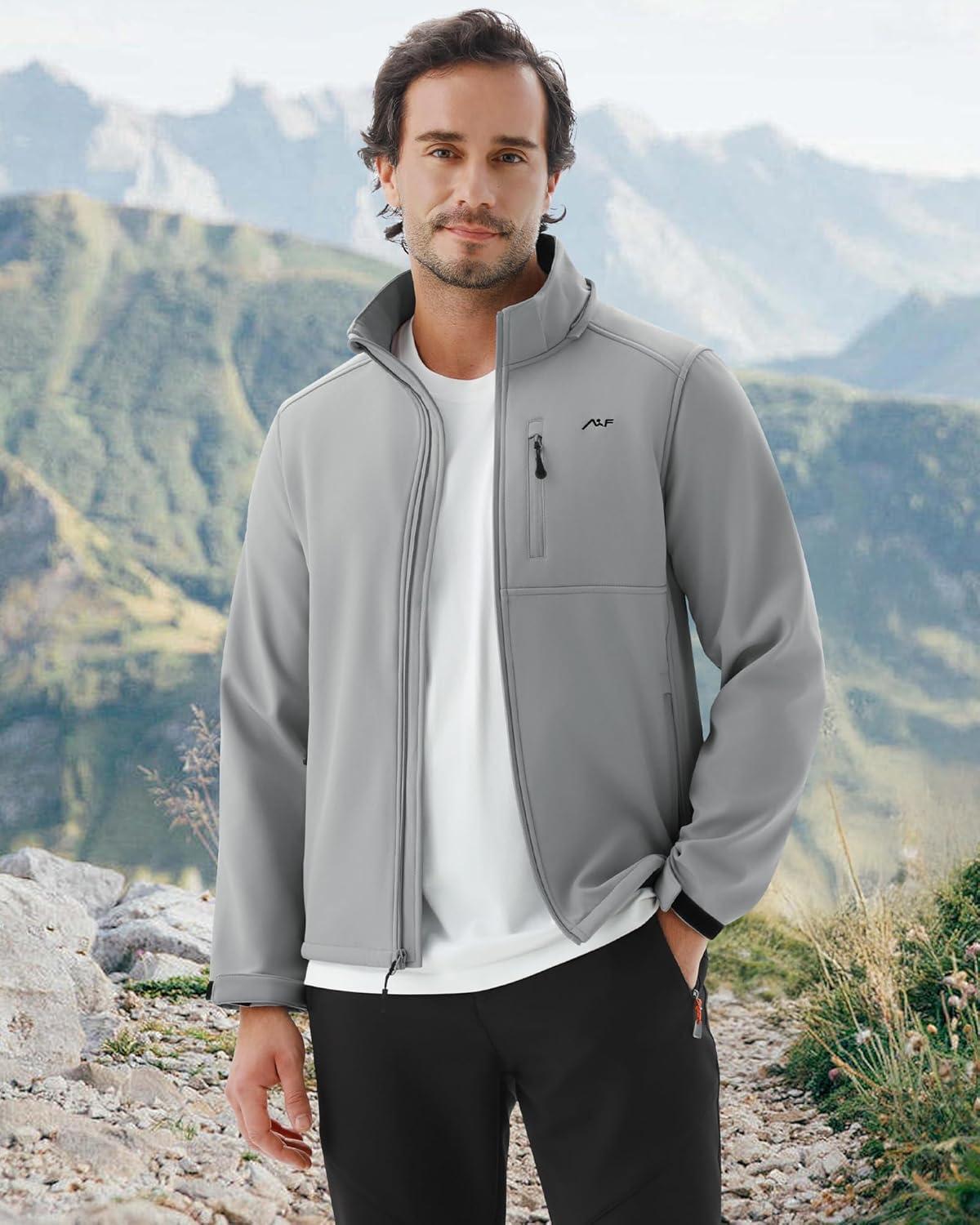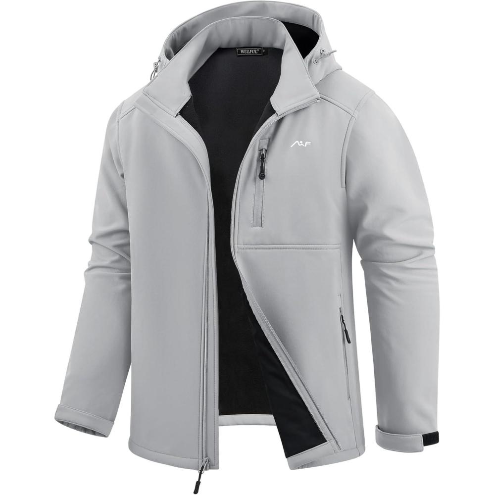 WULFUL Men’s Softshell Jacket Waterproof Lightweight Insulated Windbreaker Fleece Lined Rain Shell Jacket for Hiking Travel(Light Grey)